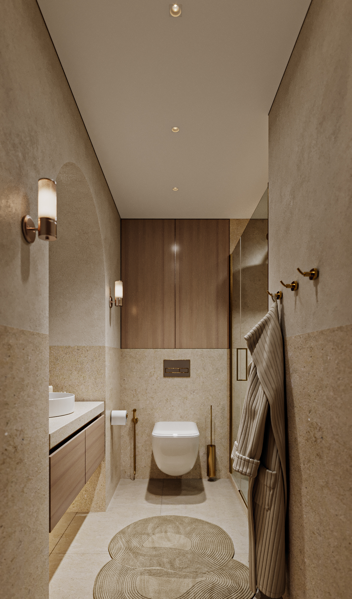 Доминируют мягкие, природные тона — бежевый, песочный, светло-коричневый и теплые оттенки камня. Такая гамма создаёт ощущение спокойствия и чистоты.