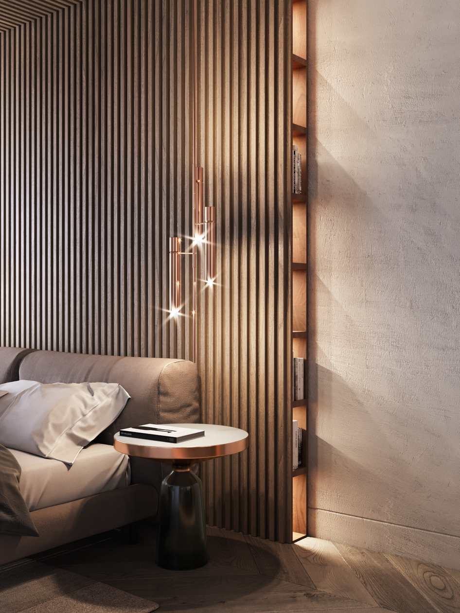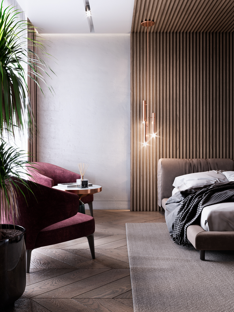 Стены отличные. Кровать похожа на замшу но чутка недоработали. У подушек станный мат, похоже на шелк но не он. тоже самое касаеться простыни. Паркет слишком забамплен и наверное много лака... что то одно нужно убрать. В остальном отлично, хорошая работа и диз