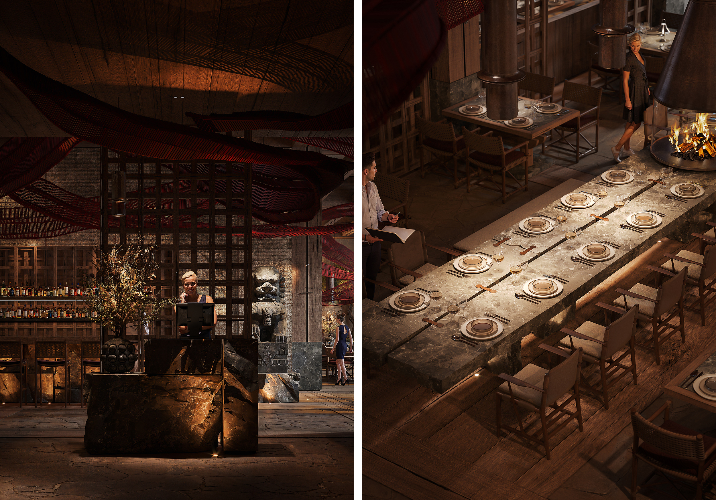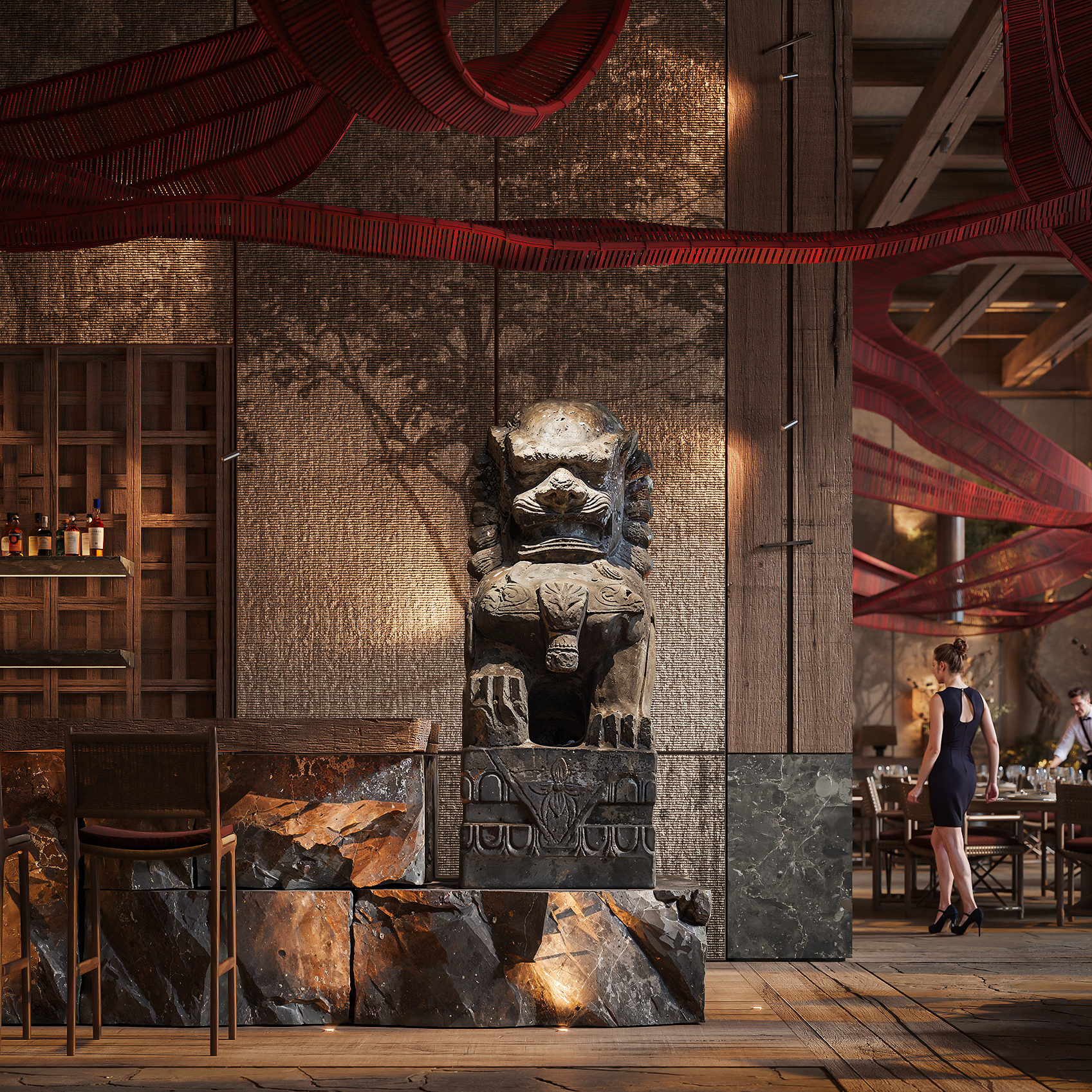 FENG YIN is a dining stage where wind becomes form. A sculptural crimson ribbon drifts across timber grids and stone, tracing a calligraphic line that binds reception, bar, main hall and the open kitchen. The palette is restrained—charred wood, dark stone, patinated metal—so that light and shadow write the atmosphere. Full project