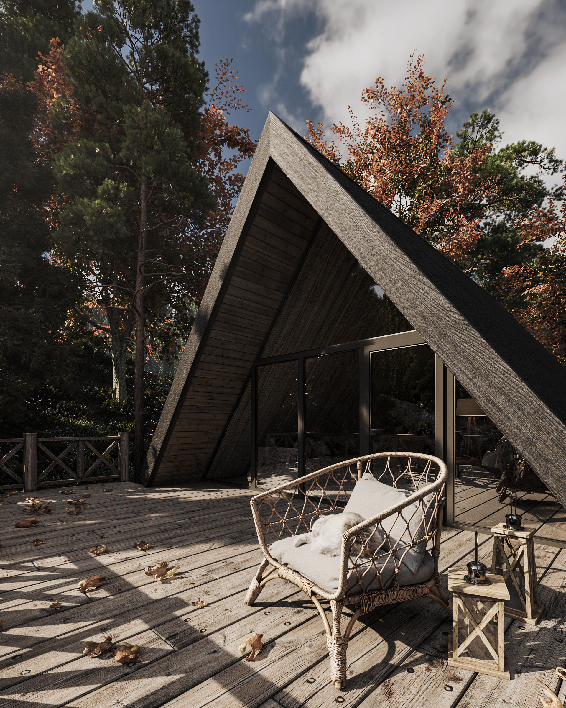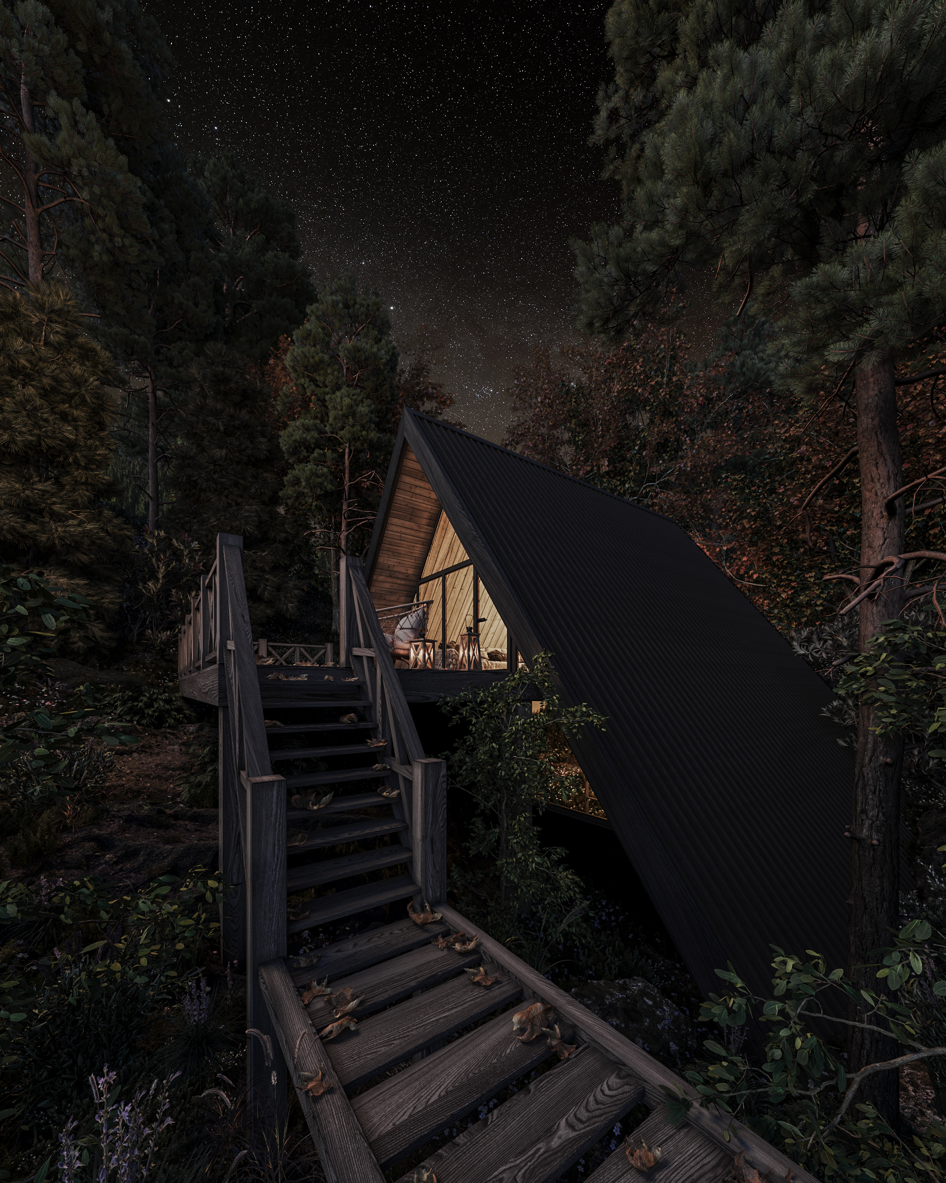 Интерьер и экстерьер небольшого домика в лесу в двух вариантах освещения.