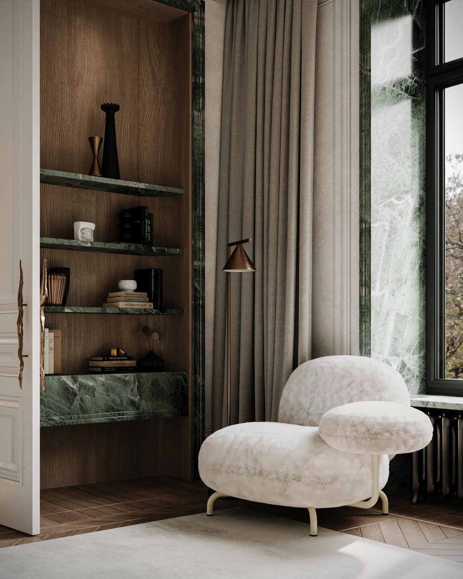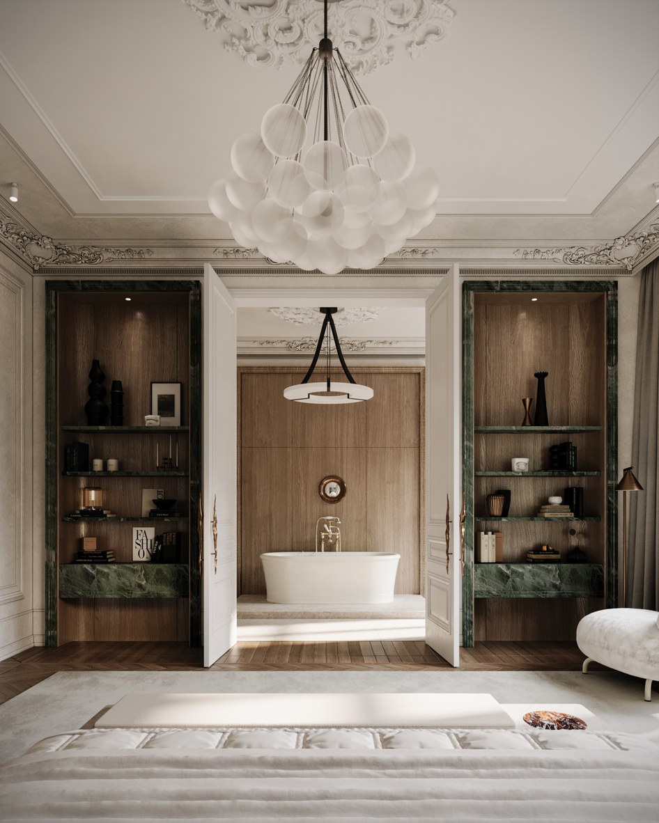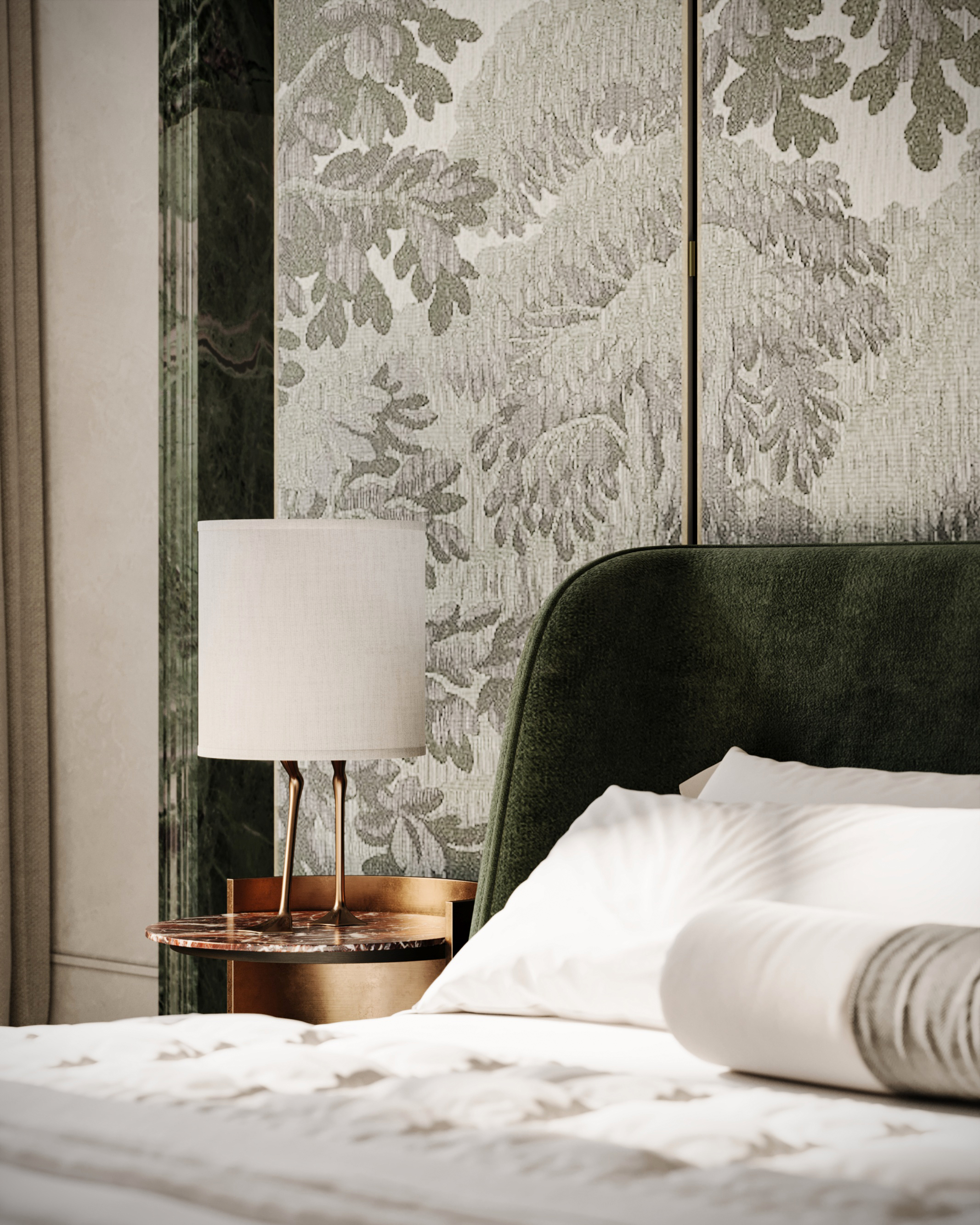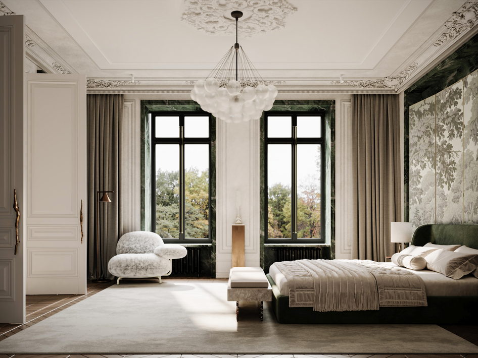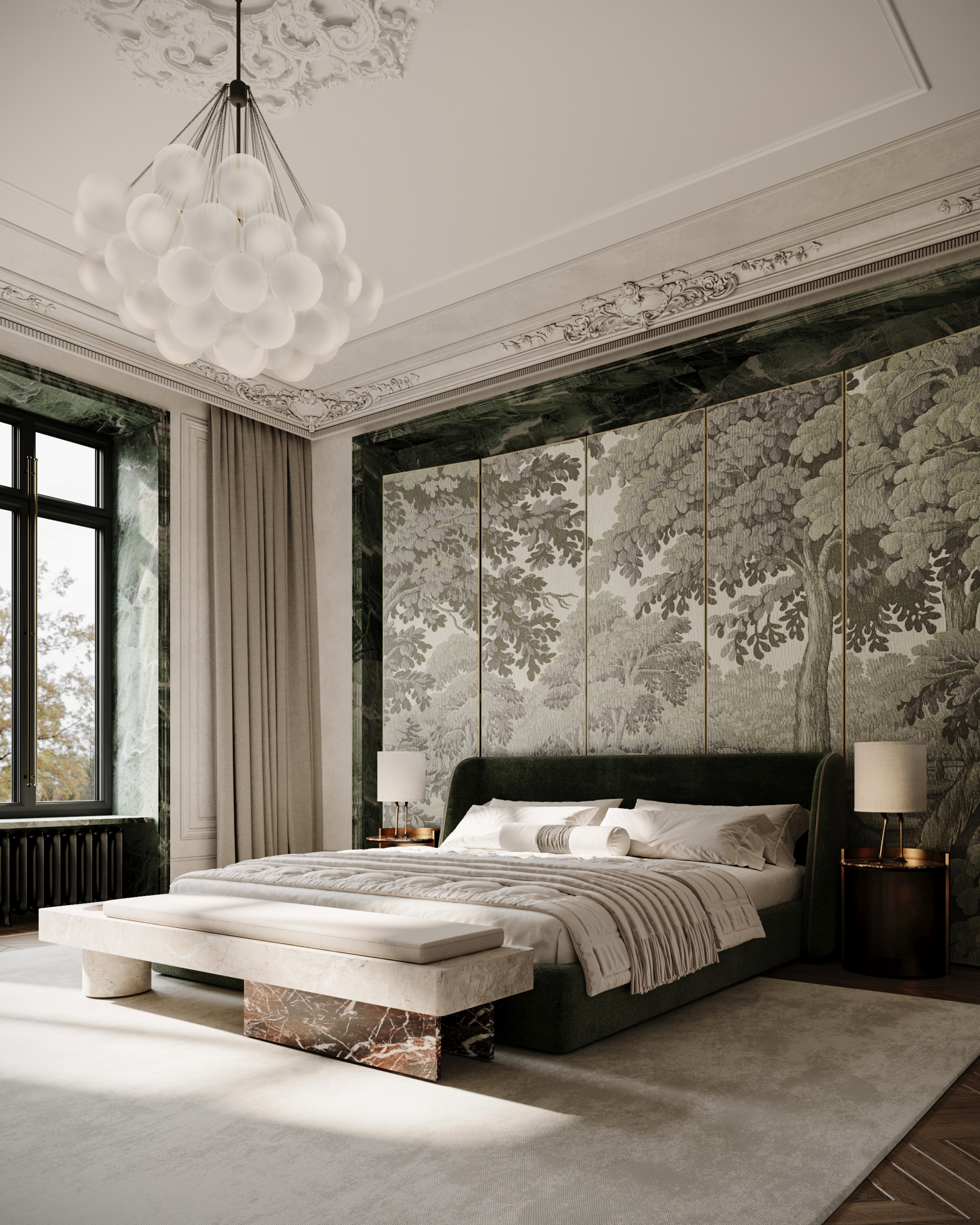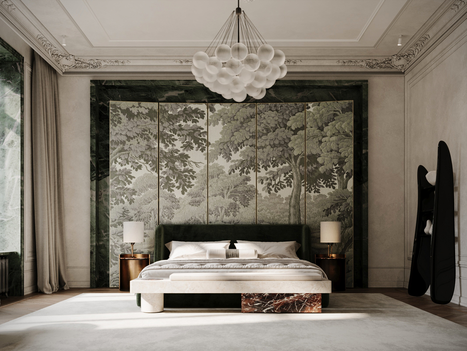 Уютный интерьер мастер- спальни с яркими акцентами и спокойной атмосферой.