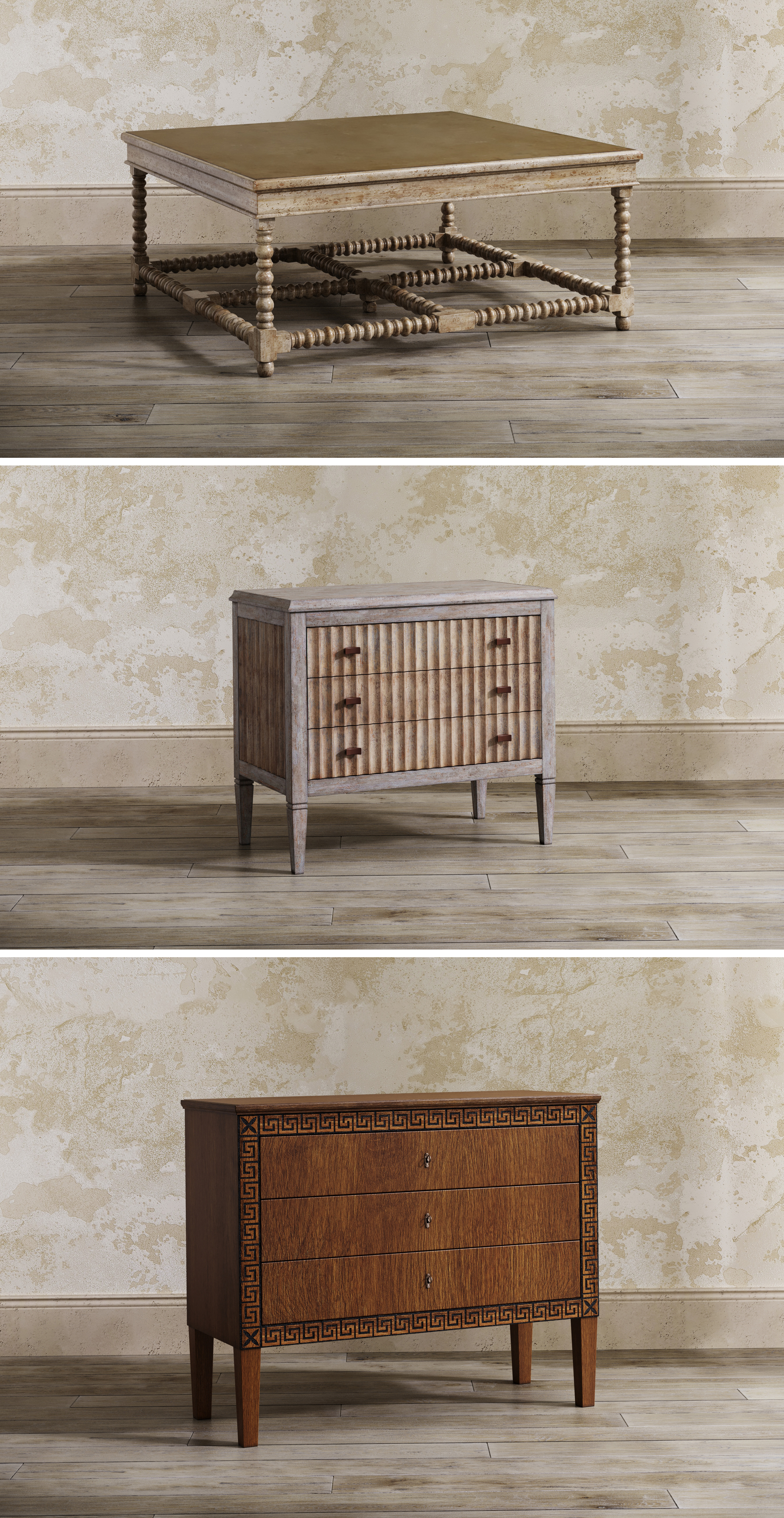 A series of commercial product visualizations showcasing a collection of furniture pieces in a catalog-ready style for e-commerce and marketing purposes.