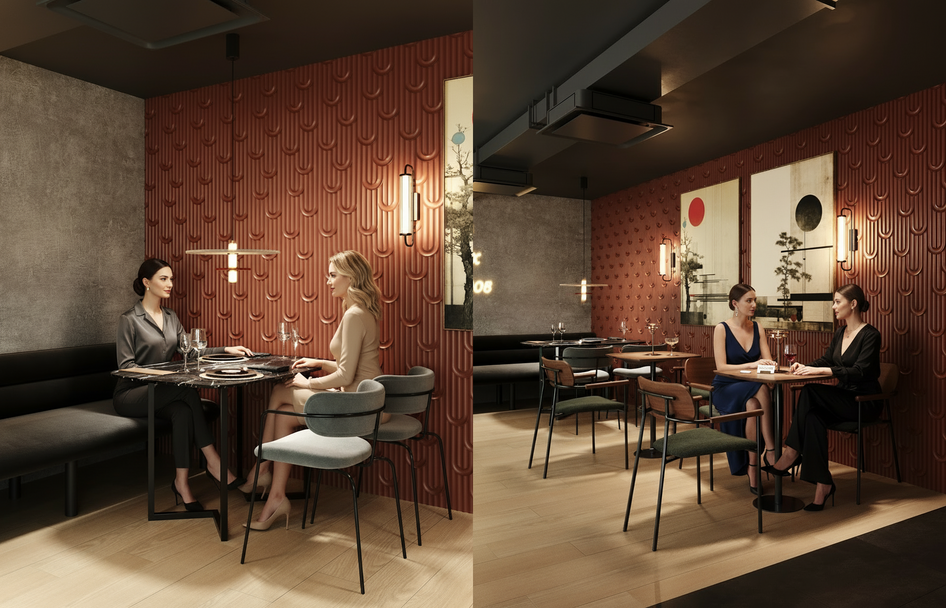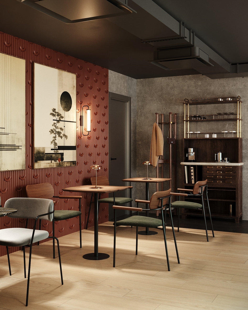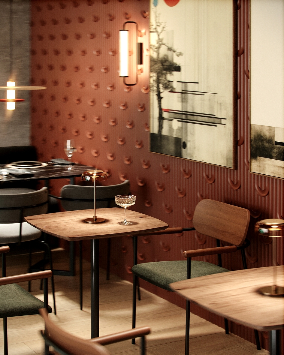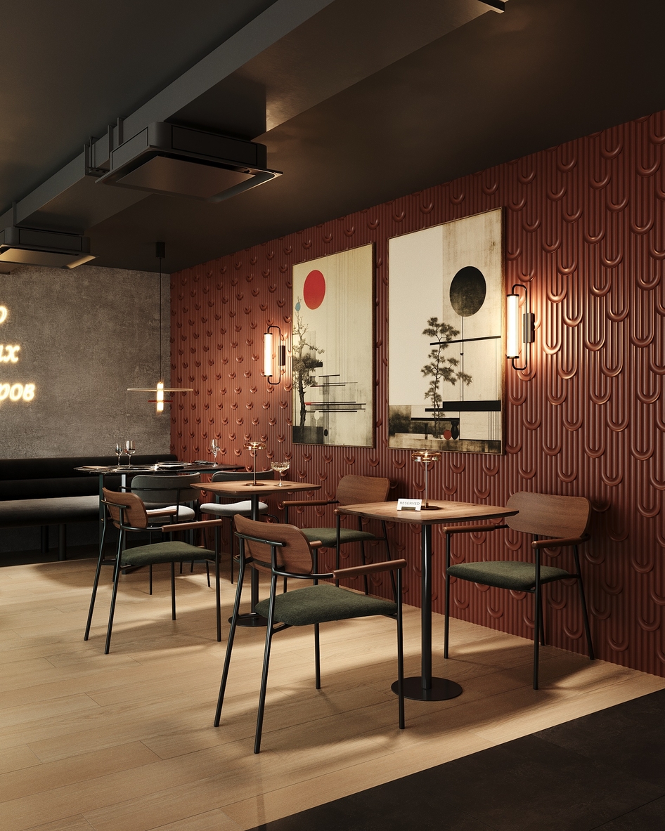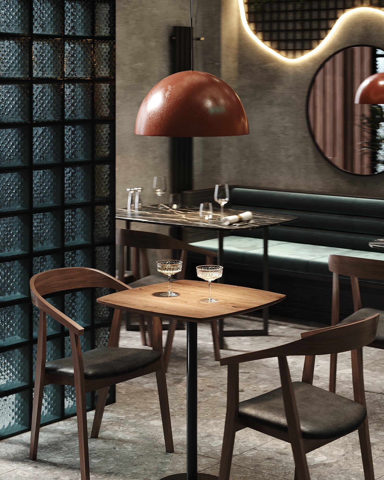 Стулья впритык к стене - так себе решение, будут проблемы с посадкой на место, да и вообще так сидеть не удобно. Столики на одной ножке, тоже не функциональны, ну или их нужно прикручивать к полу.