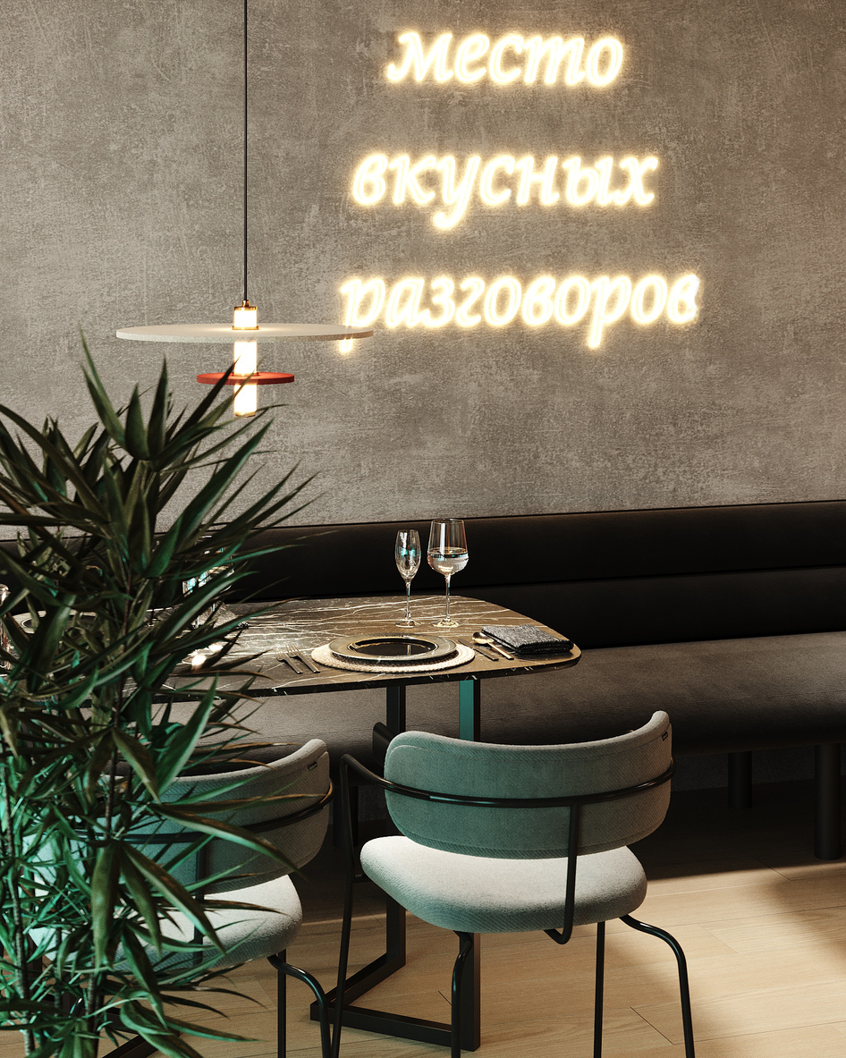 За широким столом стоит два стула в притык, не помню точно сколько должно выделяться места для одного человека, вроде бы 700мм, там их точно нет.