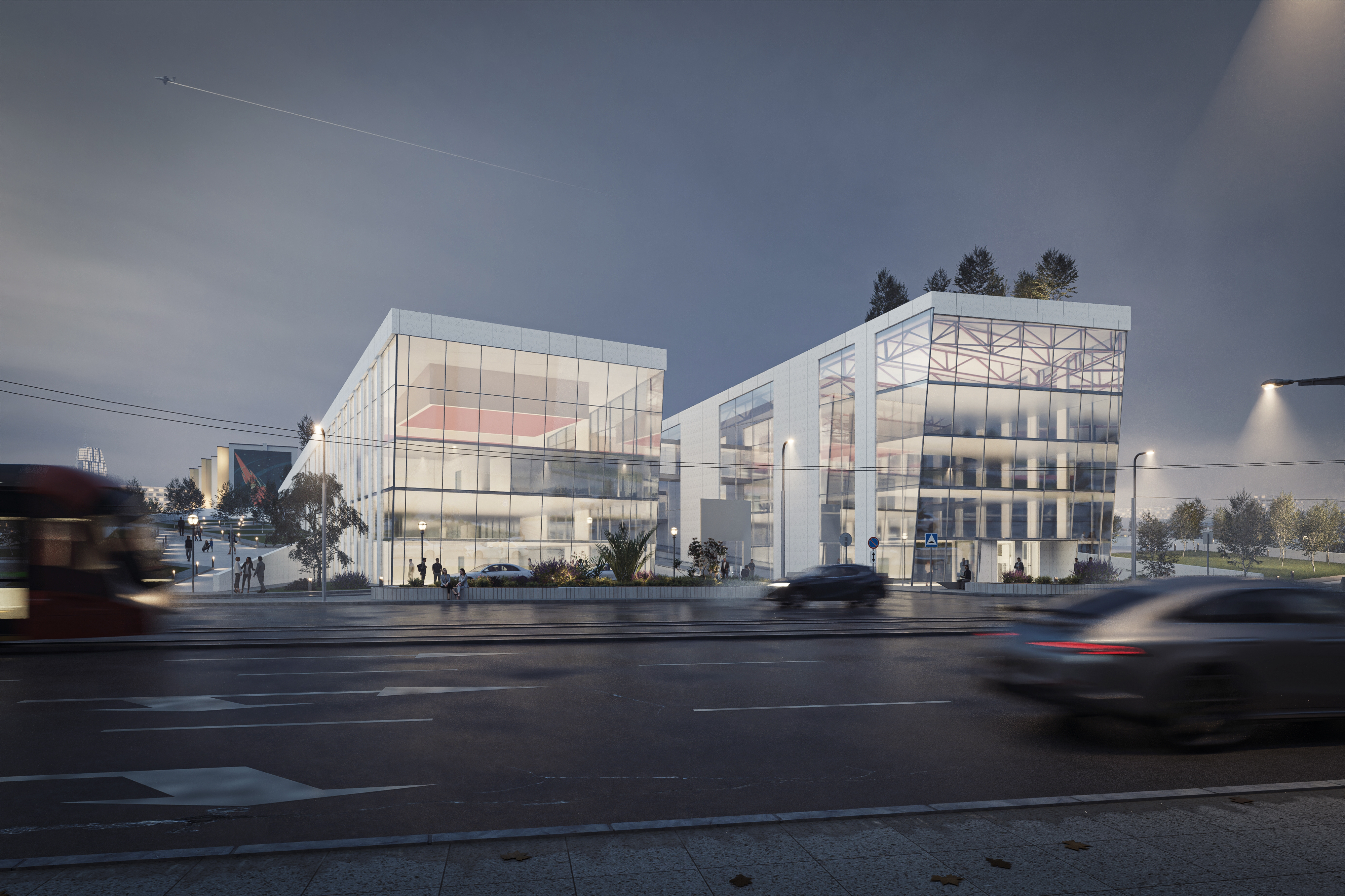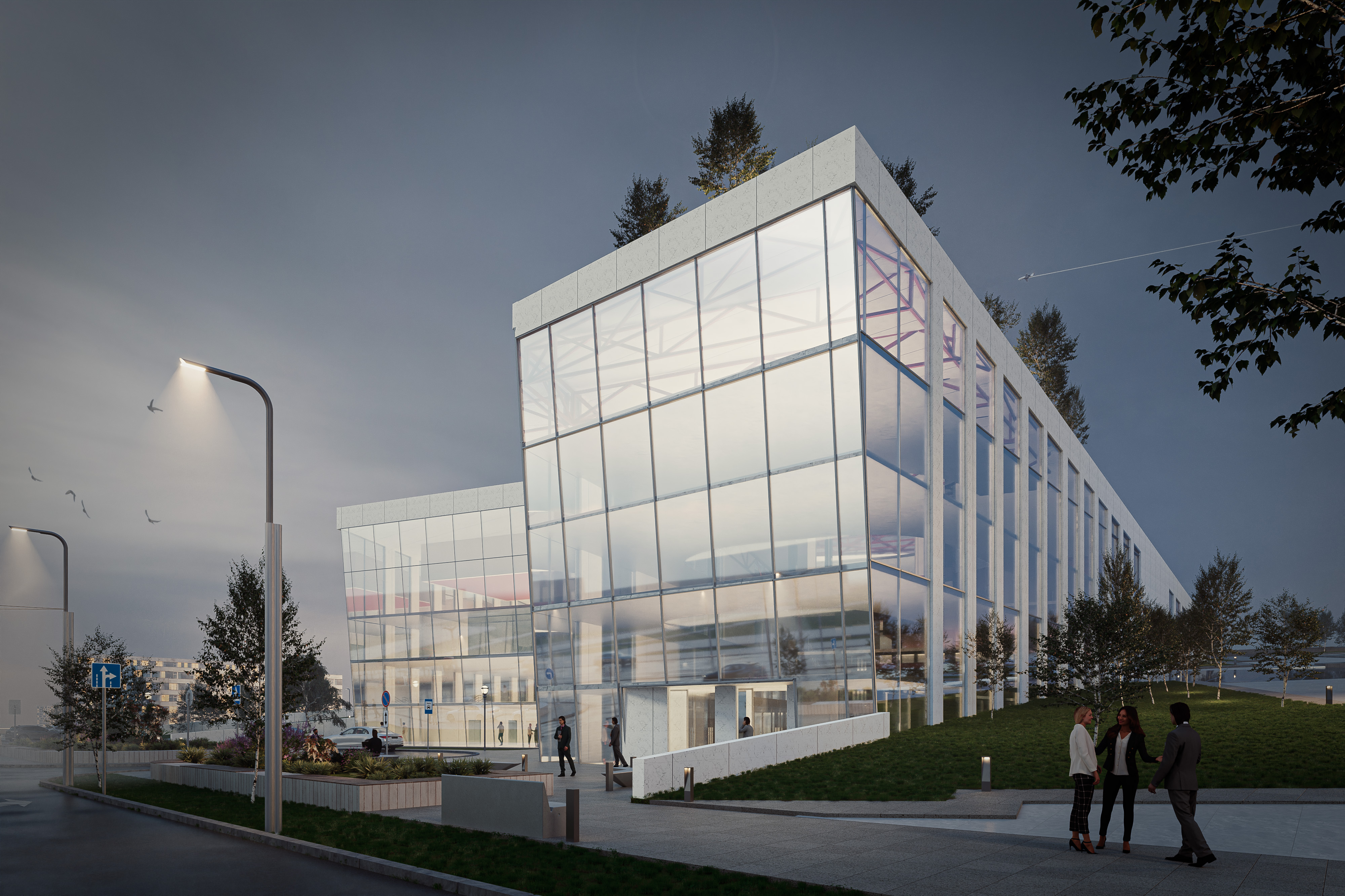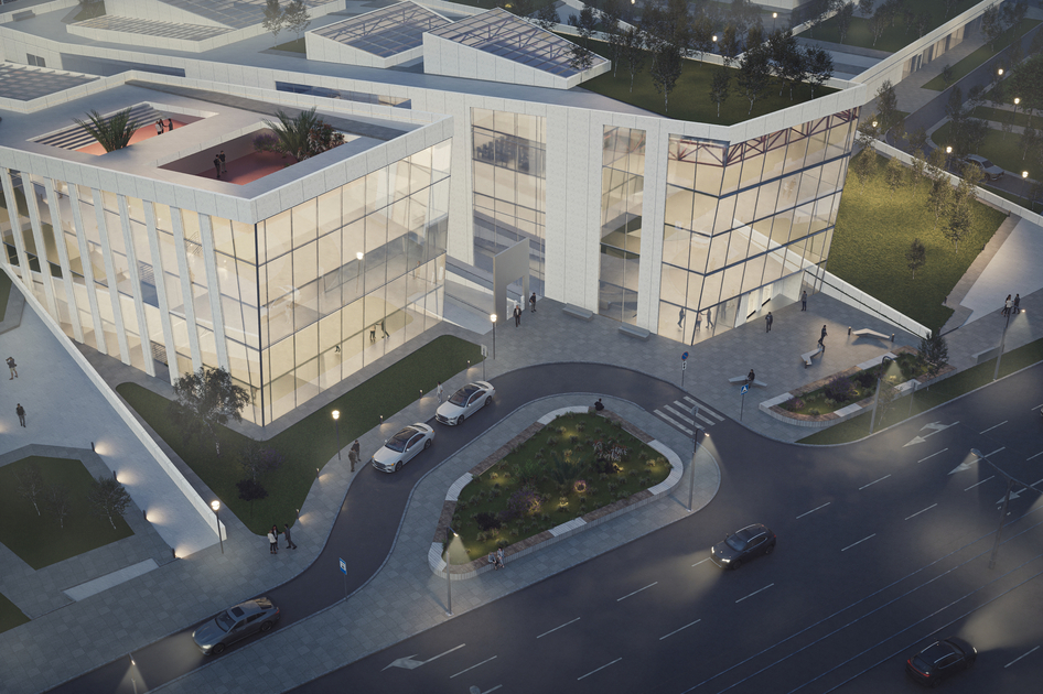 Комплекс подчеркивает принцип архитектуры градостроительного контраста, ориентированный на ландшафт и благоустройство.