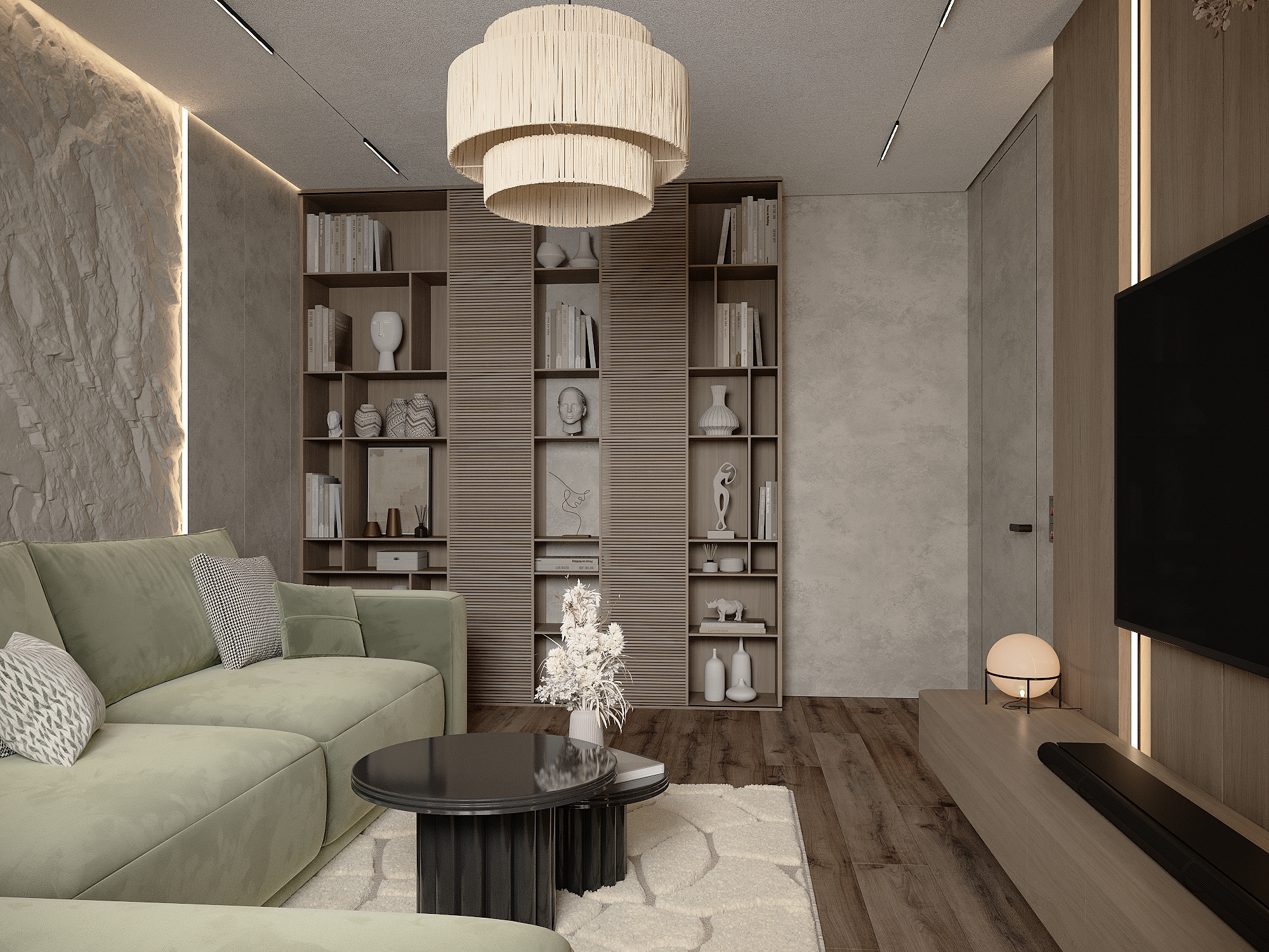 Эта гостиная — про мягкость форм, спокойствие природных оттенков и тактильность. Оливковый диван создаёт уютную зону притяжения, а рельефная стена за ним будто бы уносит нас в каменные пейзажи природы.