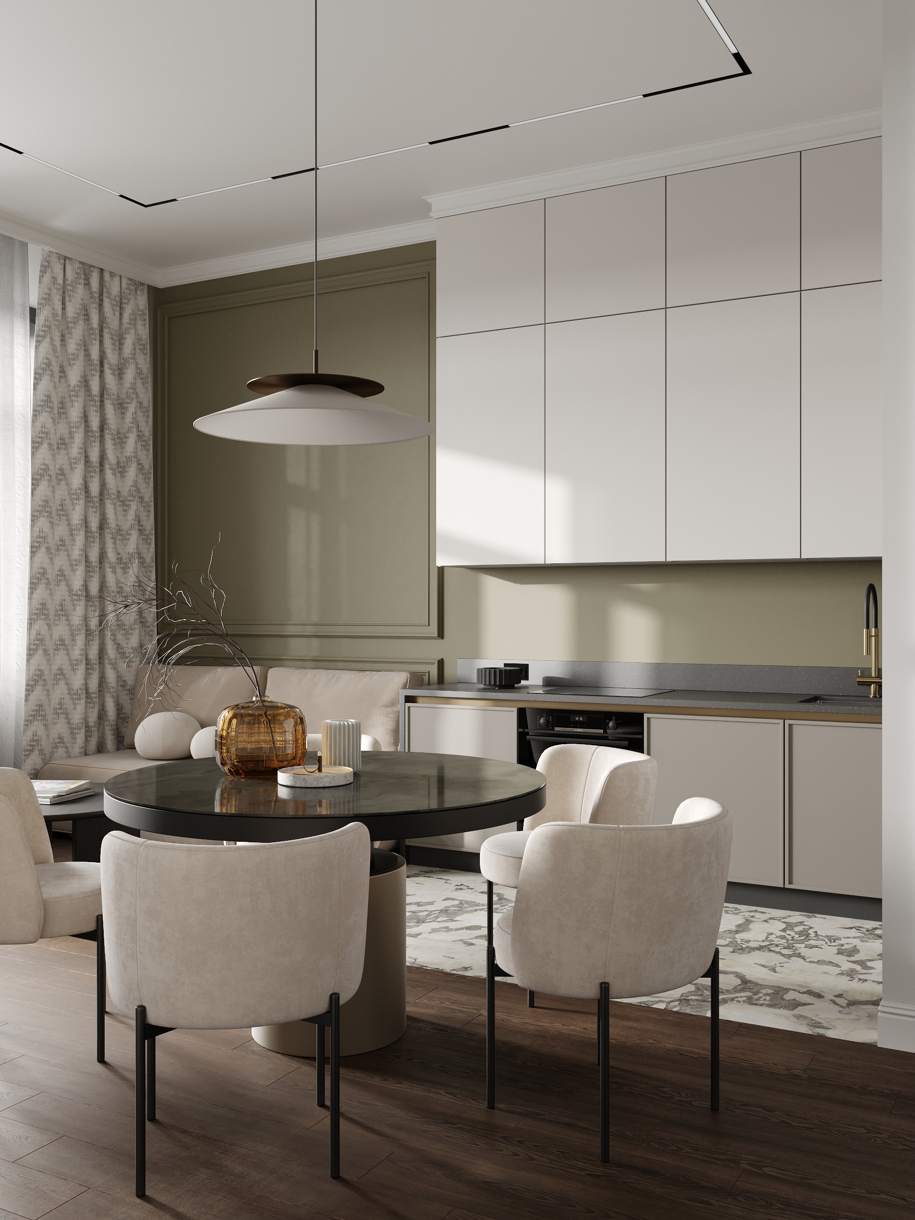 Современная кухня-столовая в нейтральных тонах с элементами минимализма и изысканным декором. Элегантная мебель, мягкое освещение и тёплые акценты создают уютную атмосферу для приёма пищи и общения.