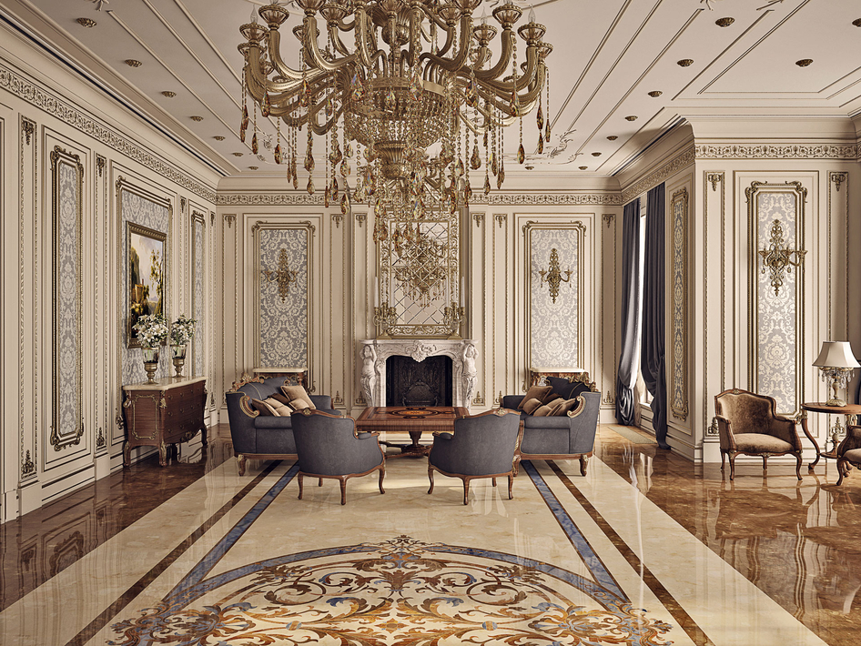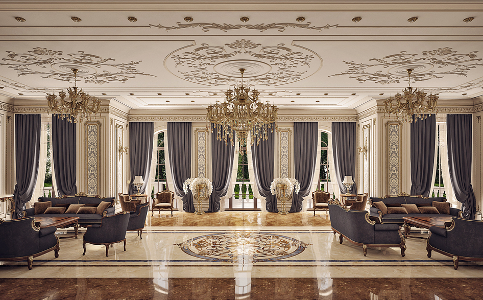 Как-то однообразно, симметрично. Не хватает цветовых и световых акцентов, хотя бы часть света "зажгли", или солнце включили. Свет смотрится плоско, как на отмывке. Декор на столах и камине, горящий свет в камине, горящие бра на стенах существенно оживили бы интерьер.
