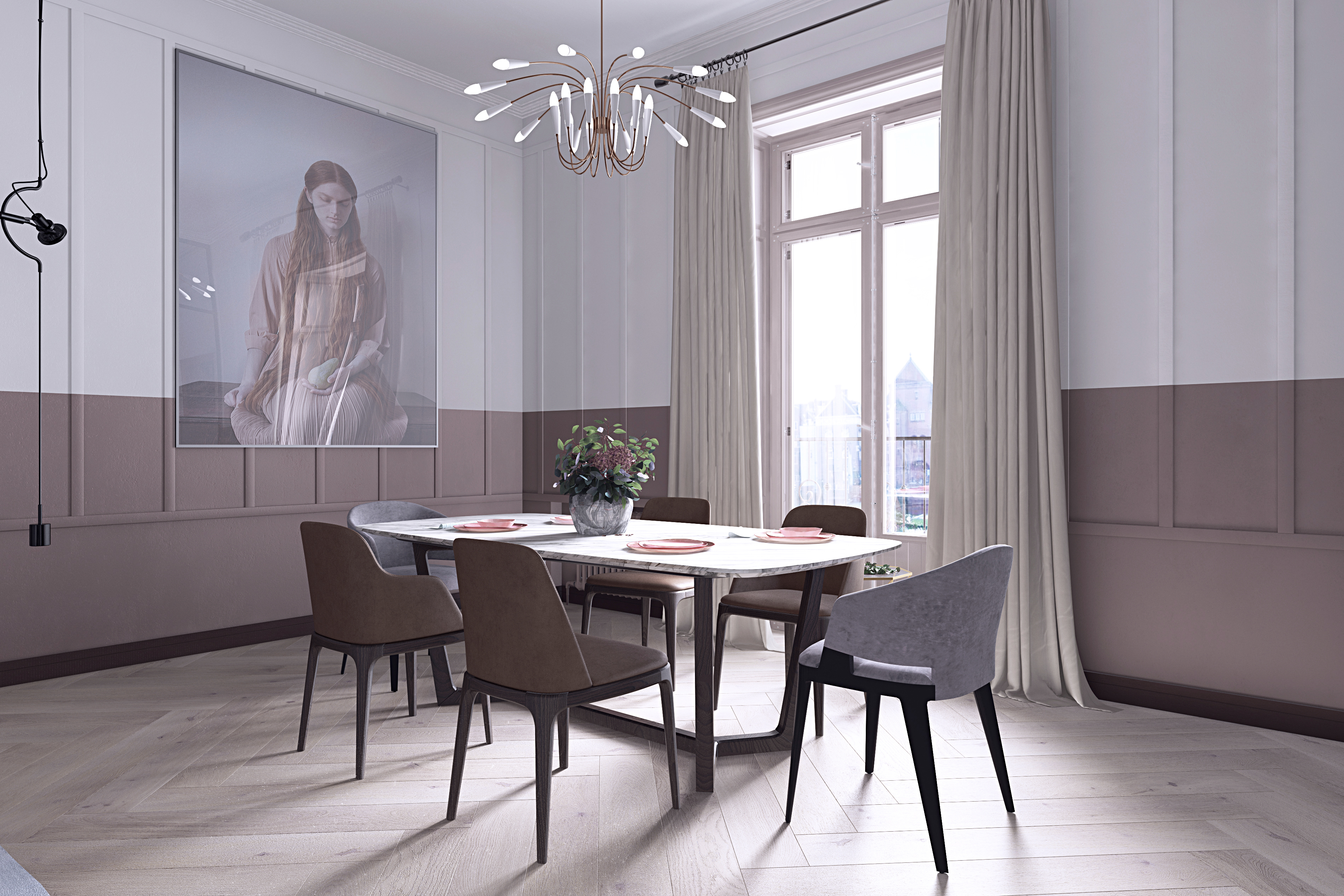 Особенность данной композиции, заключается в том, что цвет лишь оттеняет все предметы мебели в данном интерьере. Занимающий всего лишь 1\3 часть он не перегружает и на мой взгляд не доминирует, но собирает интерьер в единое целое. Вертикали здесь намекают лишь на деление помещения и подчеркивают высоту потолка. Но конечно каждый видит по разному.