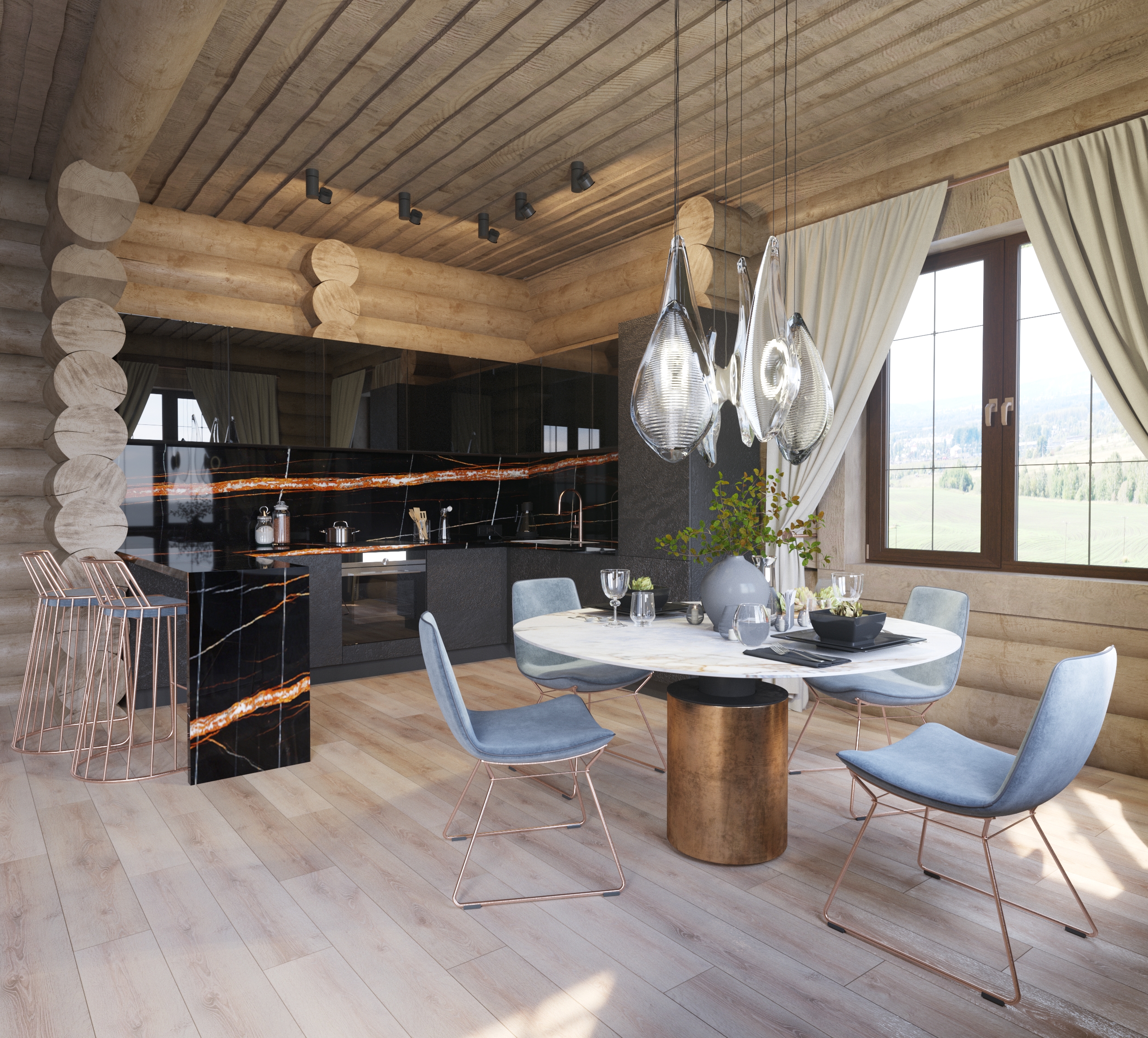 Дизайн совмещенной гостиной и кухни в деревянном доме Визуализация - Детистова Надежда Дизайнер - Рузанна Аветисян