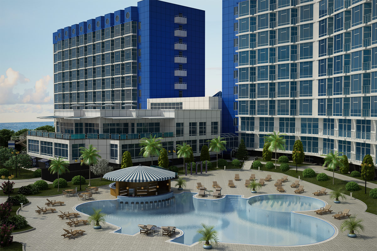 Воду хочется более нсыщенного цвета, да и всю картинку сочнее, солнечнее. Не очень понравился слишком синий цвет фасадов.....А в целом очень неплохо))