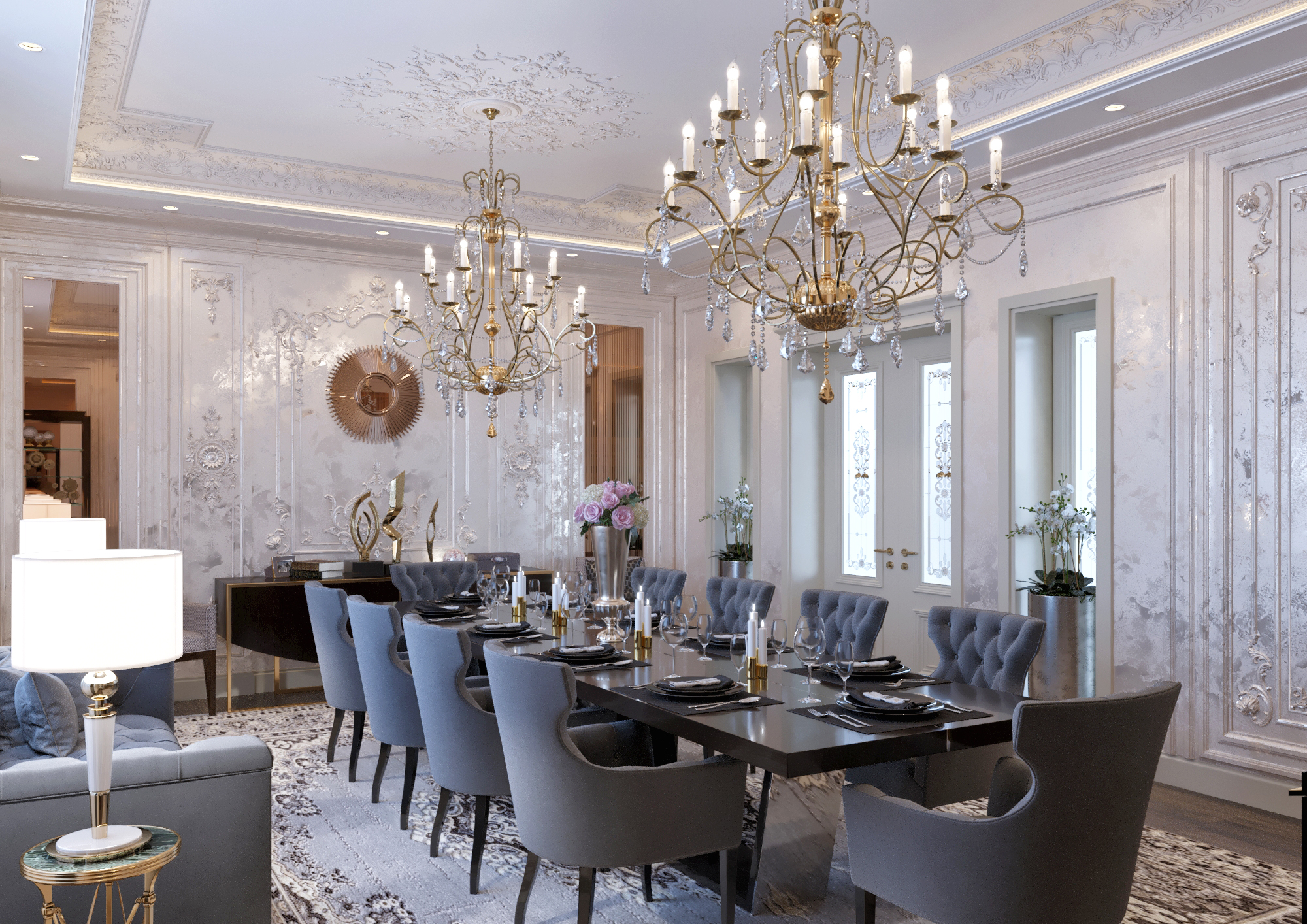 Стулья со столом не из этого интерьера, не вписываются. К таким стенам надо что-то барочное 8) От неоклассики интерьер далеко ушел, если, конечно, была такая задумка. 8)