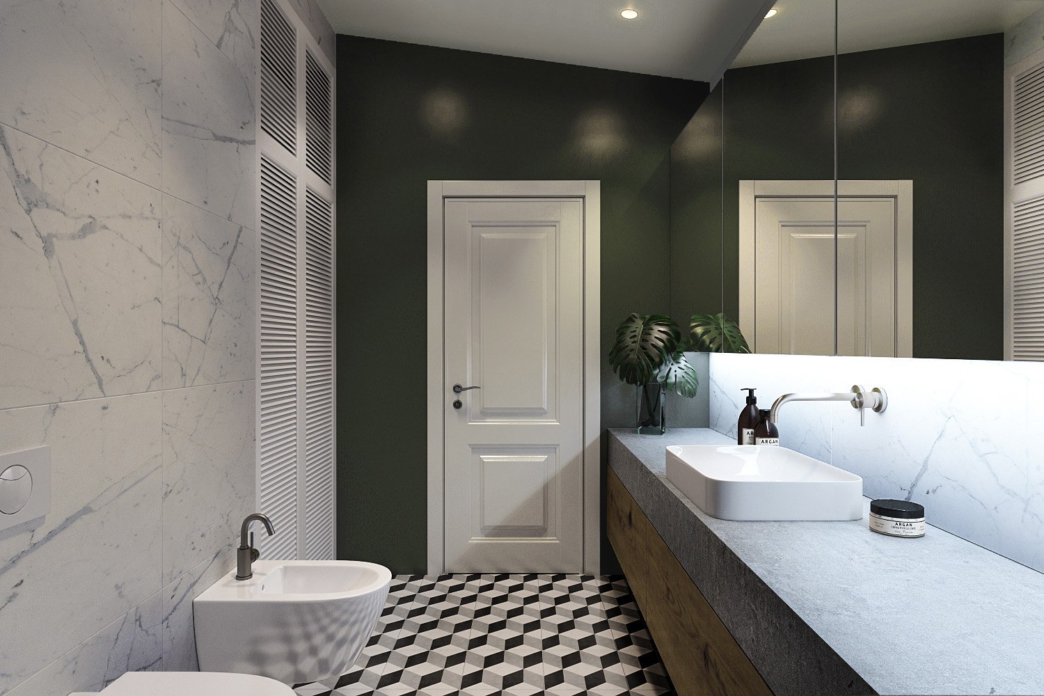 Лично мне слишком много всего: графичная плитка, крупноформатная плитка под мрамор, дерево, бетон, ламельные двери, классические двери с филенками...Виз приятный)