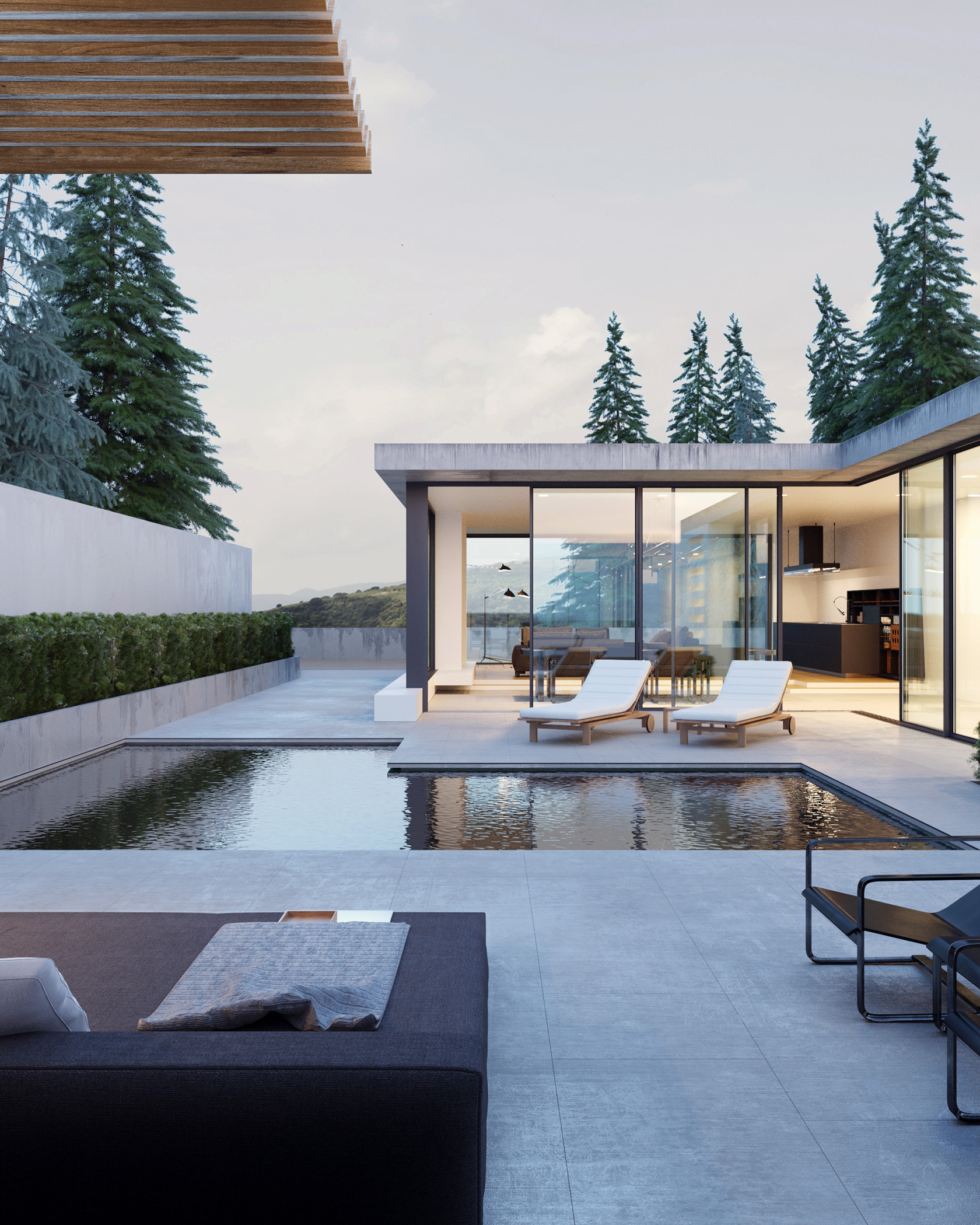 мне тоже водичка показалась-как в озере. Вроде в бассейнах вода прозрачная и практически не отражает. Досочки - это пергола -для тени. Просто их расположение под углом немного необычно. В бассейне вроде как должны быть поручни всегда - но может я и ошибаюсь. В целом очень приятная работа