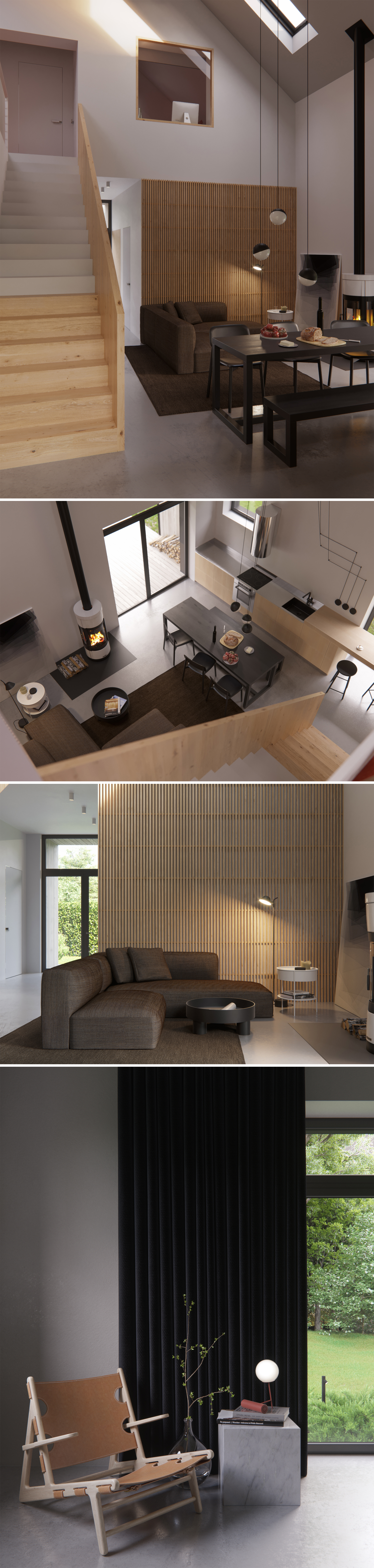 Удалось вписаться в 115 метров. Очень хотелось сделать простой дом, как с точки зрения архитектуры, так и с дизайна. Гостиная была основной точкой притяжения для всех обитателей дома, по этому было принято решение сделать второй свет, с открытой небольшой библиотекой над гостиной. Детская и одна из гостевых комнат имеет большое окно, повернутое в сторону гостиной, что в свою очередь создает очень светлый и открытый интерьер.