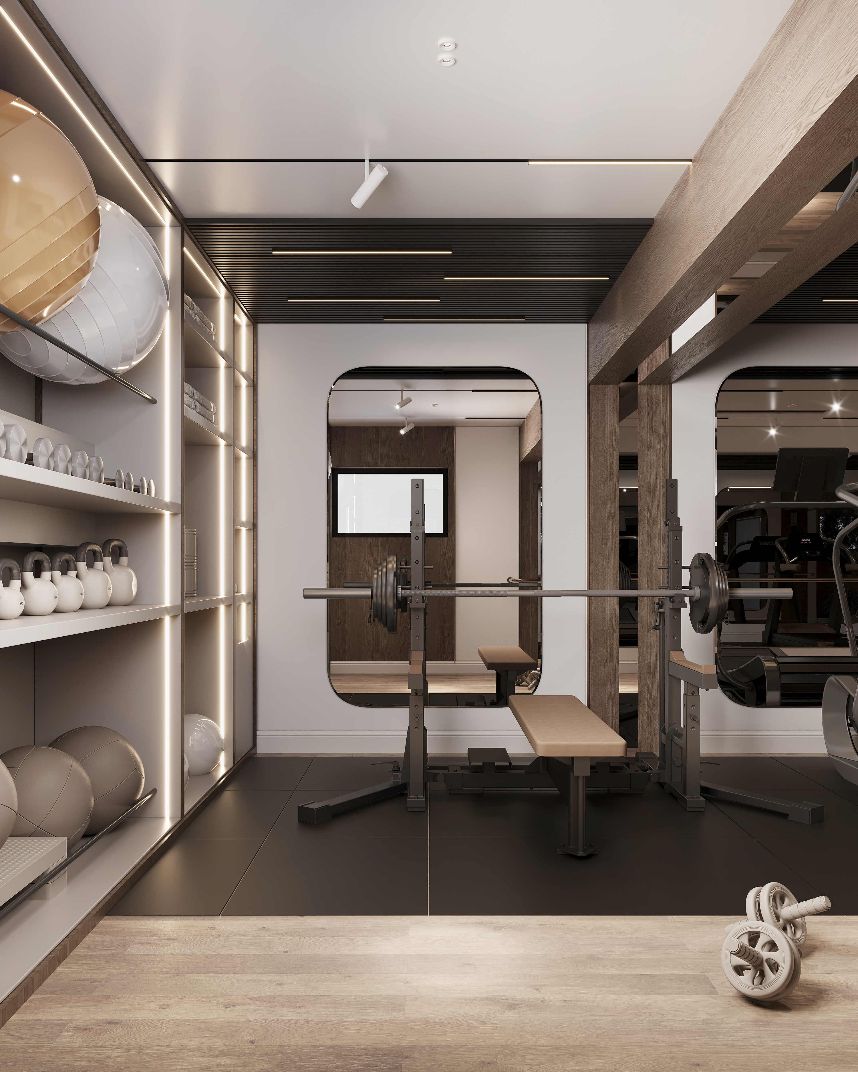 соревновательная пауэрлифтерская жимовая скамья конечно порадовала, но вес на штанге детский и куда блины складывать - где стойки для блинов. Гири в шкафу - это шедевр - там получается каркас из трубы 80х80х3мм должен быть...зеркала бесшовные - будущее уже сегодня. текстура на балке - стыки режут глаз. свет какой то непонятный - линии светят сами по себе - скрытые светильники - сами по себе. Функционал этого подвала под вопросом - это после потной трени сесть на диван? Мячиков больше чем объем помещения)) ну вобщем странно все это. А в целом картинка приятная.