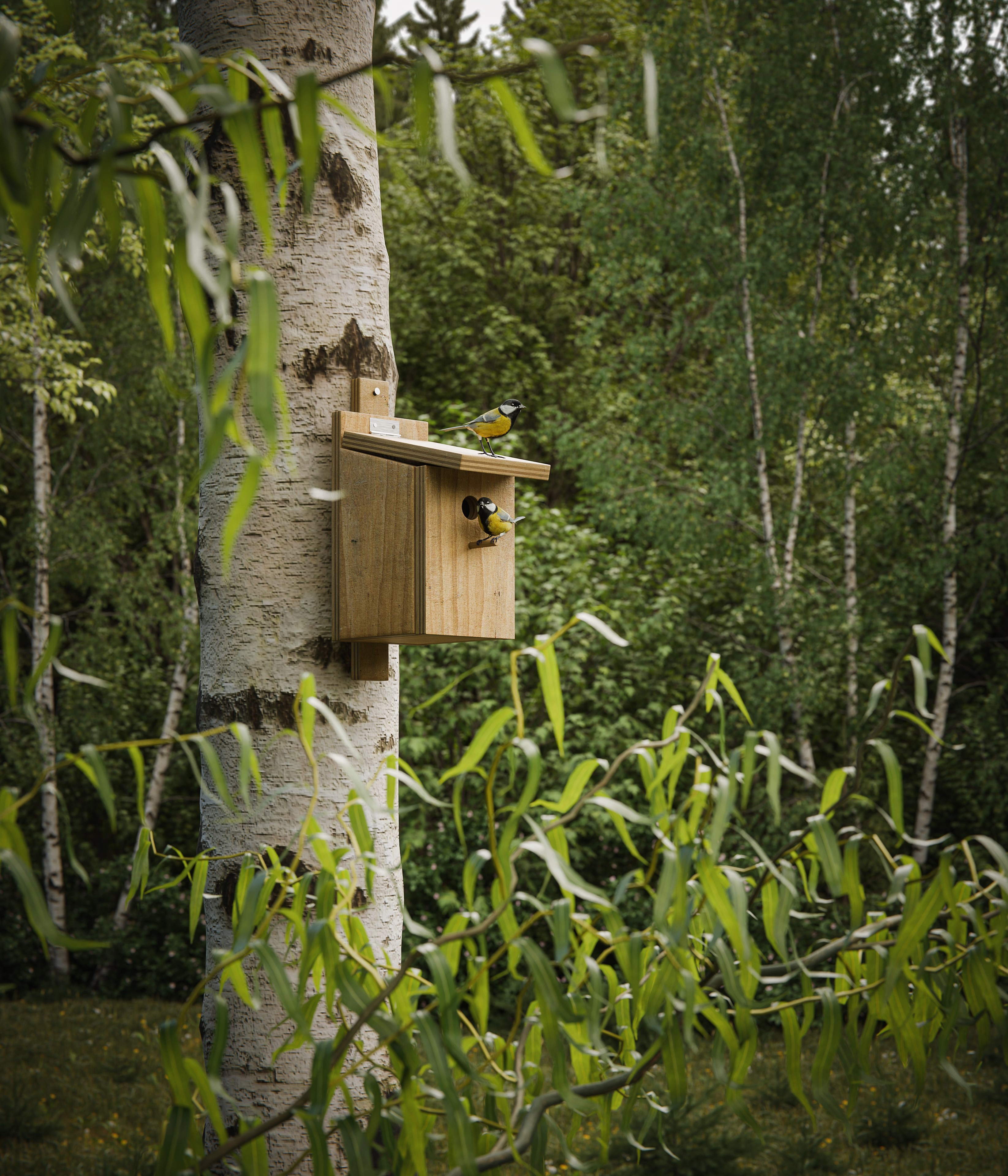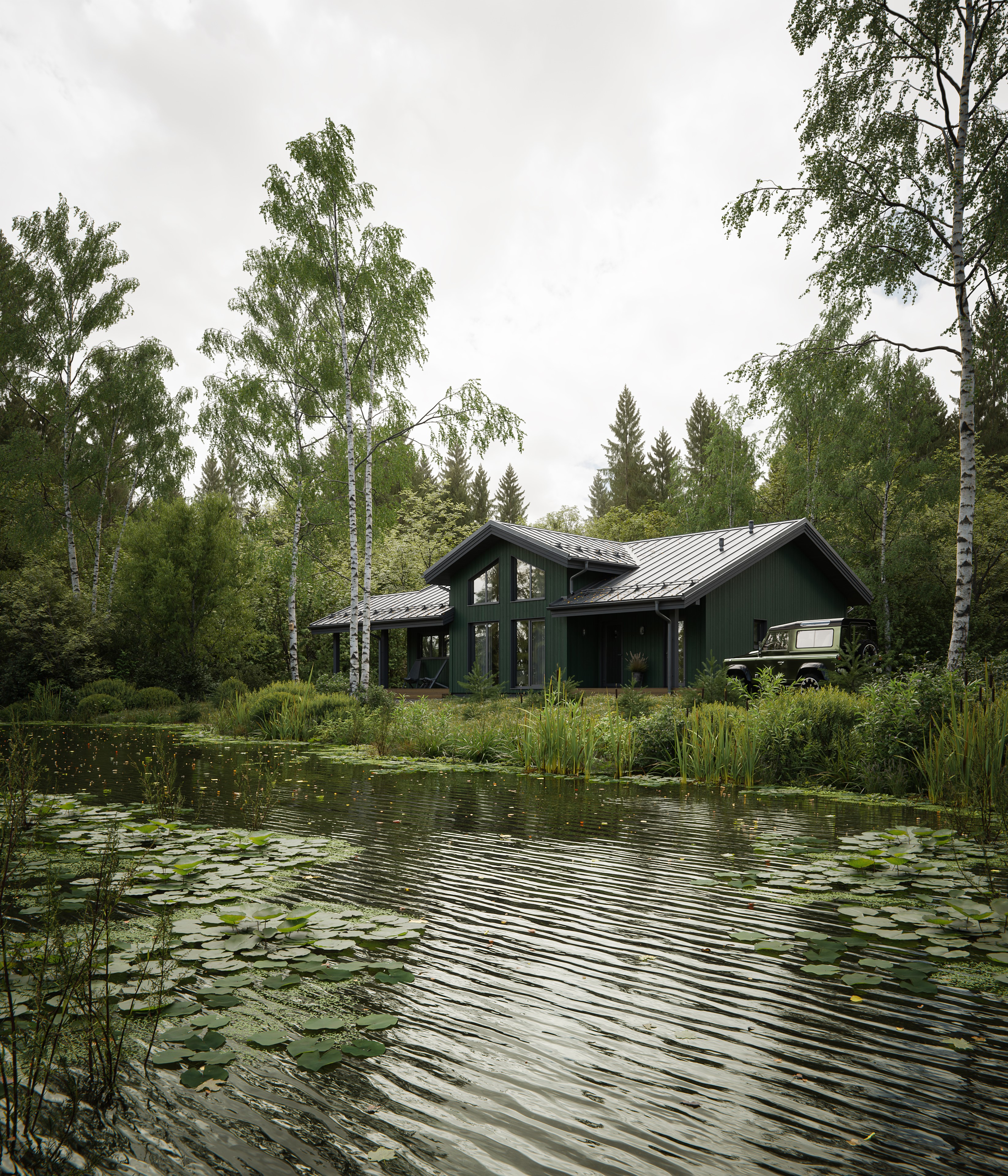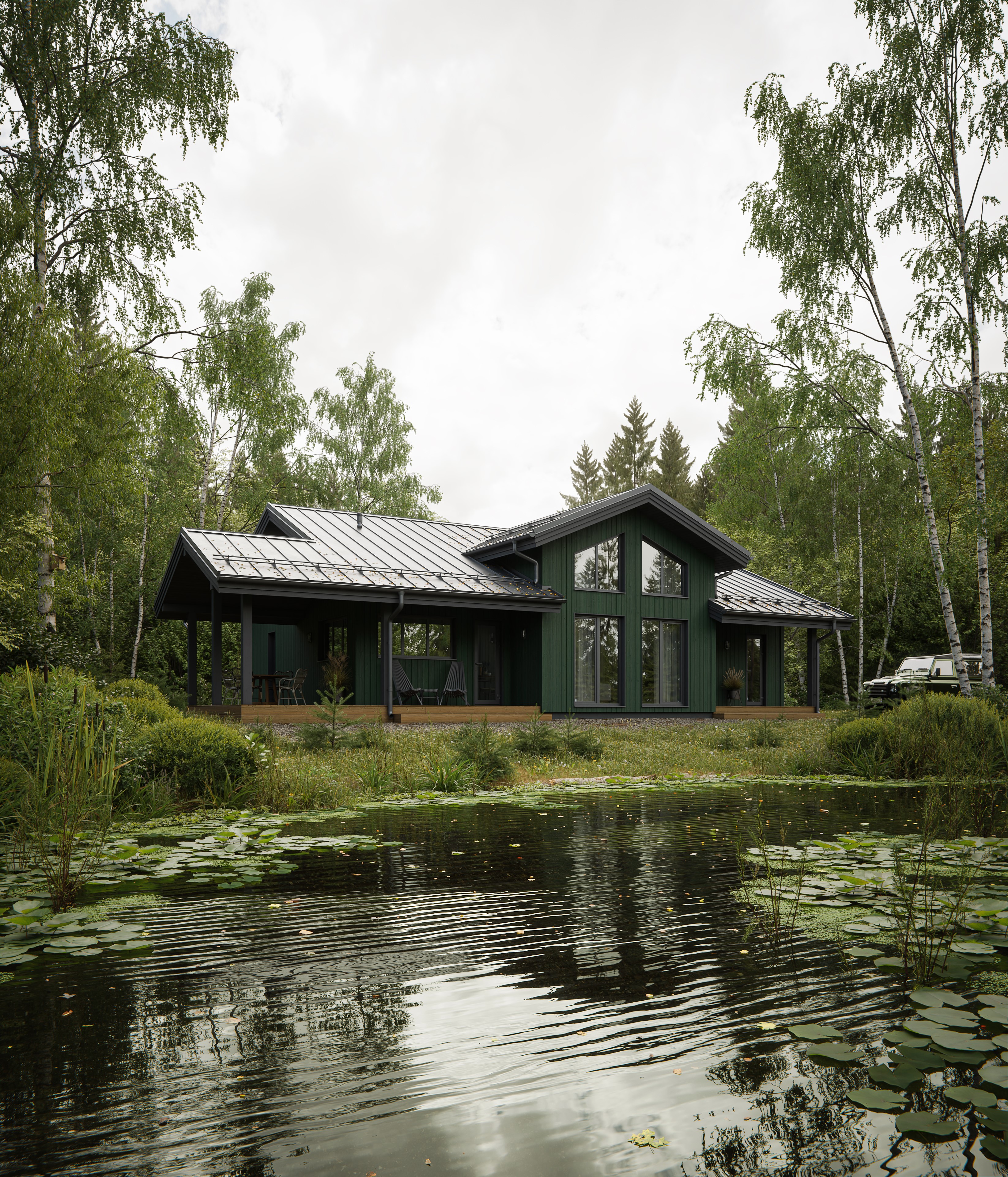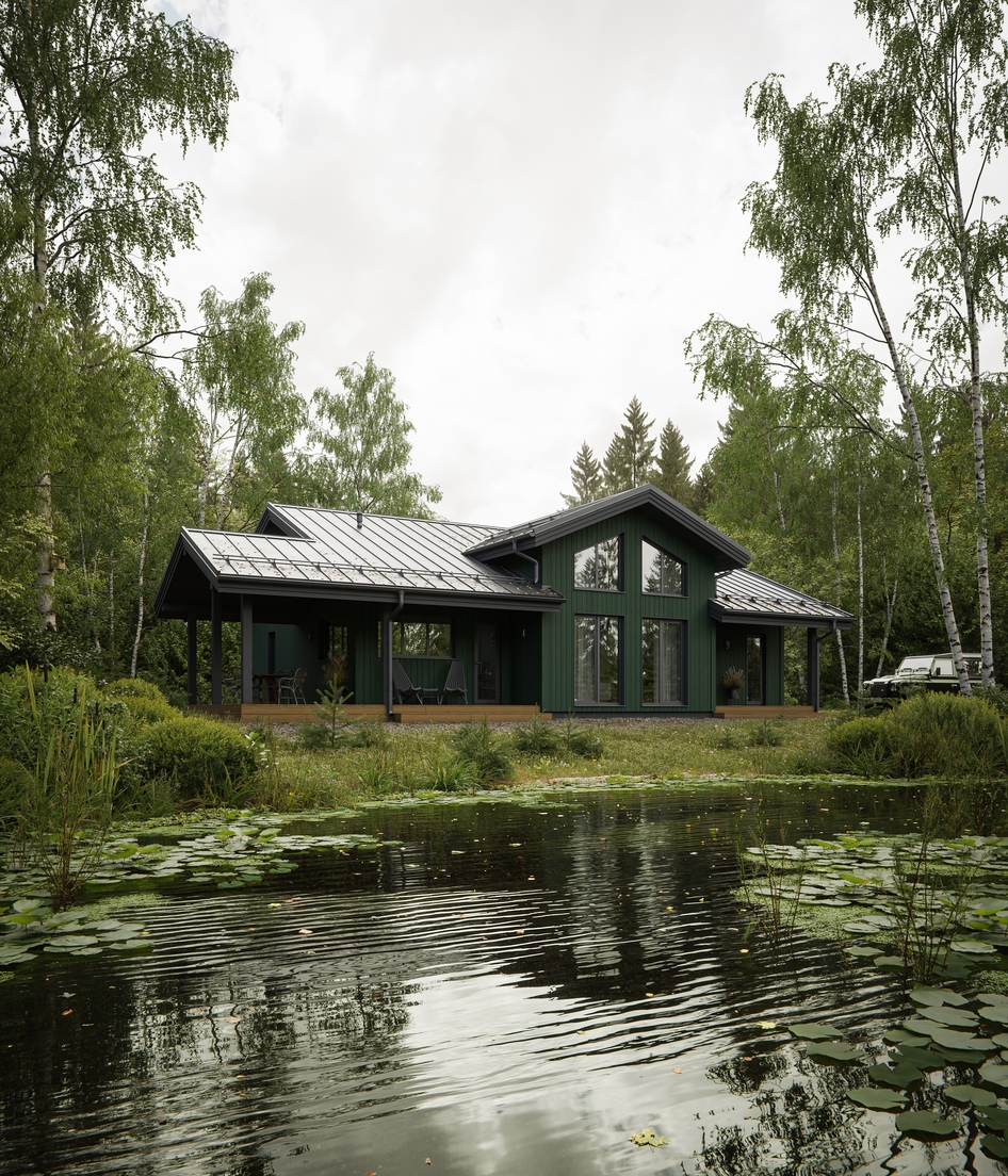 Визуализация загородного дома для строительной компании. Целью было сделать атмосферные рендеры для сайта и рекламы, потому была создана такая живописная сцена с речушкой и родными берёзами. Ракурс с синичками был сделан просто для души.