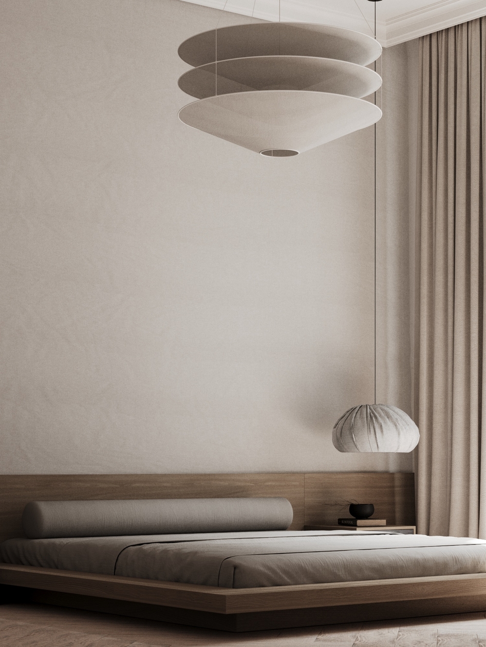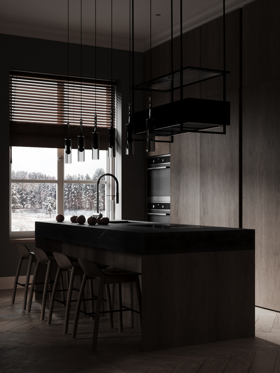 решение - природные материалы (дерево, камень, похожий на березу), активные элементы классики, уютные обволакивающие пространства, в которых как раз можно укрыться и визуально тяжелые ткани.