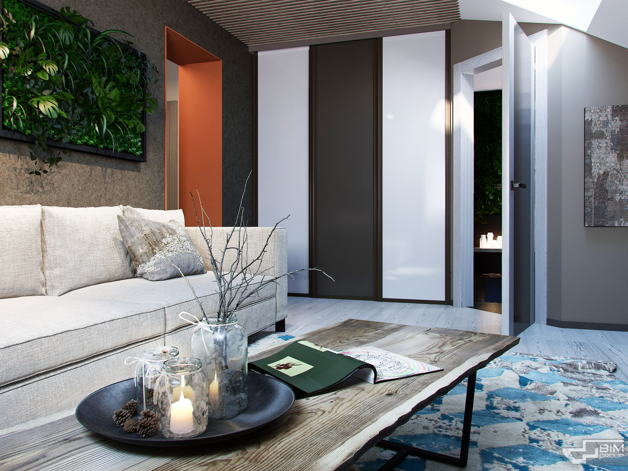 Все понравилось, единственное, мне кажестя, можно было бы деревянные планки на потолке продолжить на фасады шкафа, как вариант и может быть двер другую, в цвет стены, а наличник оранжевый(как проем), а так супер