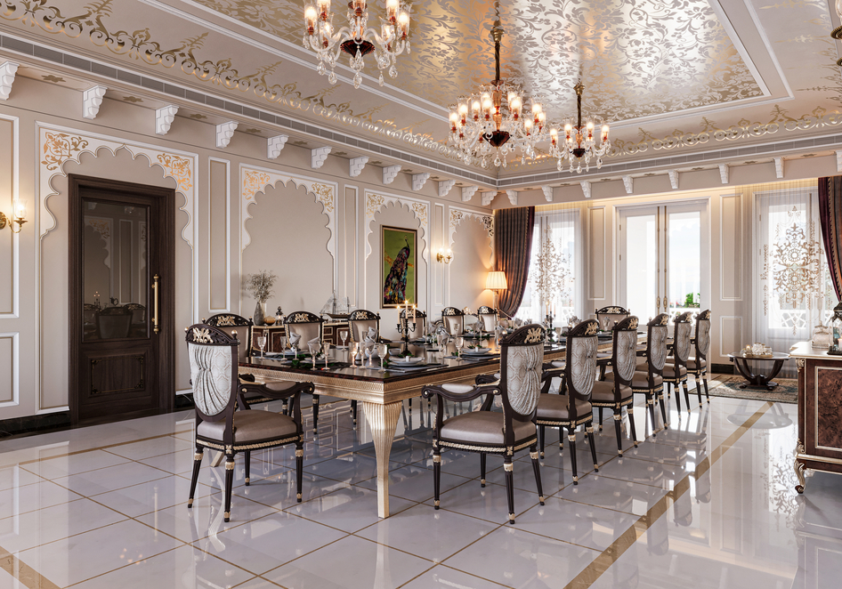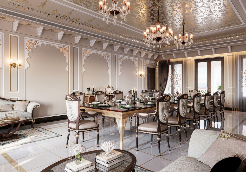 A traditional Indian classical dining area exudes timeless elegance and cultural richness, blending heritage design with functional comfort. The space is adorned with intricately carved wooden furniture, typically in dark teak or rosewood, featuring ornate motifs inspired by Mughal or Rajasthani craftsmanship. The dining table is often large and majestic, surrounded by high-back chairs upholstered in rich fabrics like silk or brocade.