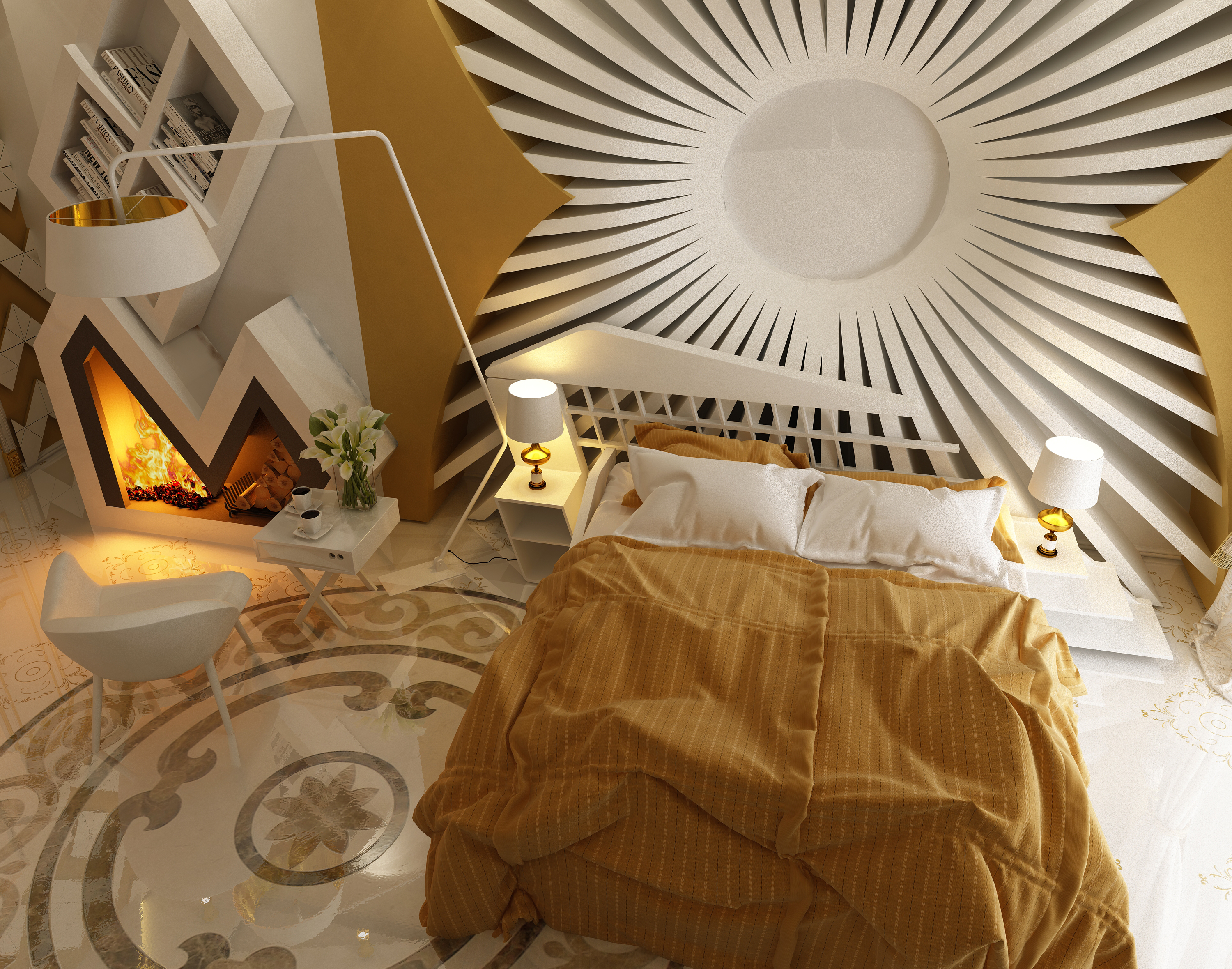 куча идей, но каждой идее тут тесно, случайный светильник точечный, непонятные углубления по углам - место для пыли и потерянных вещей, и это солнце в изголовье - прям ад перфекциониста - углы неодинаковые, и стена напротив кровати кажется тоже "нескучная"