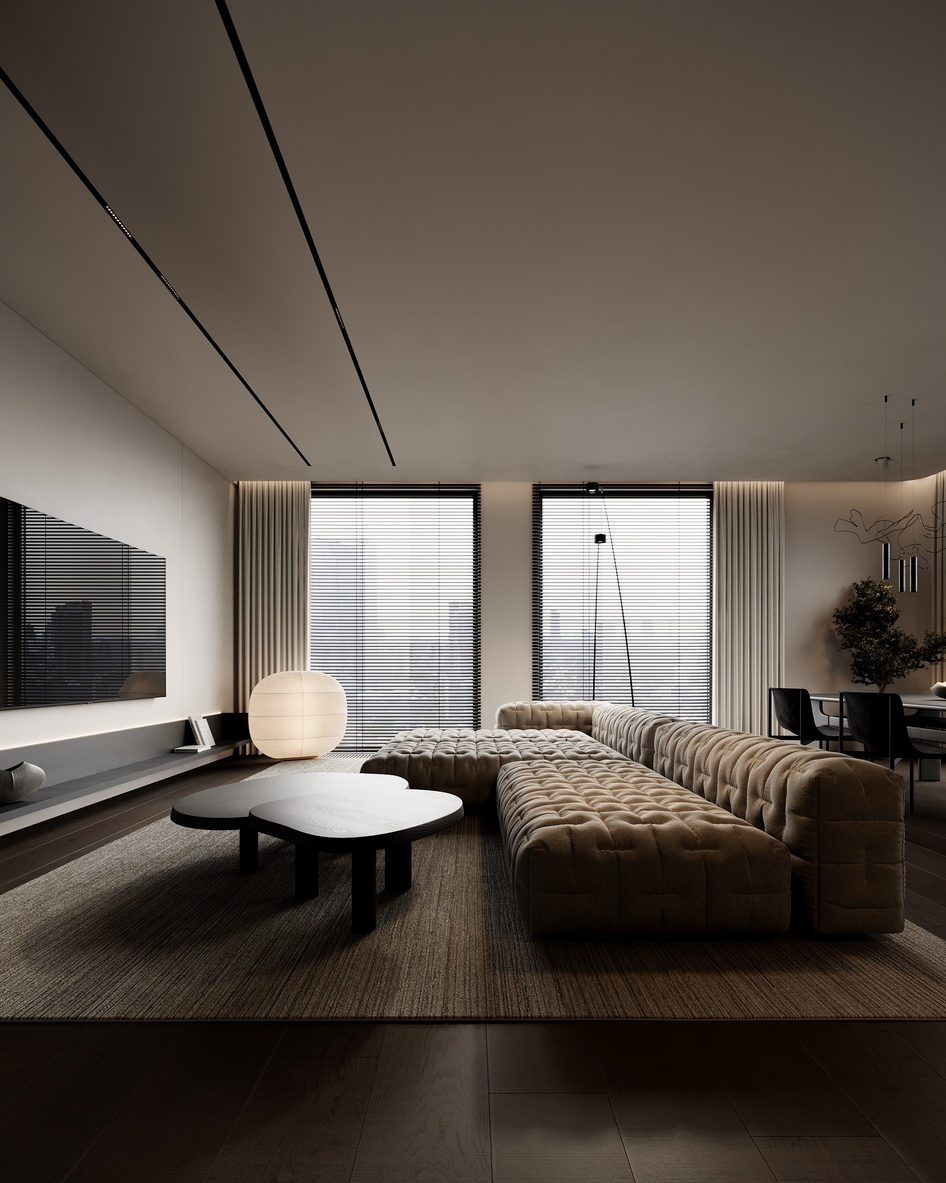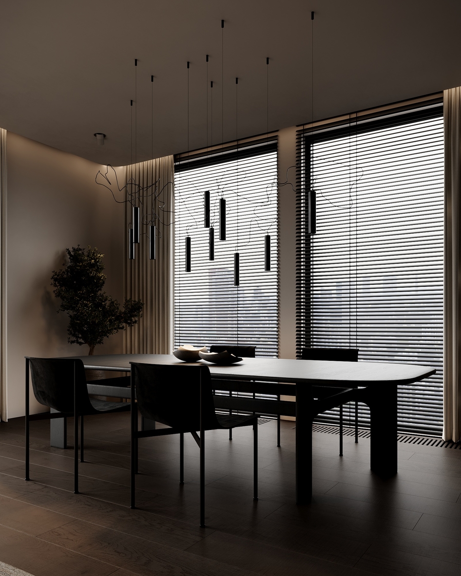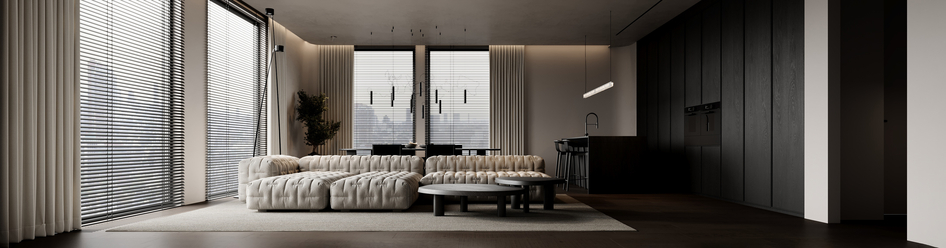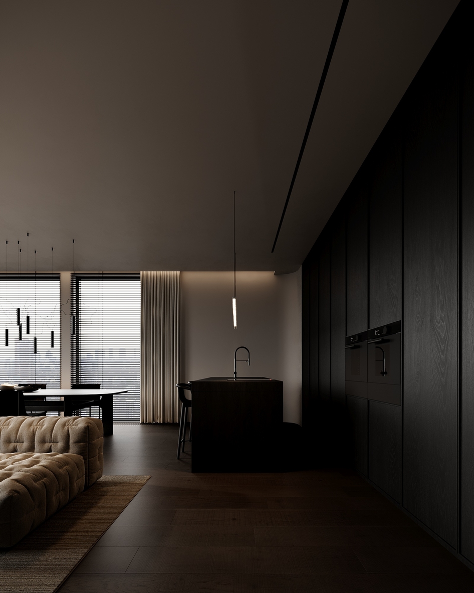Дизайн кухни-гостиной в стиле минимализм с использованием натуральных материалов и контрастных оттенков. @vesalevi.interior