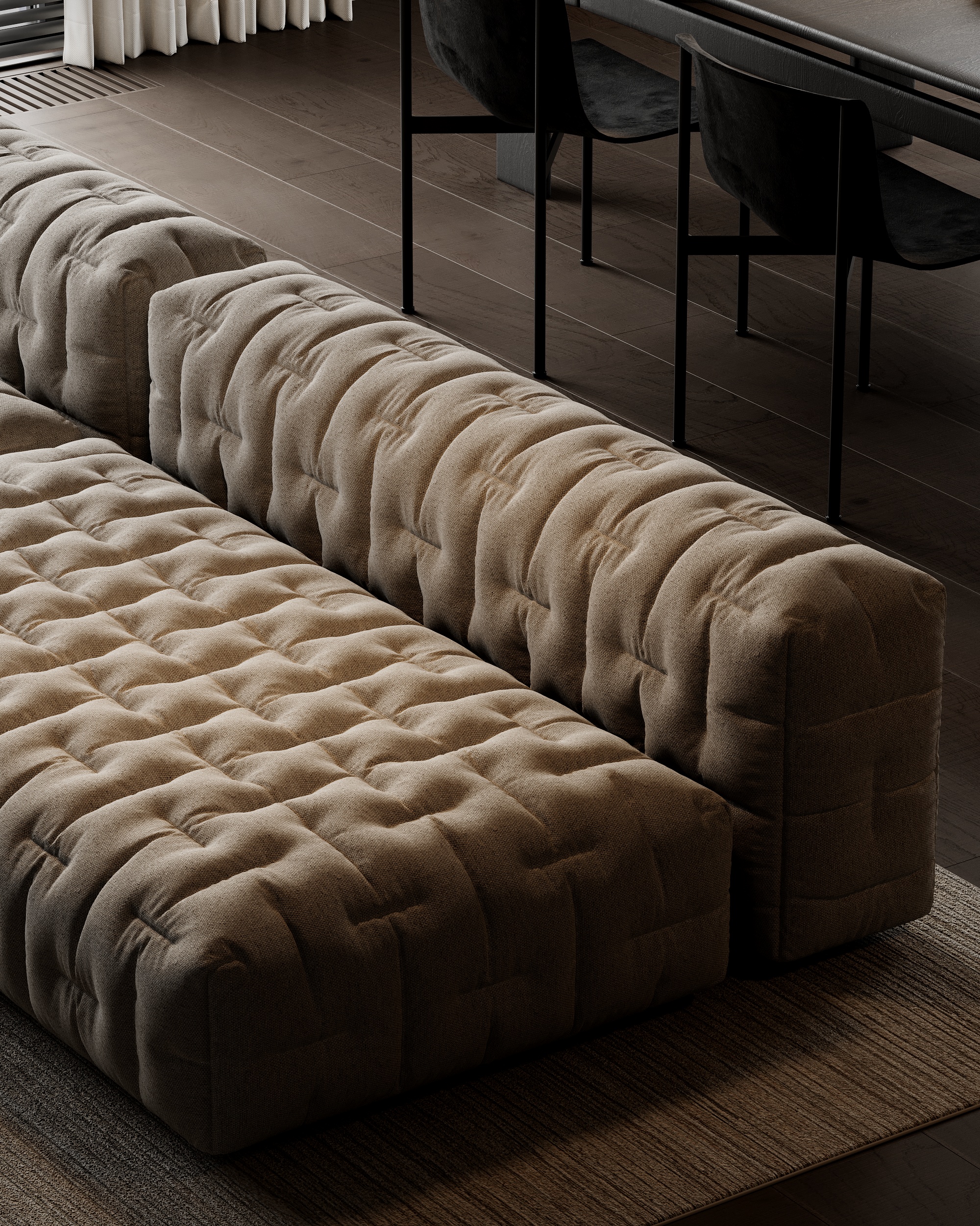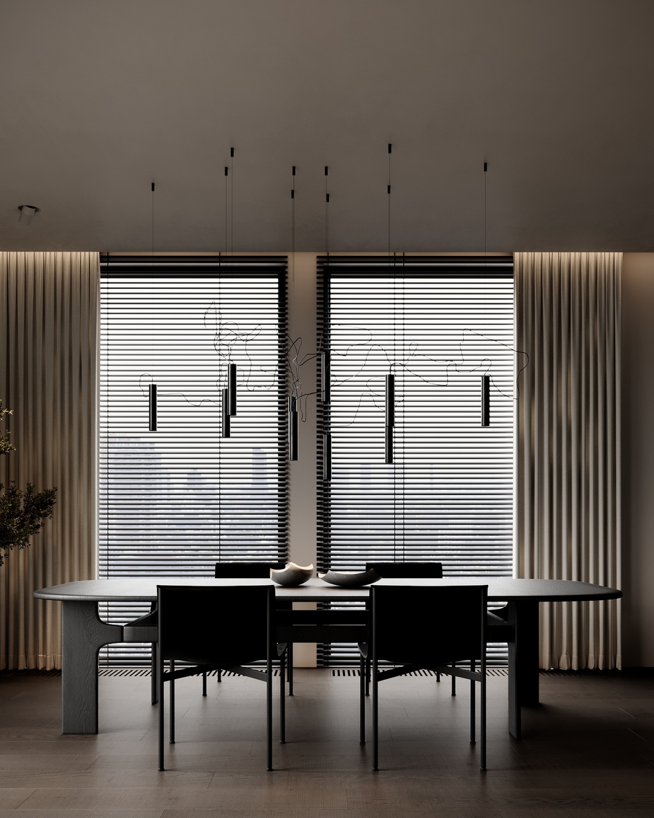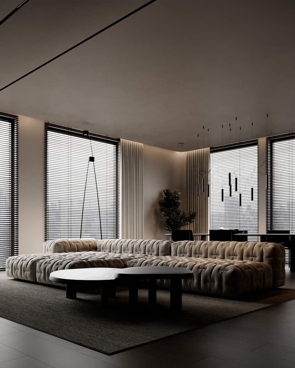 Дизайн кухни-гостиной в стиле минимализм с использованием натуральных материалов и контрастных оттенков. @vesalevi.interior