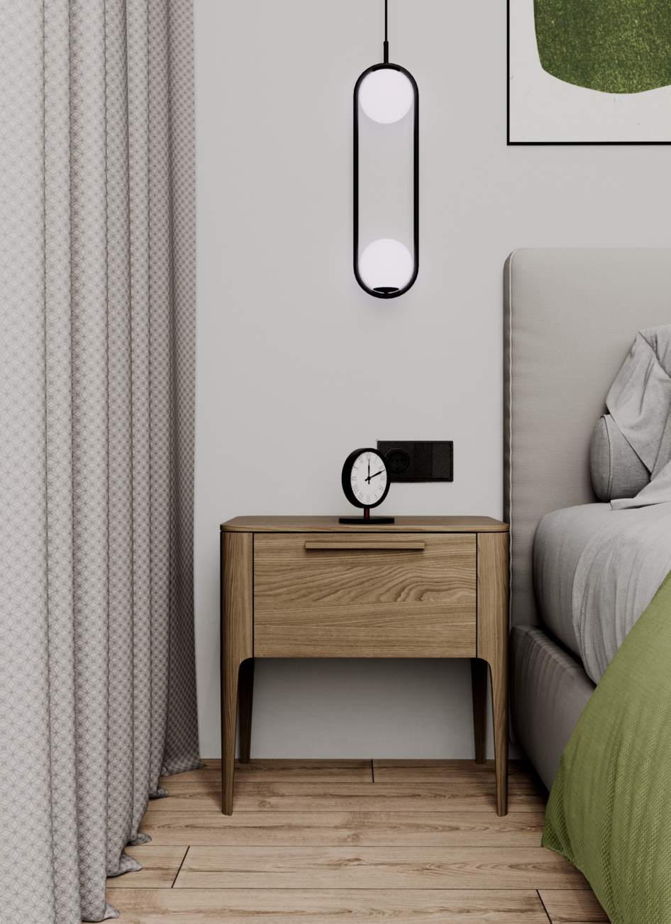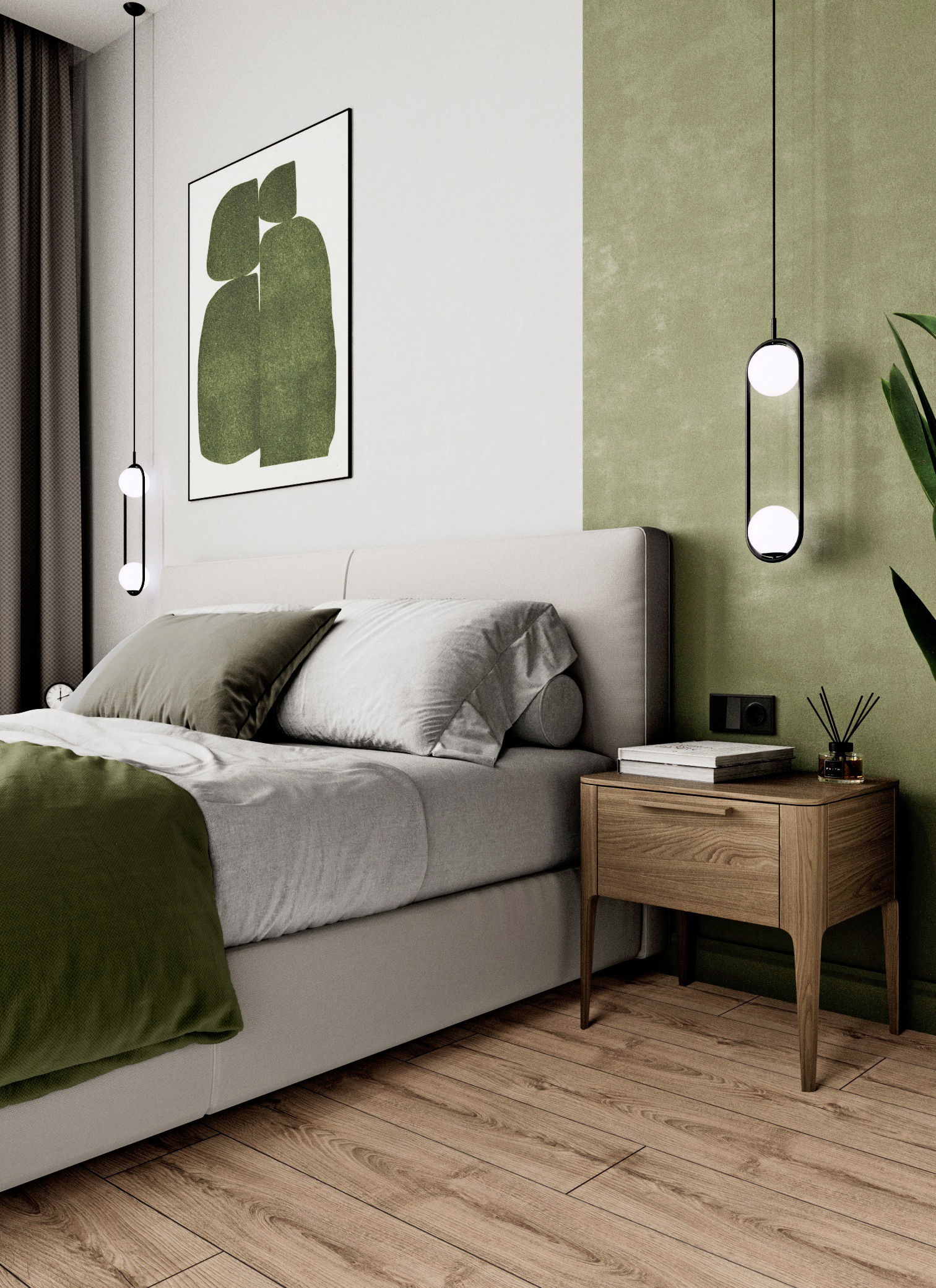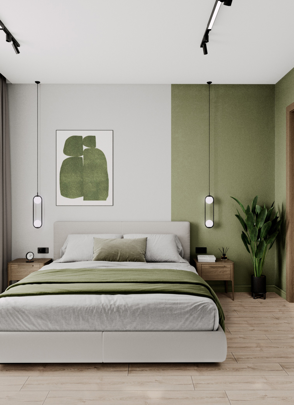 Интерьер спальни в белых и зеленых оттенках(сделано по референсу)