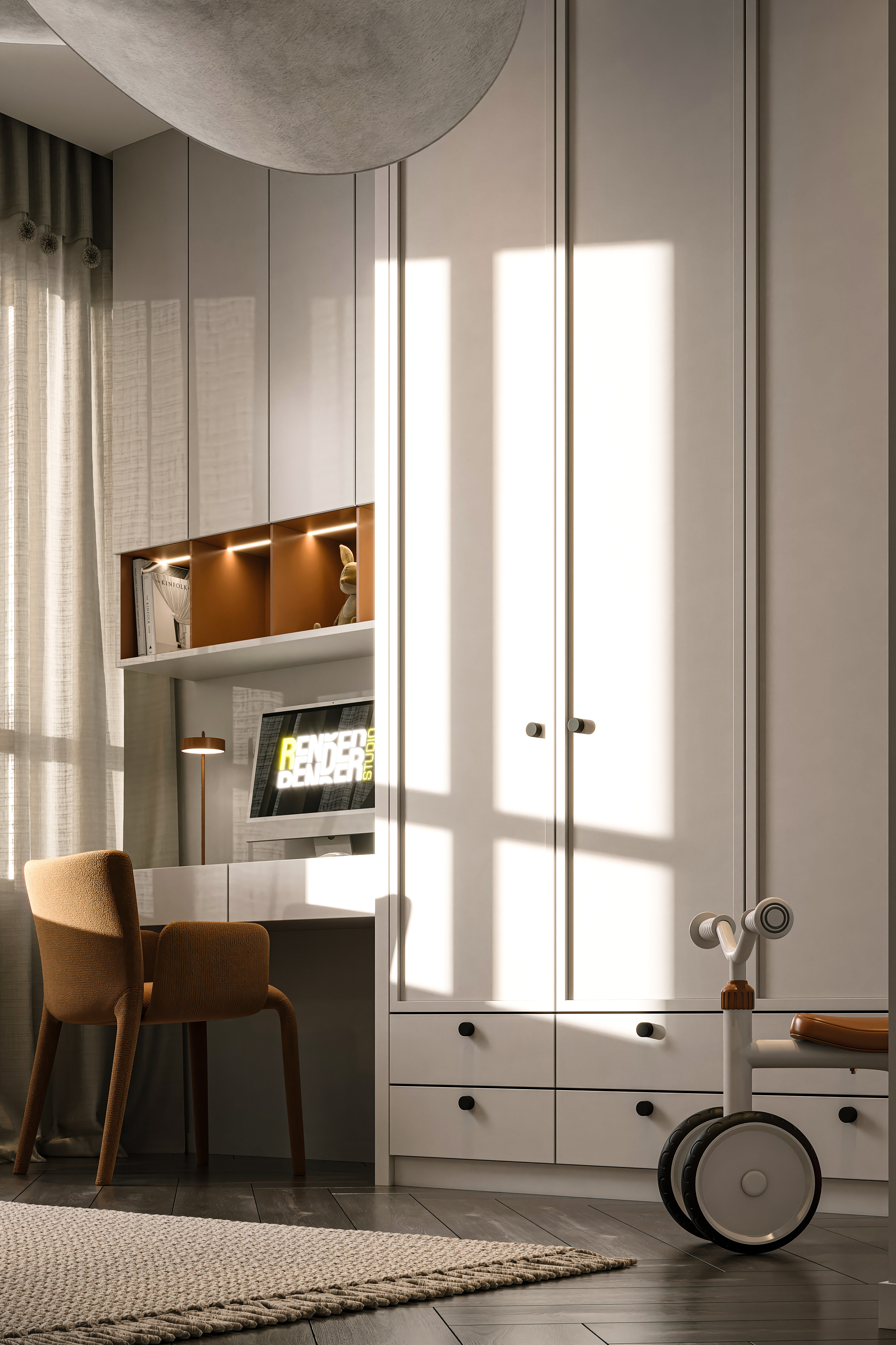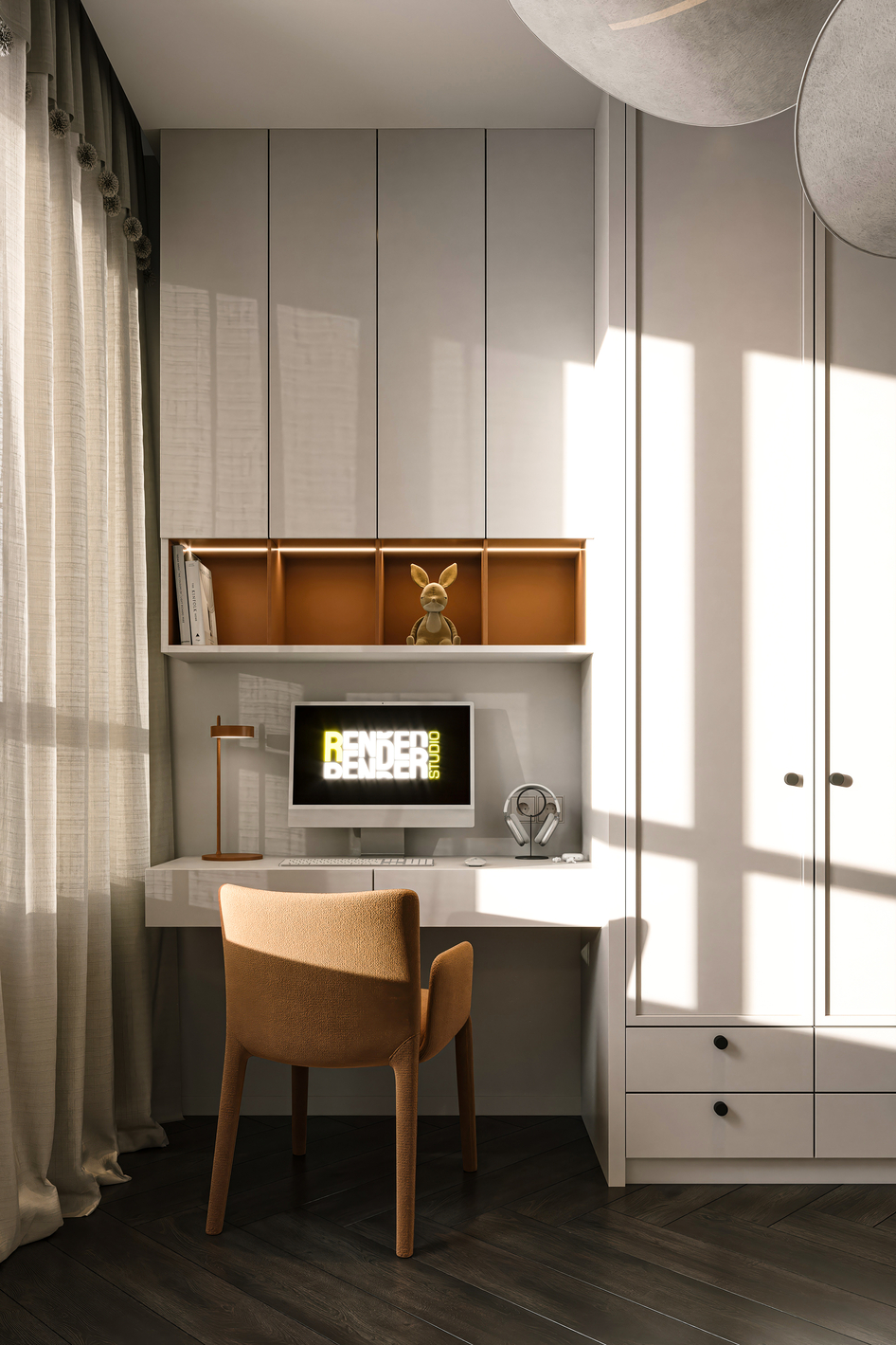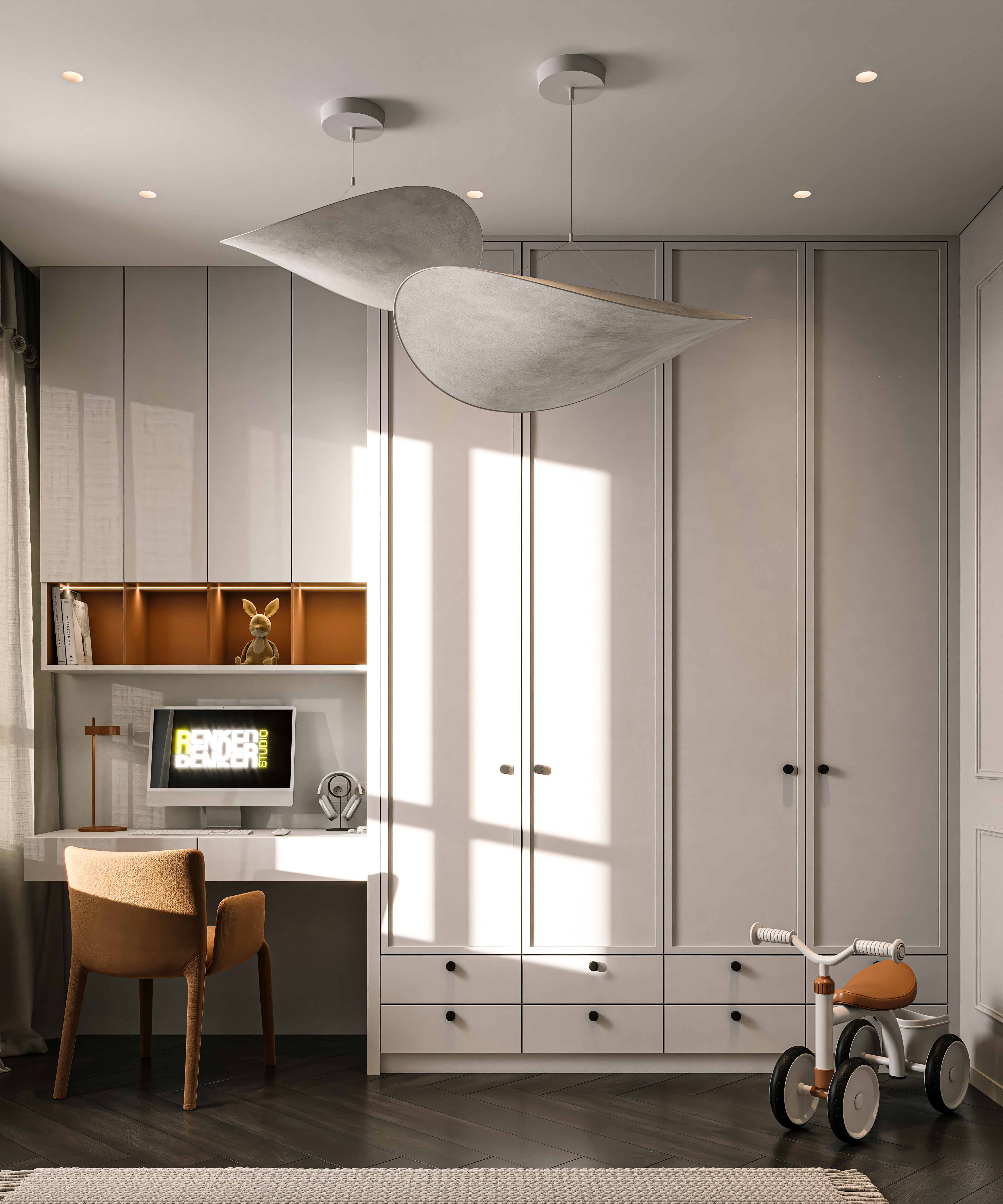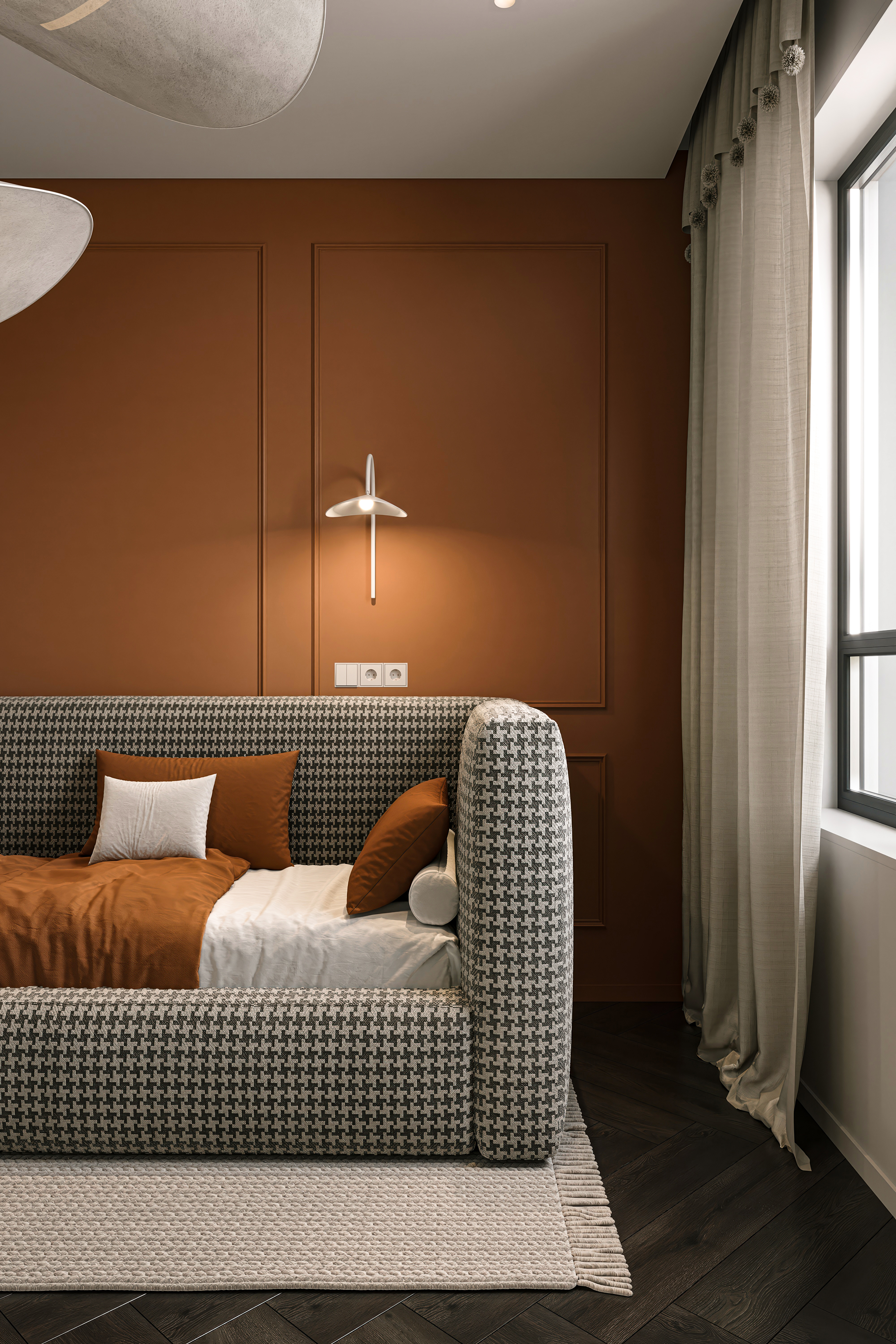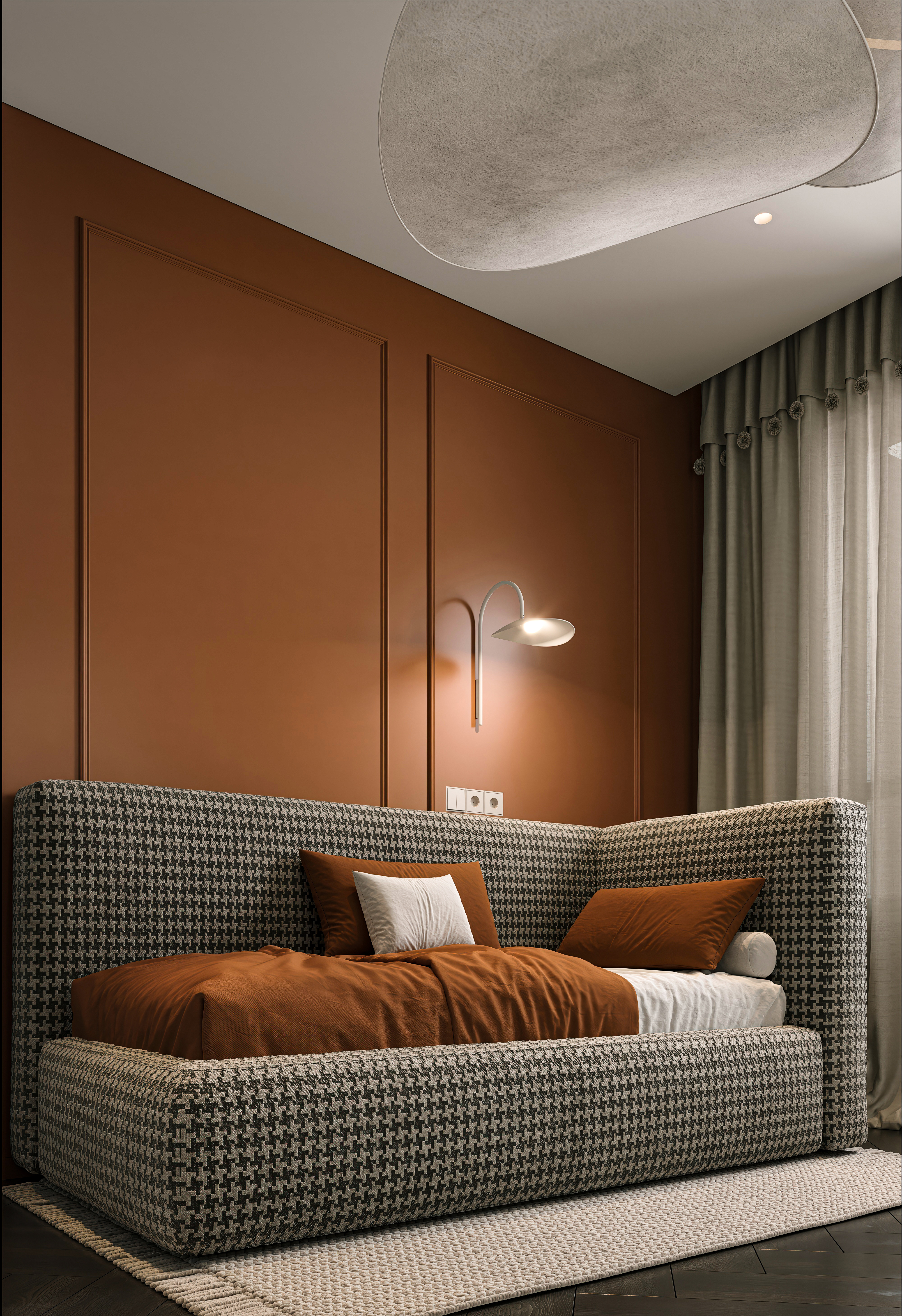 Современный уют в деталях Эта детская комната сочетает в себе элегантность и функциональность. Тёплые оттенки терракоты и молочного цвета создают атмосферу комфорта, а акценты из ткани с узором «гусиная лапка» придают интерьеру характер.