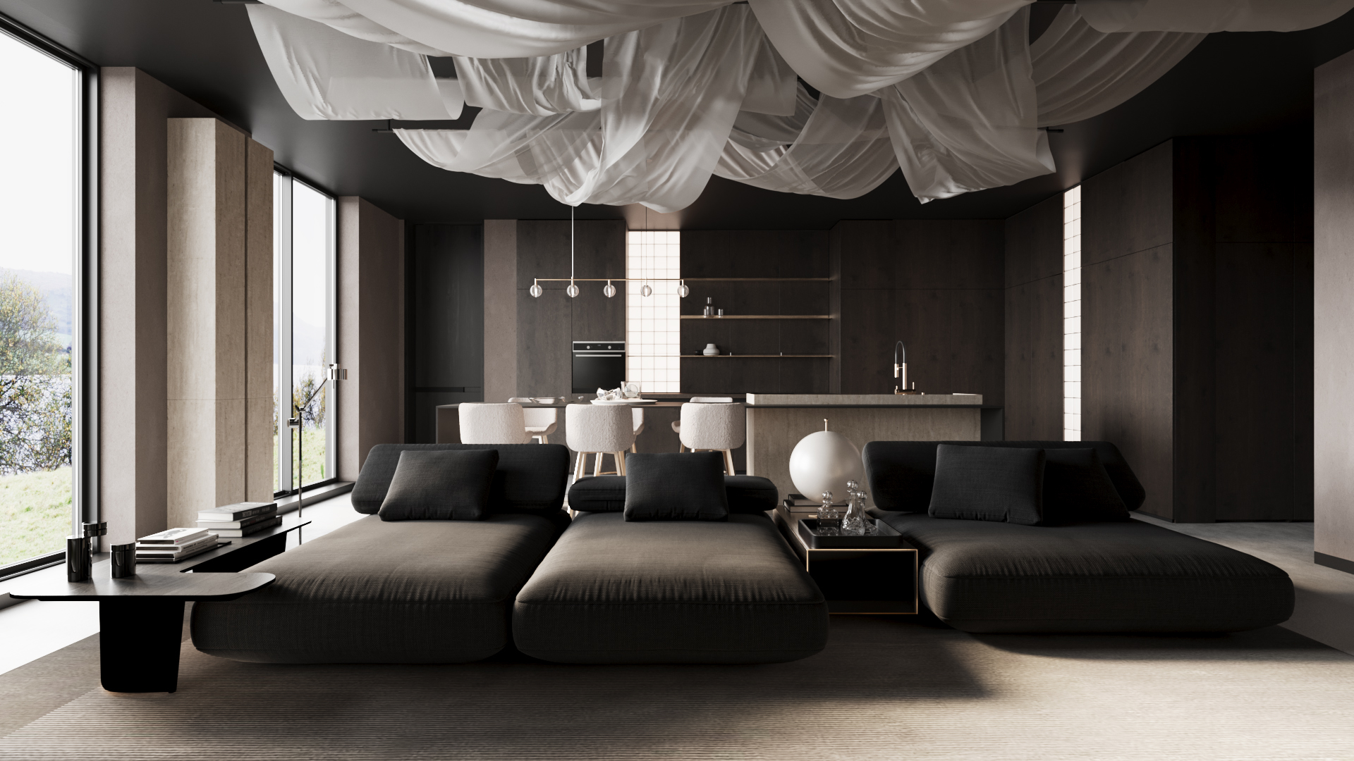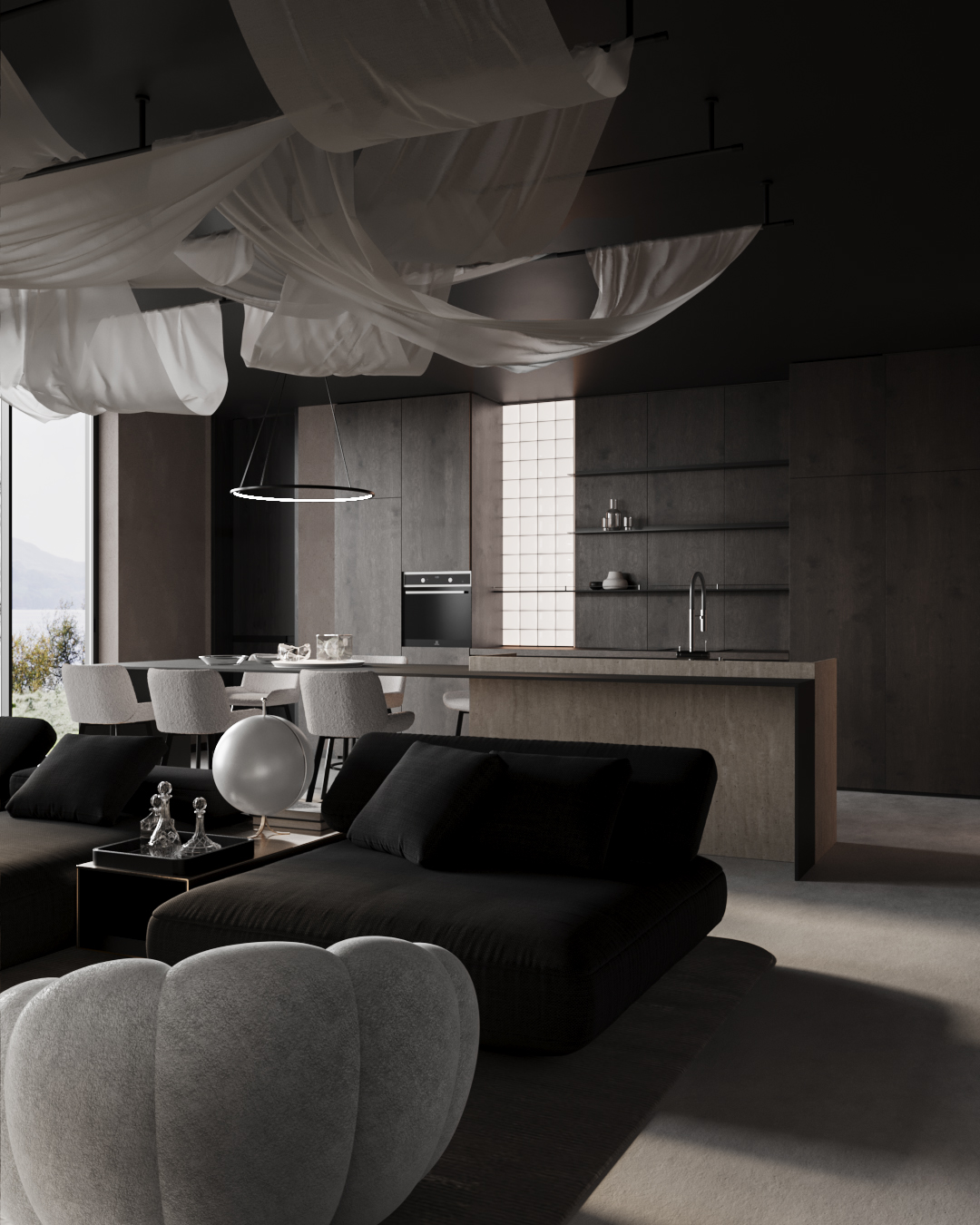 Интерьер с контрастом форм и цвета | Гостиная_Кухня