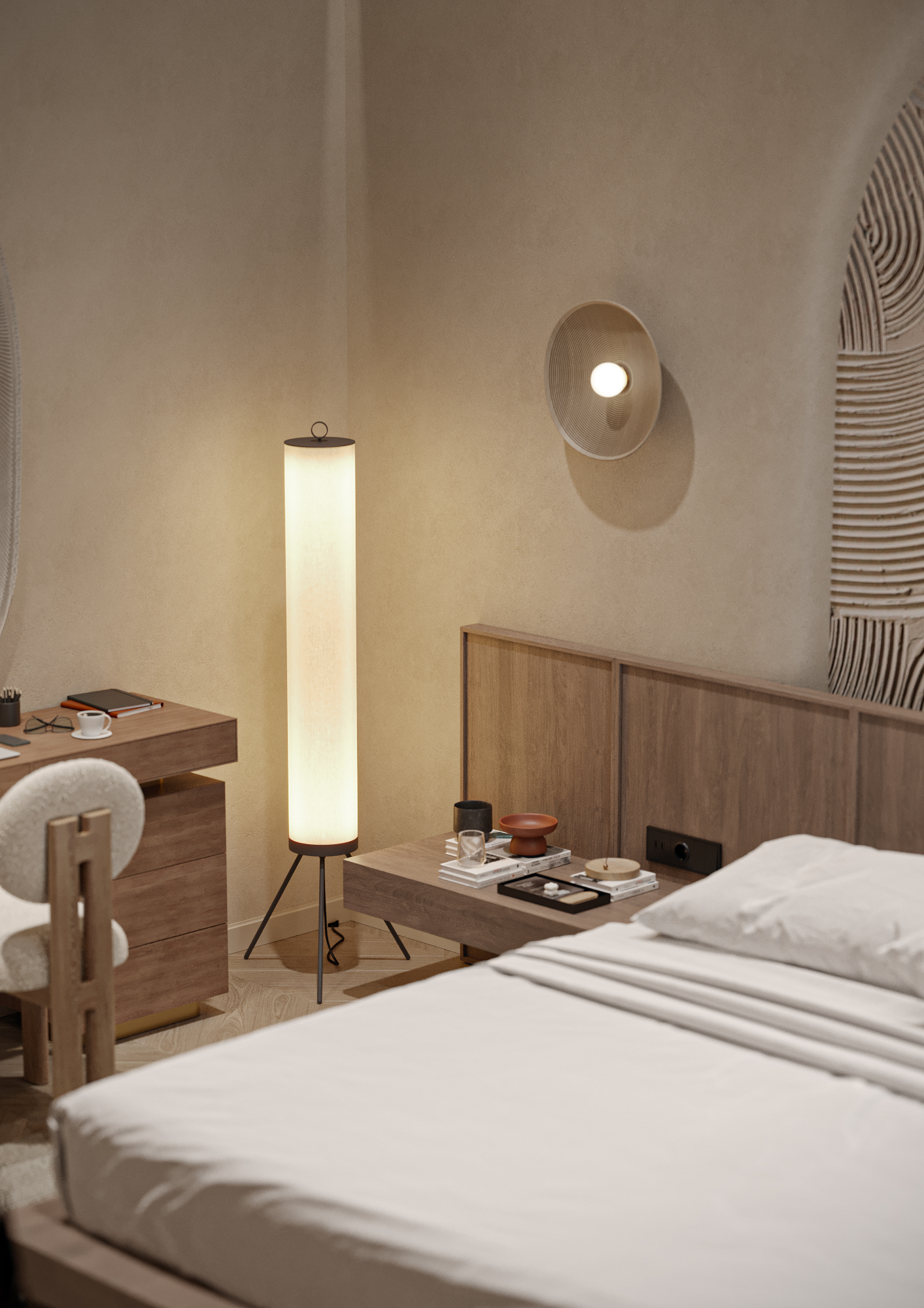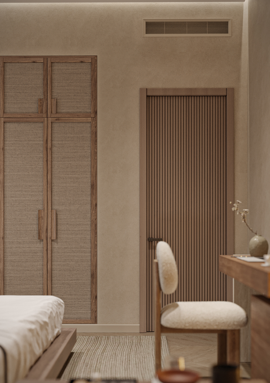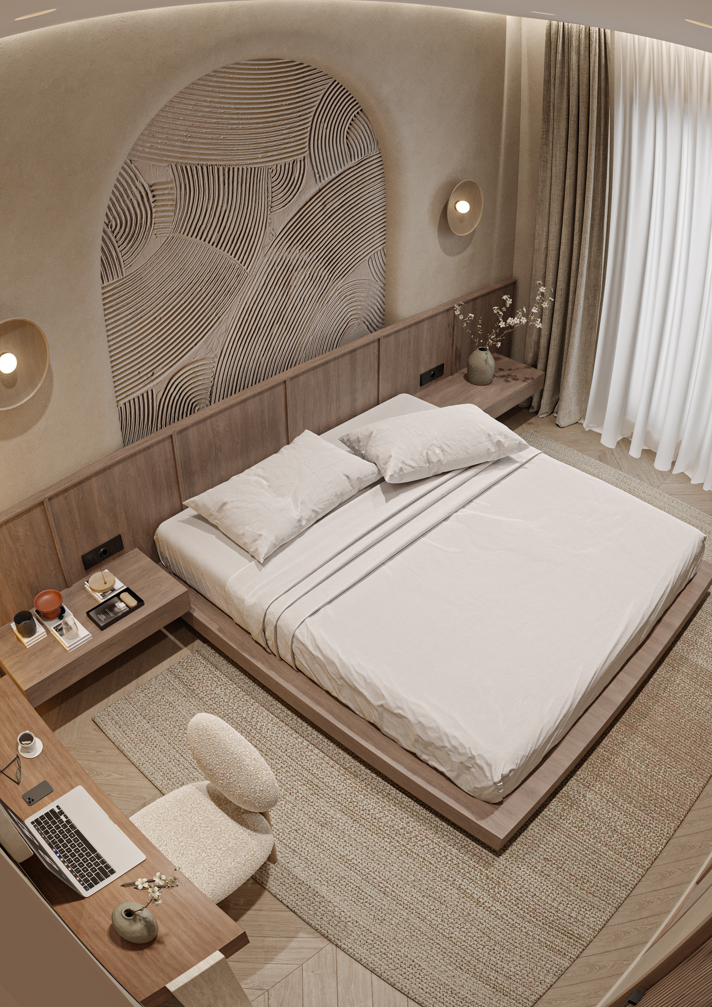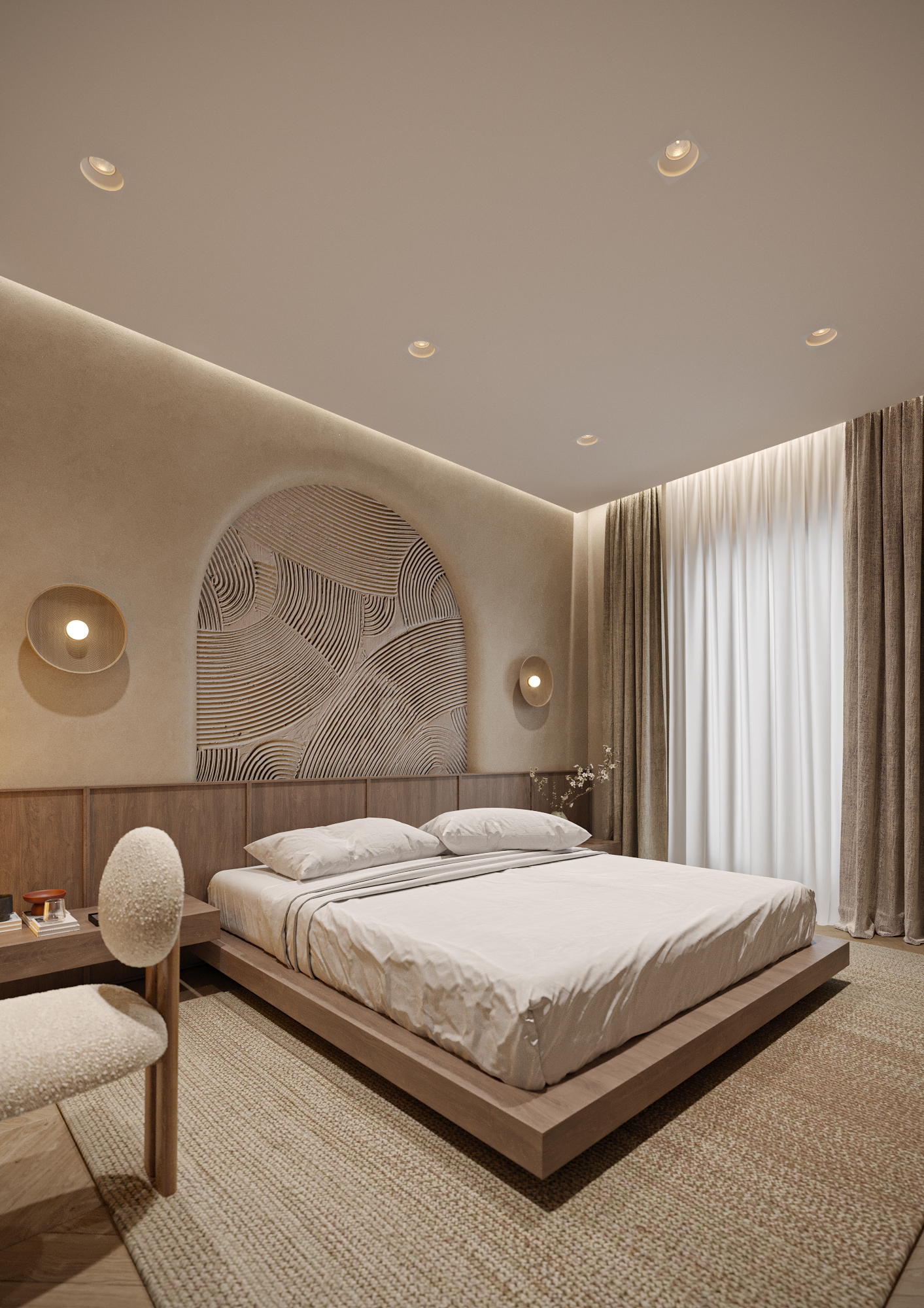 Интерьер спальни выполнен в стиле Japandi