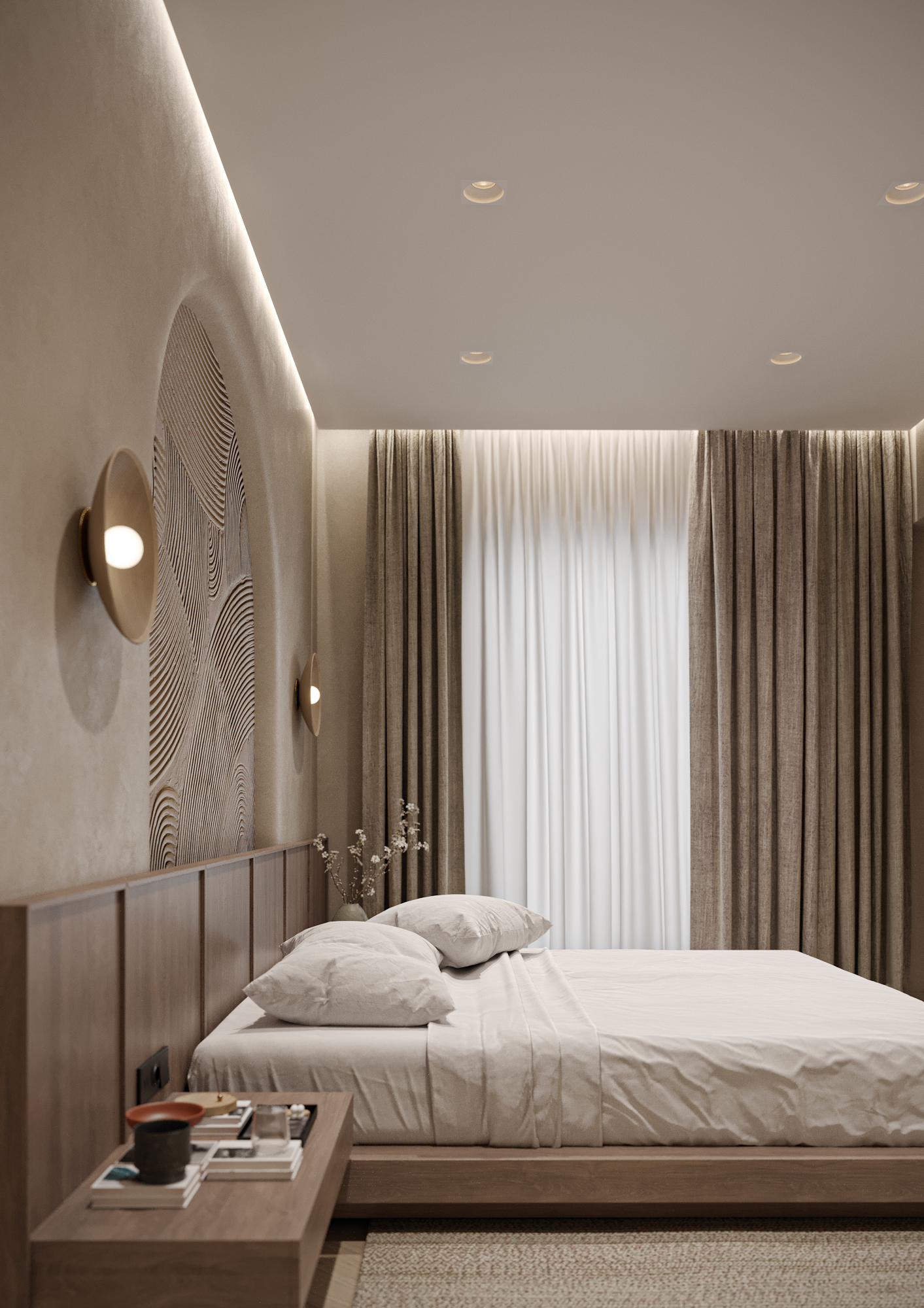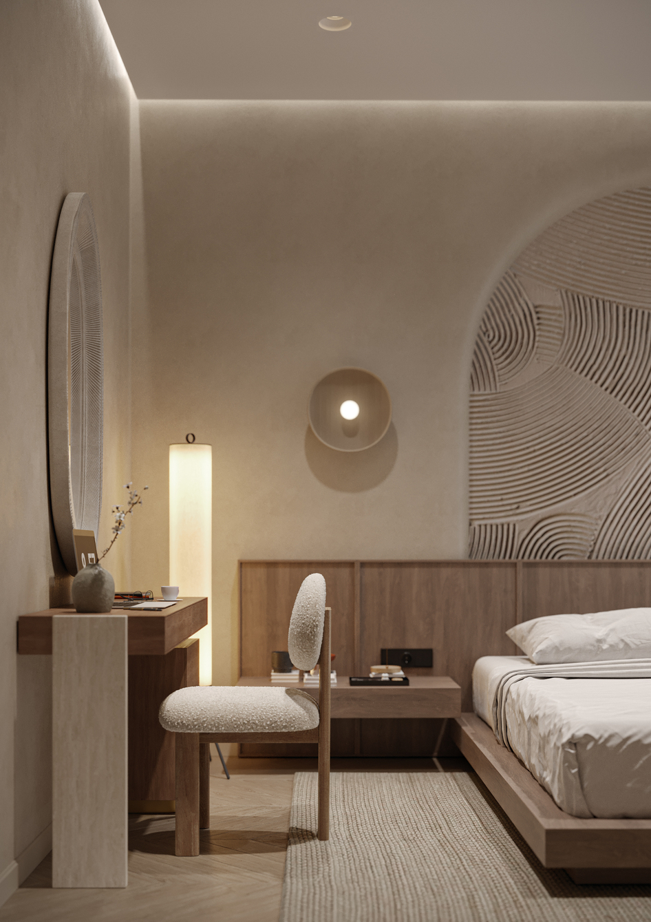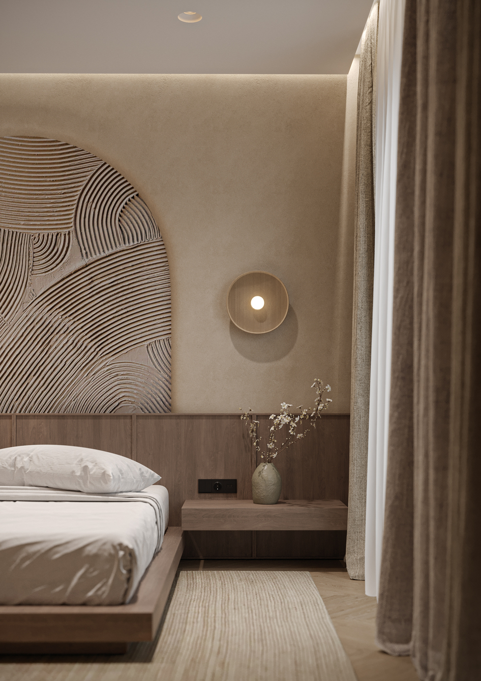 Интерьер выполнен в эстетике Japandi, где сочетаются простота японского дизайна и уют скандинавского стиля. Основная палитра — тёплые нейтральные тона: бежевый, светлое дерево и мягкие серо-кремовые оттенки.