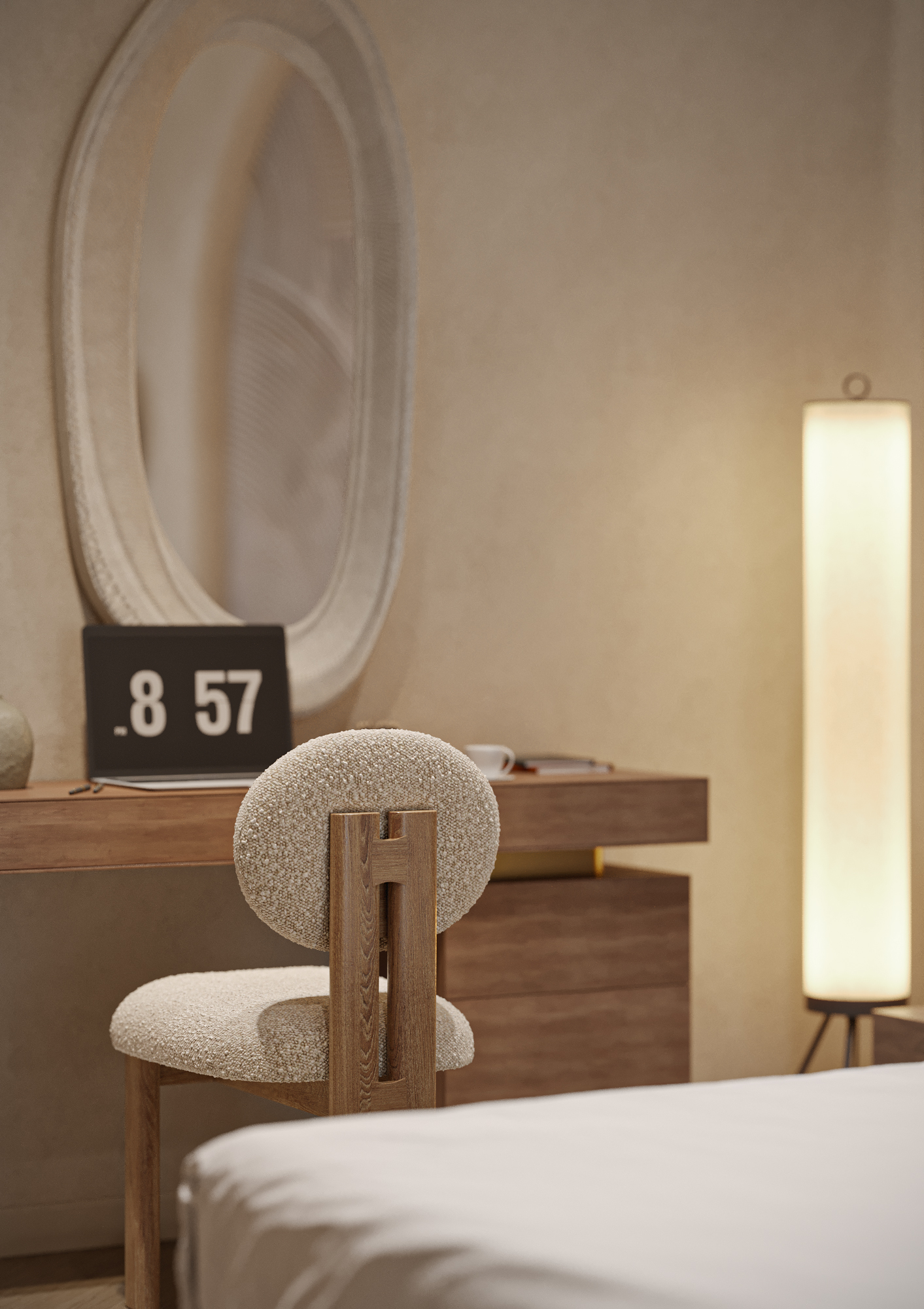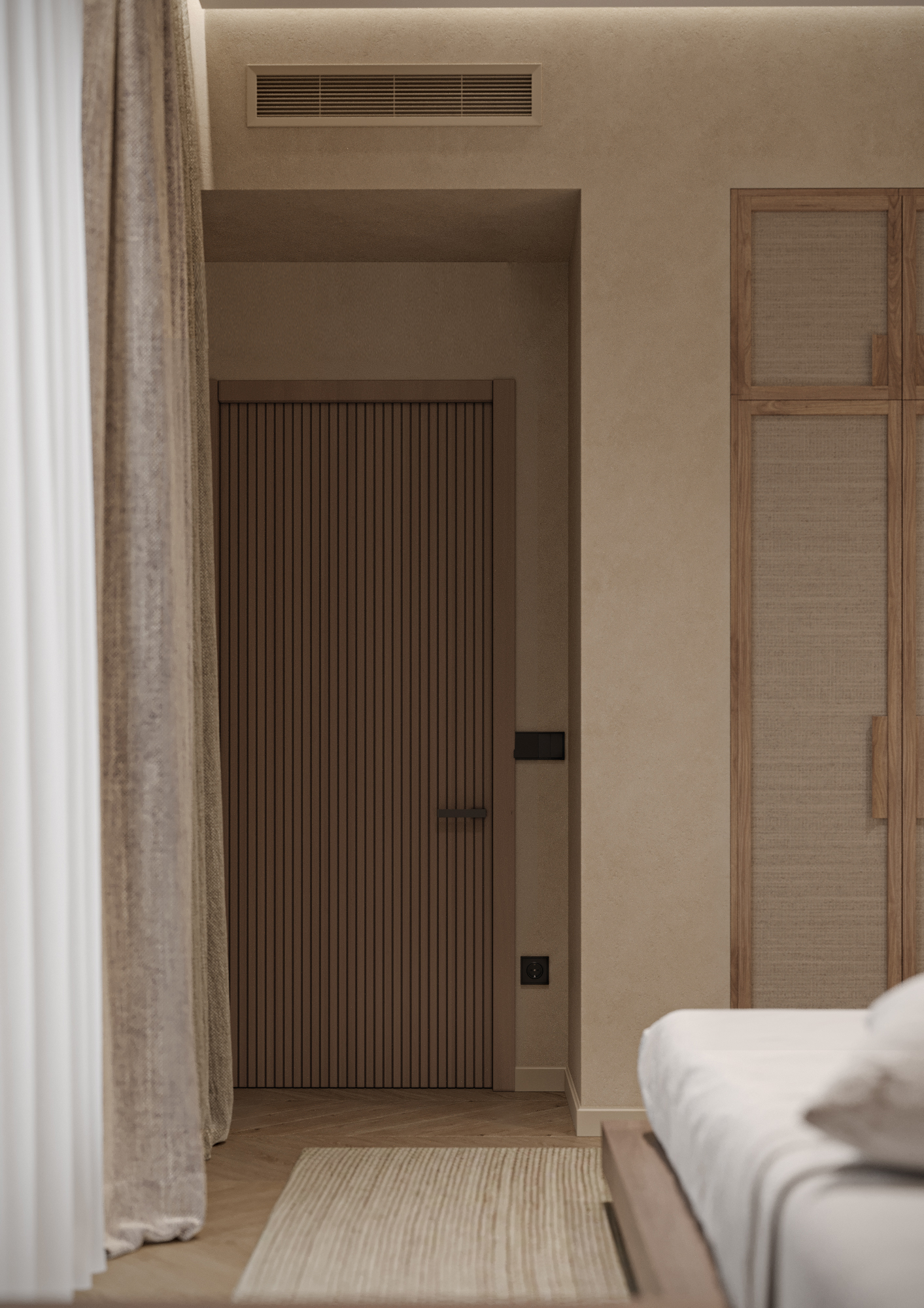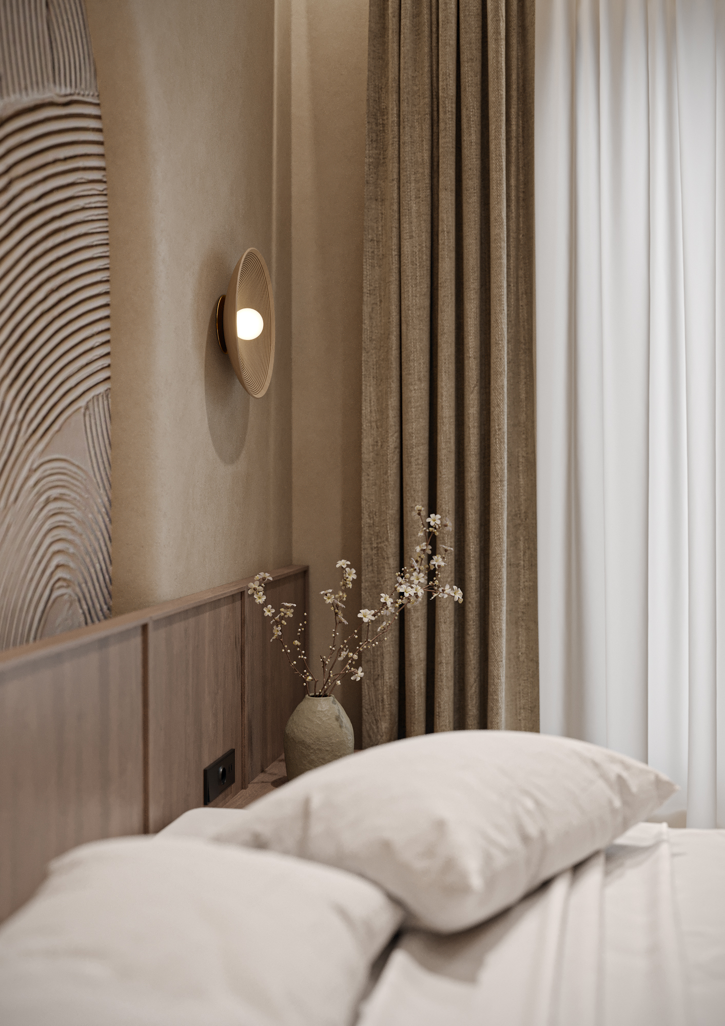 Интерьер выполнен в эстетике Japandi, где сочетаются простота японского дизайна и уют скандинавского стиля. Основная палитра — тёплые нейтральные тона: бежевый, светлое дерево и мягкие серо-кремовые оттенки.