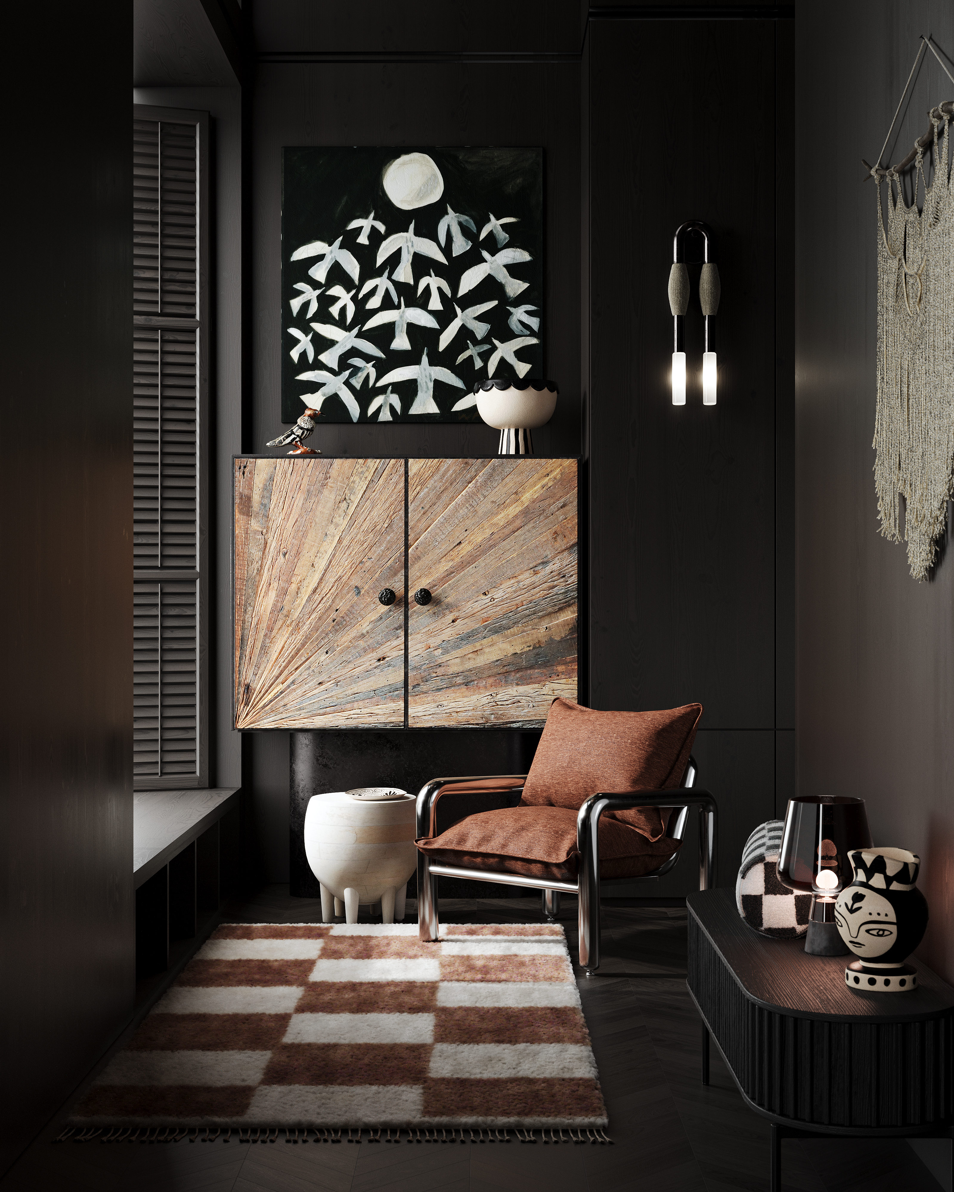 Задачей проекта было создать интерьерную визуализацию, используя в качестве референса коллаж от Demelza Krens: Референс: