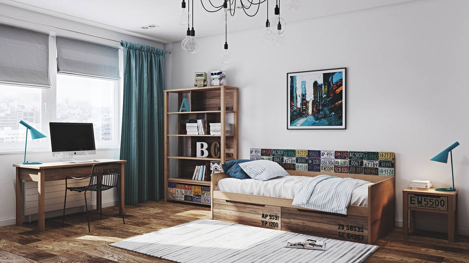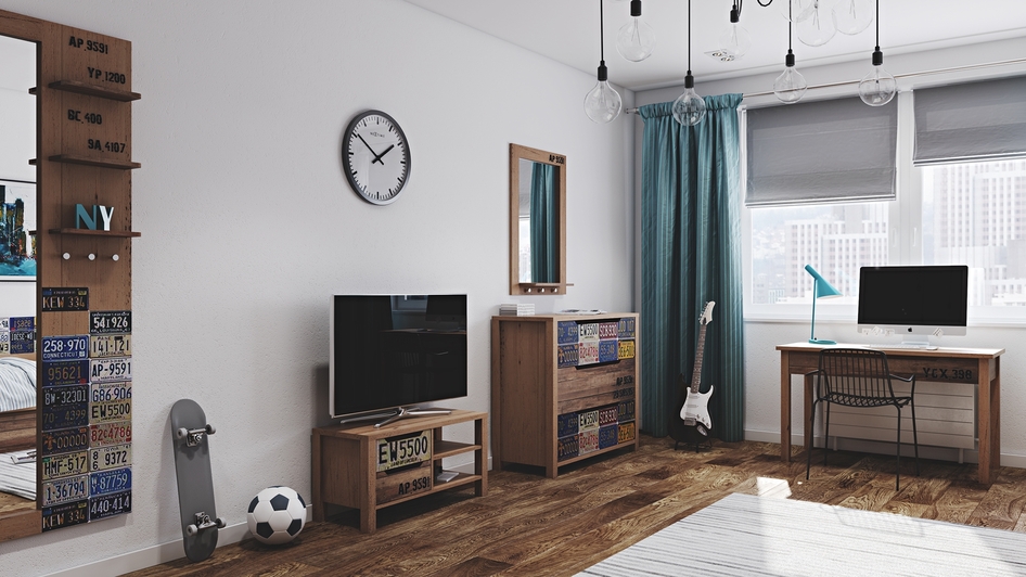 Почему вся мебель такая однообразная, это же не классика, где нужно из одного гарнитура все ставить? И зачем на всех предметах мебели эти наклейки с автономерами? Я бы оставила их только на комоде и на зеркале. Так интересная идея перестает быть интересной, если она везде и постоянно повторяется.