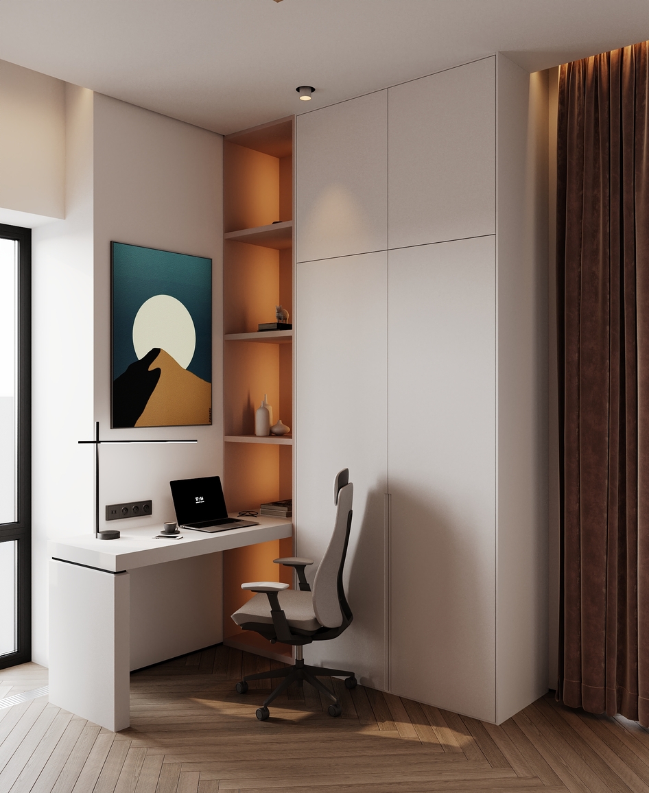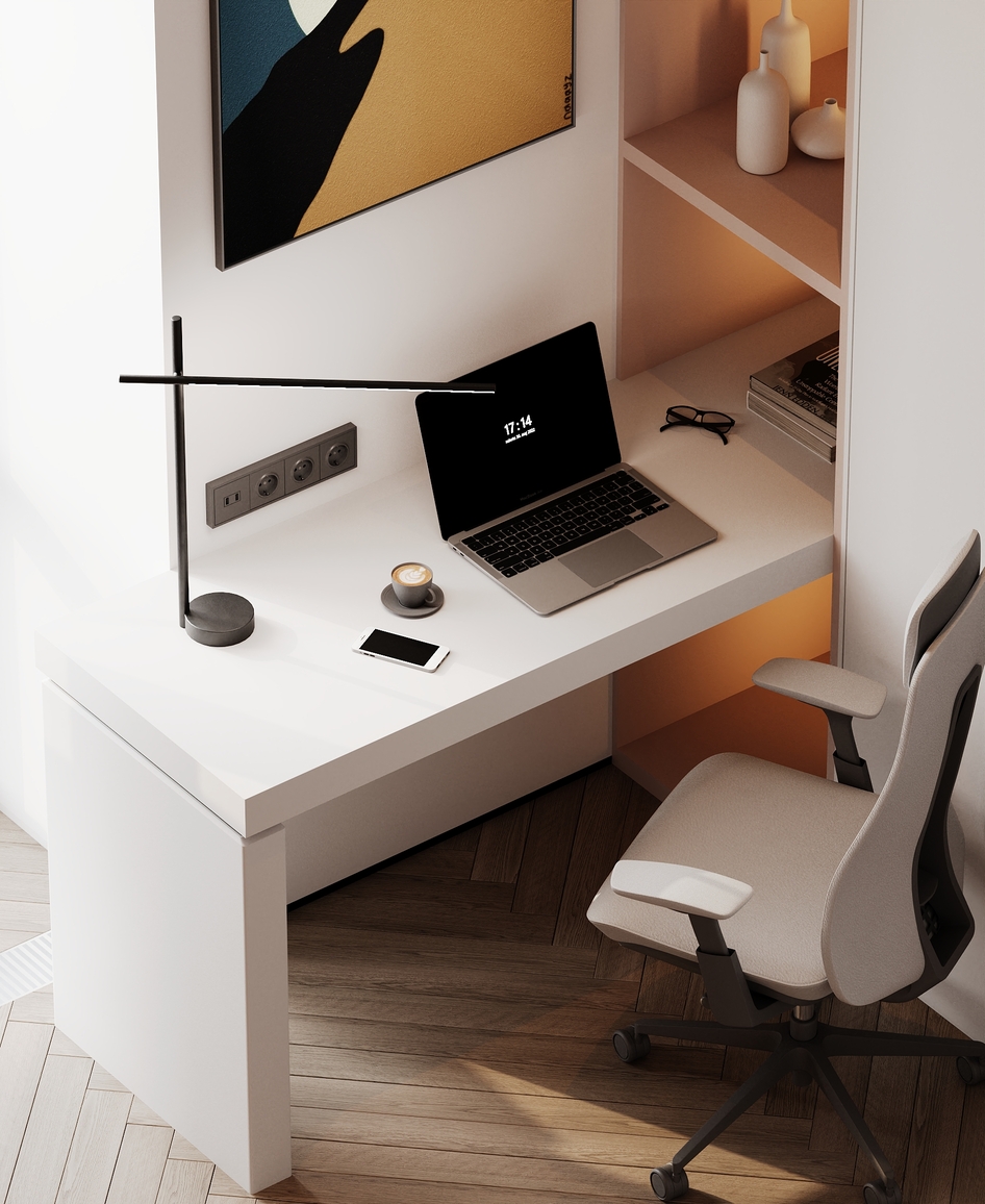 Слишком стерильно и пусто. В реальной жизни так не бывает. Кресло вообще выглядит дешево и угловато, как-будто моделировал новичок в 3D. Сцена не продумана вообще. Вот даже взять расположение ноутбука, чашки кофе и телефона. По логике, если человек правша, телефон и кофе должны стоять справа от ноутбука или хотя бы по центру ближе к краю стола. Все как-то стерильно, нет жизни в кадре.