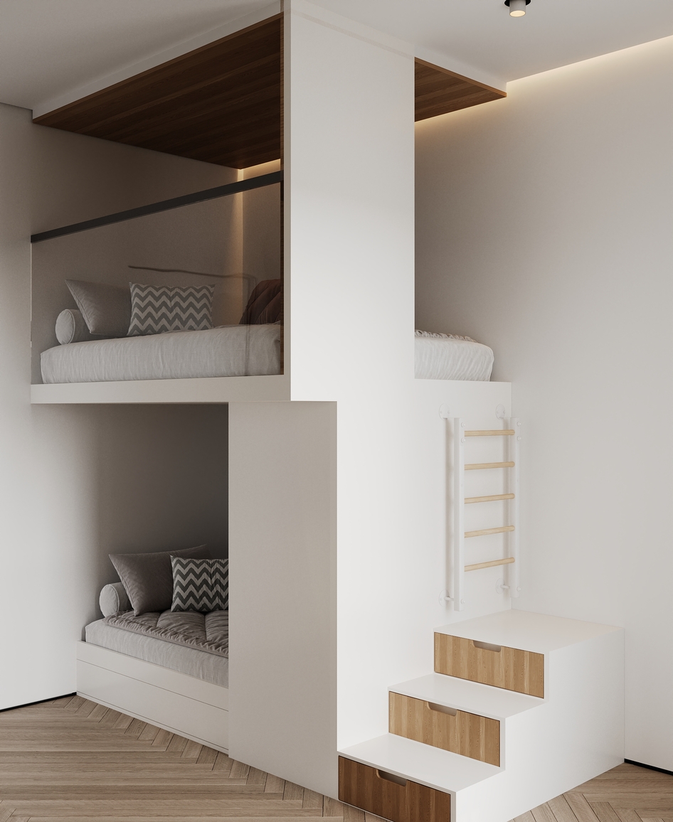 Торчащий угол слева второго яруса, на уровне головы, весело. И настенная лестница, продлить бы поручень выше, иначе не удобно залезать и слезать. А стекло ограждения второго яруса, снизу и сбоку к чему и как крепится ?