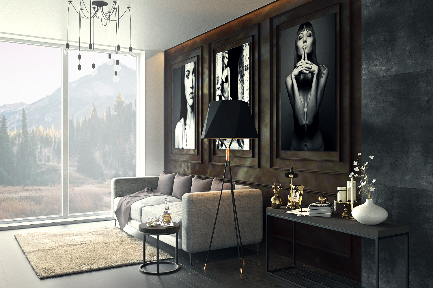 торшер поставить на другую сторону софы.Пусть освещает улицу. Переставить к центру можно когда надо будет.Люстра плачет уныло.