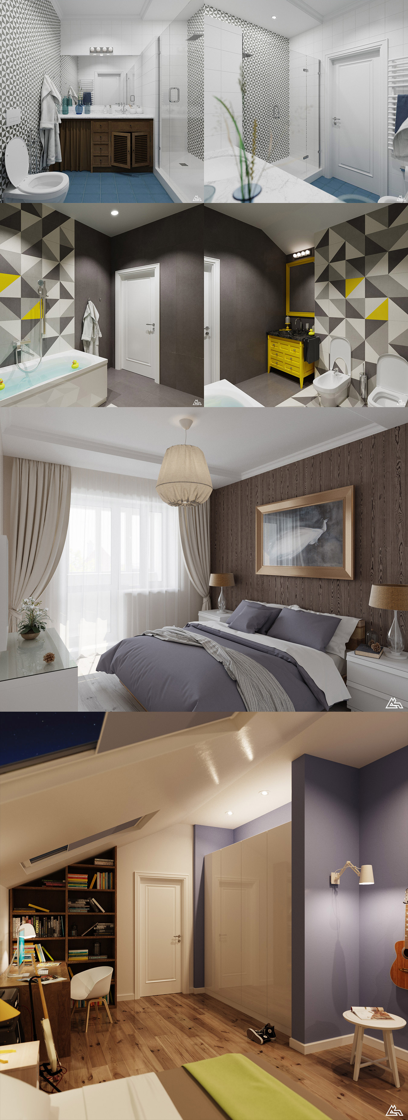 Супер! Думаю можно было бы на последнем ракурсе закрыть шкаф, сделать его встроенным, и вставить споты чуть ближе к скосу, тогда толку от освещения будет больше...