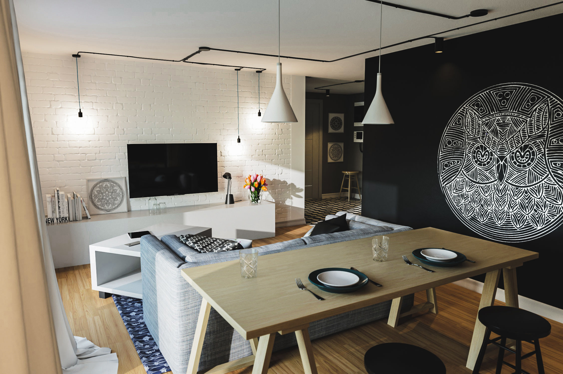 несмотря на красотень, есть пара странностей, что портят общее впечатление и выдают наигранность, а именно: двери и окна одной высоты (двери высокие?), потолок кажется низким (если двери обычные), лампа перед лицом у ноутбука, странная передняя подушка дивана, отсутствие вентиляции или вытяжки на кухне.