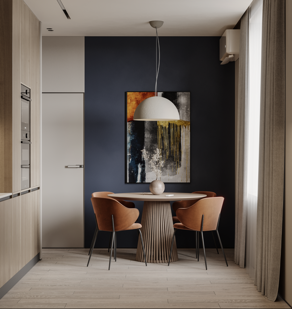 Warm wood tones, clean lines, and a bold accent wall breathe new life into the Japandi aesthetic.