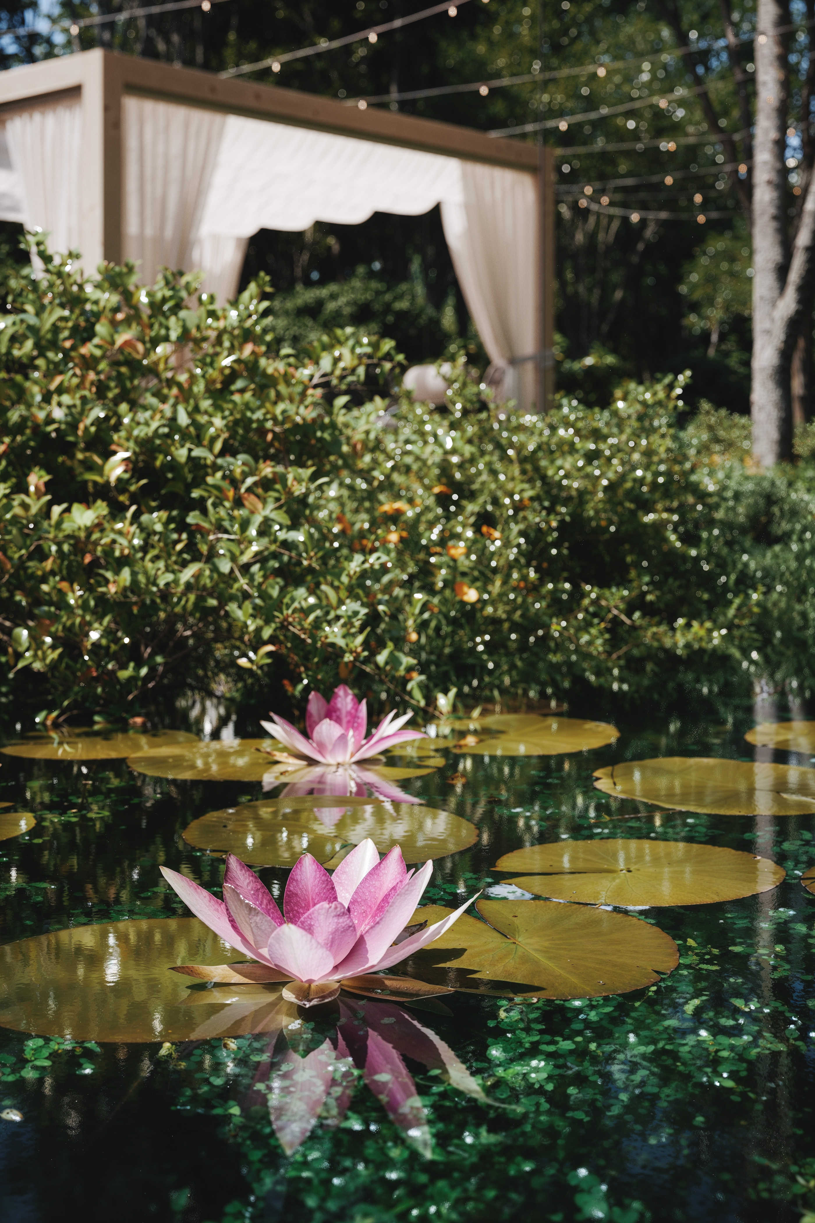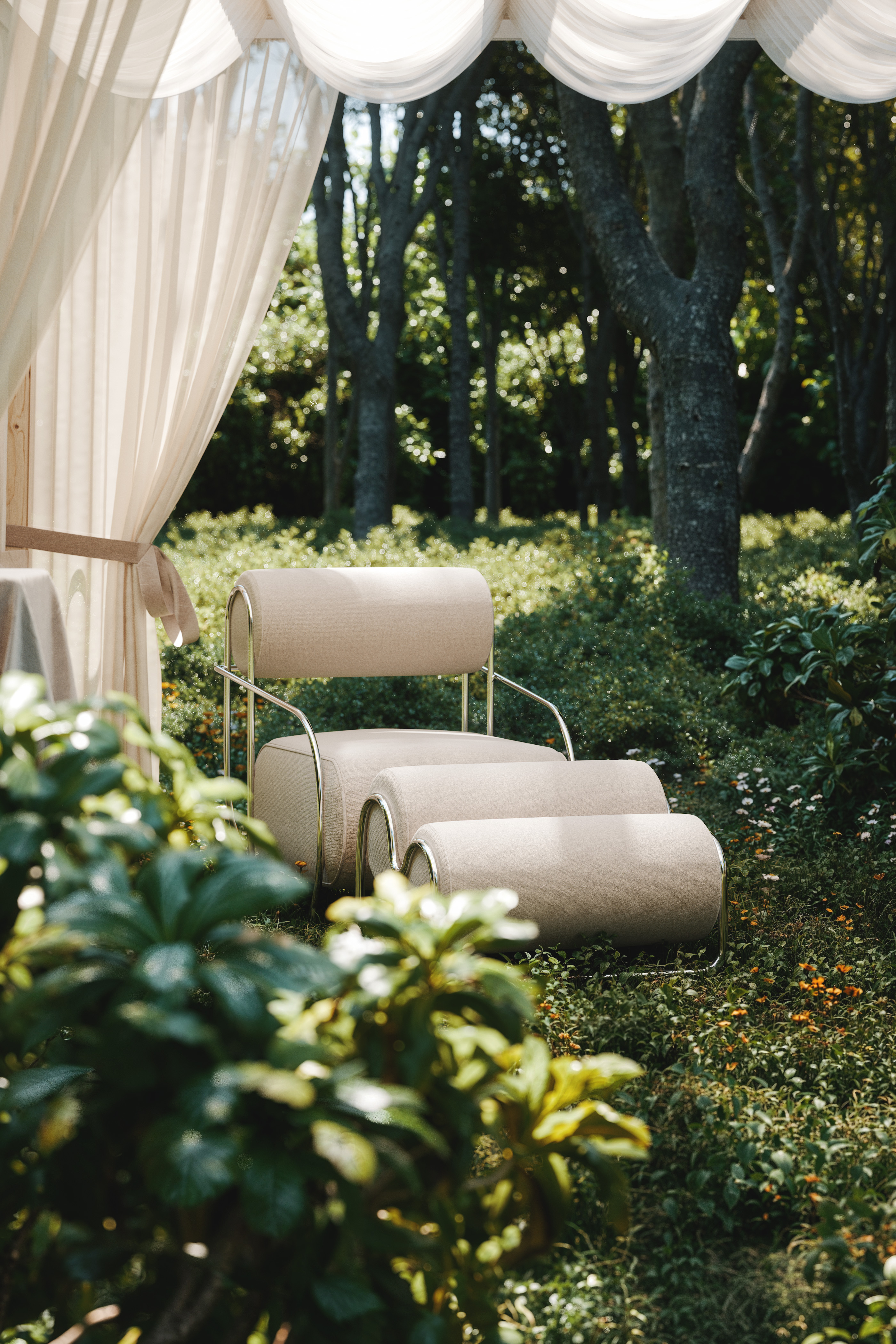 На этой чарующей фотографии изображена уютная беседка посреди сказочного леса, окутанная мягким солнечным светом, пронизывающим листву высоких деревьев. Легкие полупрозрачные занавеси нежно колышутся на ветру, создавая атмосферу уединения и покоя. Внутри беседки — изысканные светлые кресла округлой формы, словно приглашение к отдыху и созерцанию. Вокруг буйствует живая природа: зелень, дикие цветы, пруд и спокойствие леса, которое словно замедляет время. Это место кажется идеальным для медитации, тихого разговора или вдохновения — уголок гармонии, спрятанный в самом сердце природы.