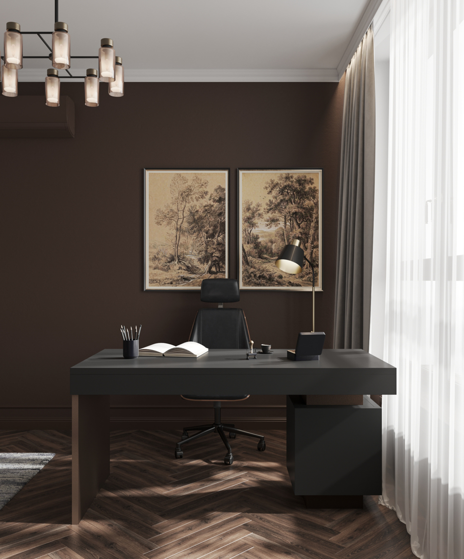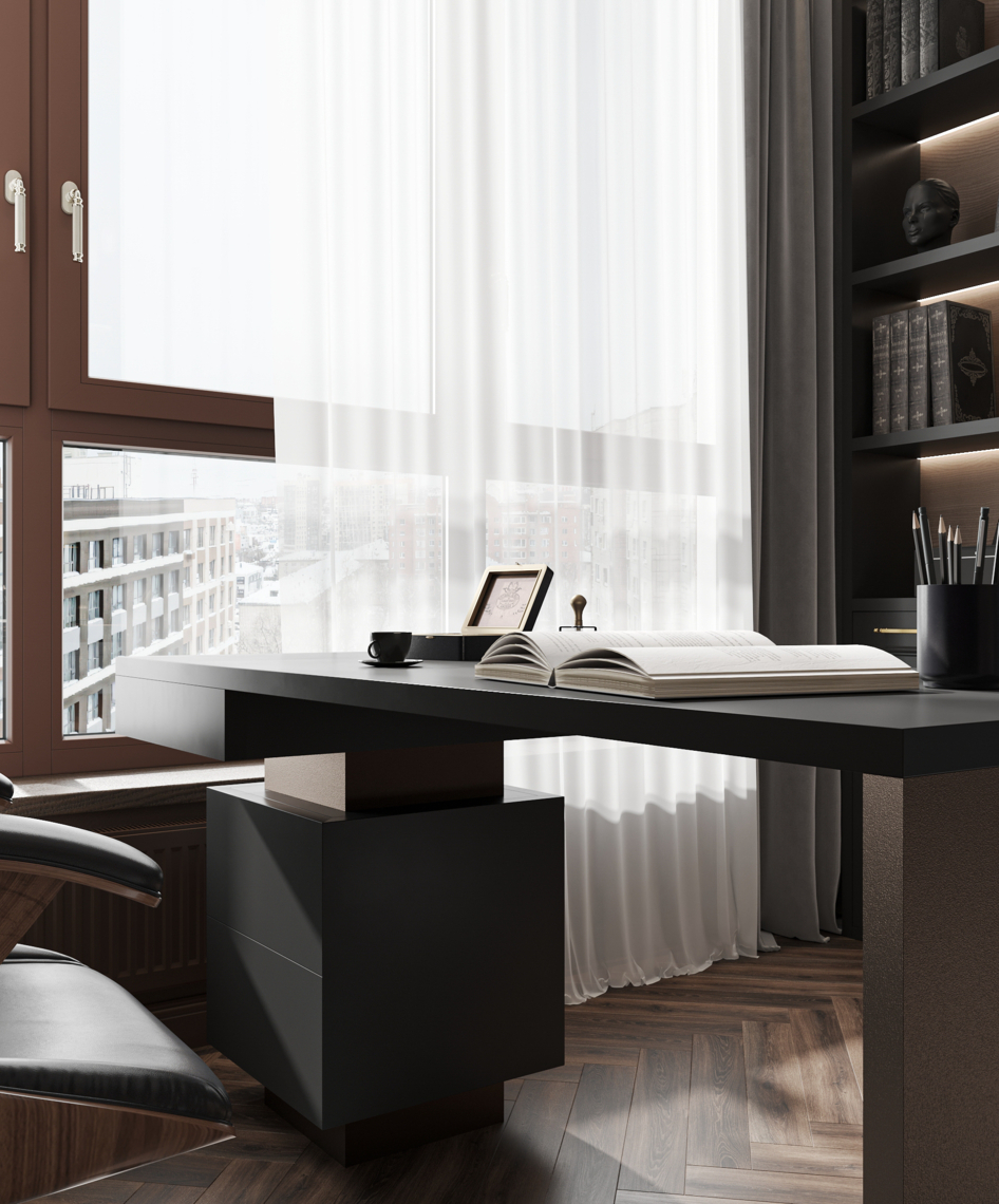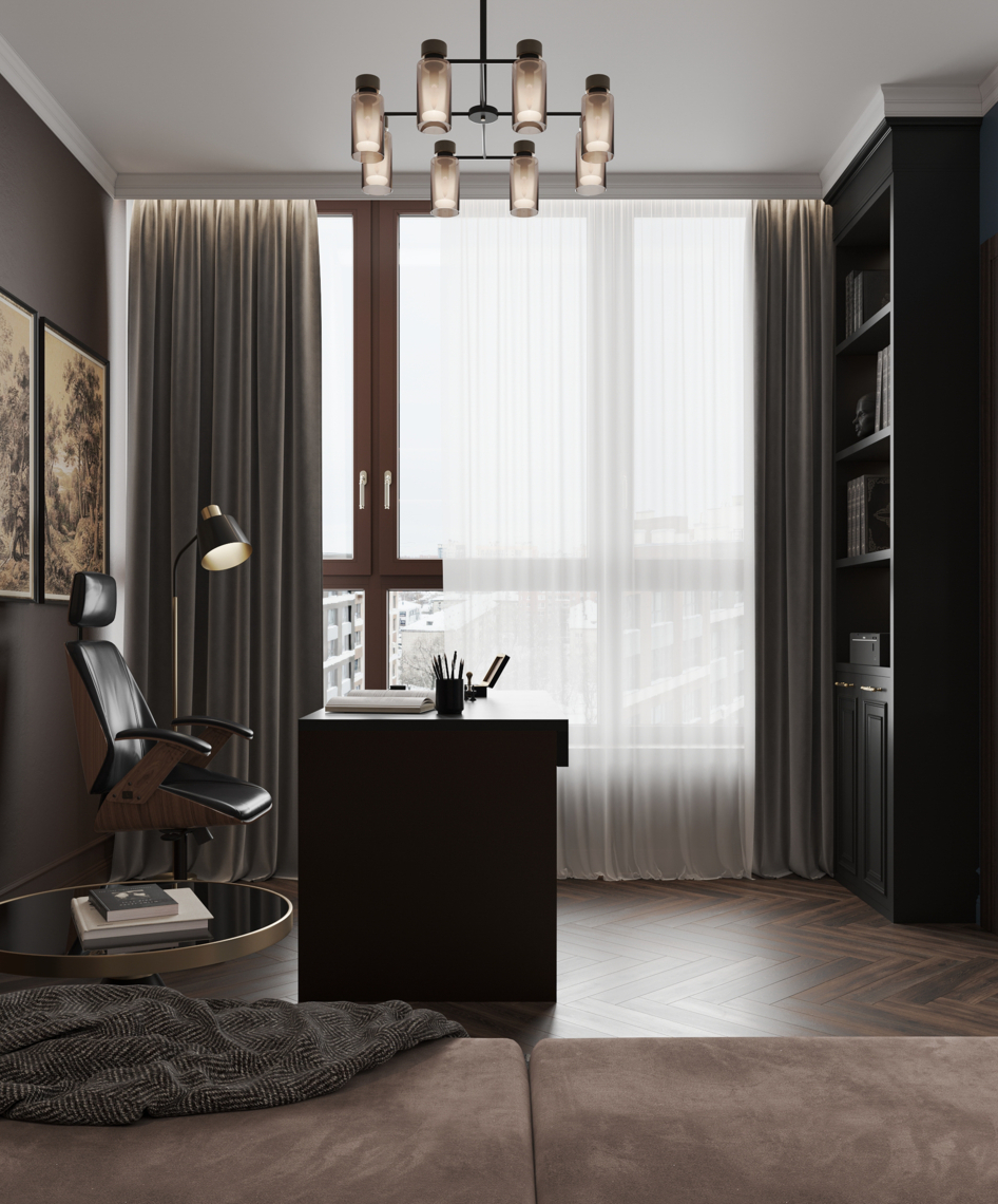 Вся квартира выполнена в шоколадных тонах. В том числе кабинет и спальня https://3ddd.ru/galleries/gallery/shokoladnye-sny.