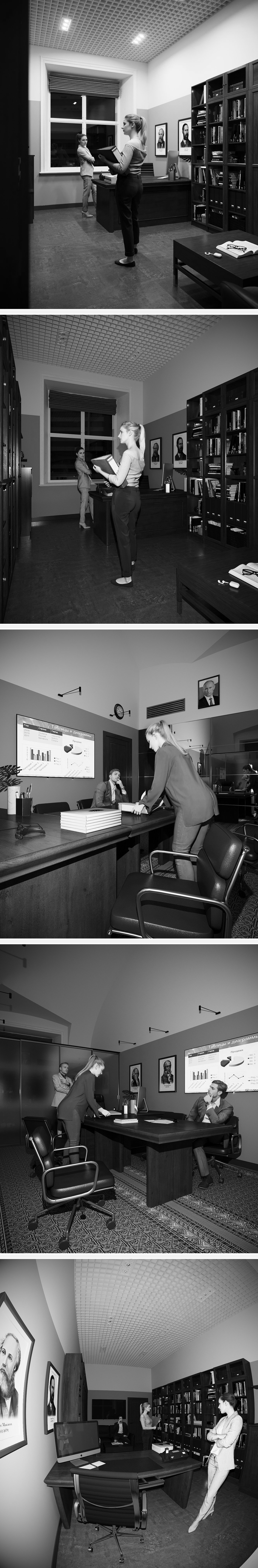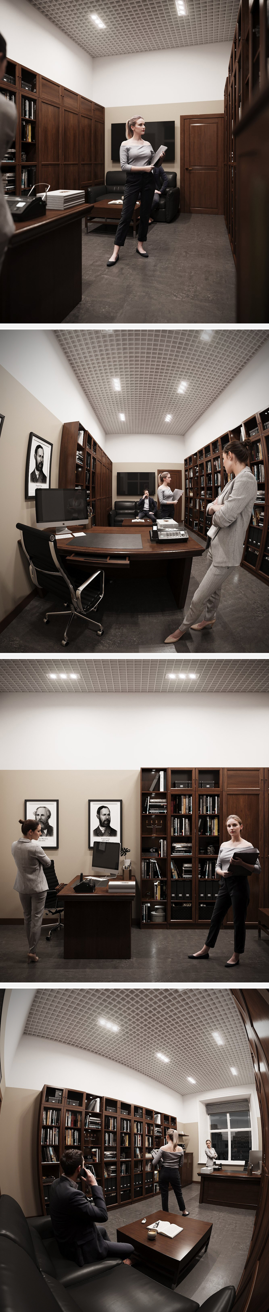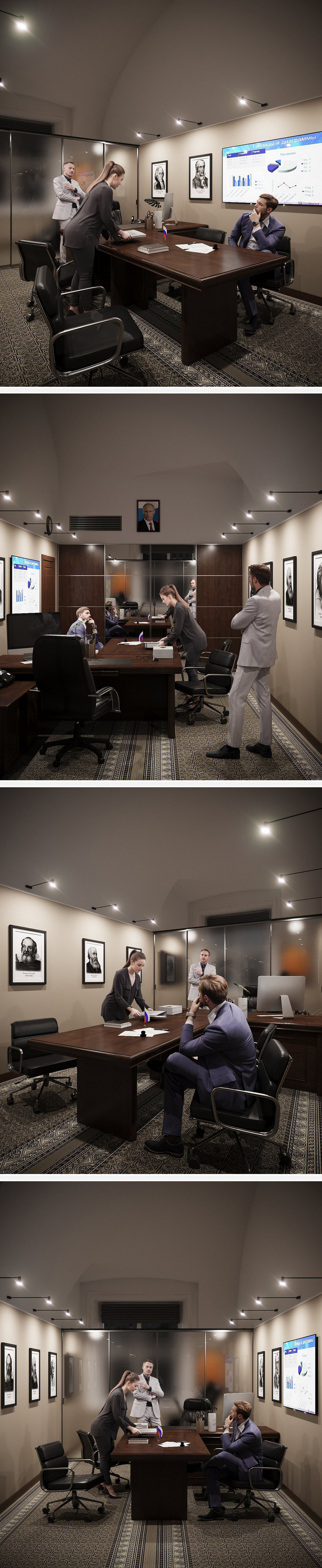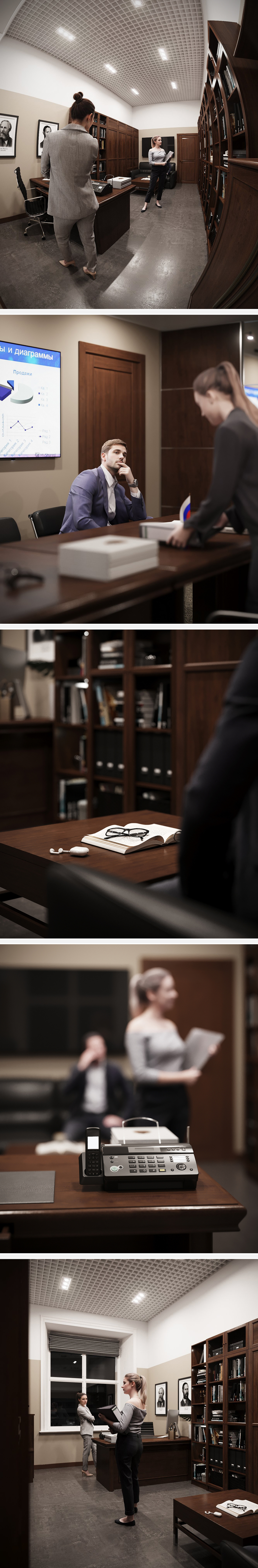 Чот как то крепово получилось с людьми,честно, смотрятся дурацко, эти двое на секретаршу откровенно пялятся, да и в целом когда все застыли одинаково а ракурсы разные - ну прям совсем плохо, на мой вкус, в этом плане лучше в каждом кабинете делать по одному кадру с людьми а дальше просто кабинет показывать. К кабинету и визу вопросов нет, повтор всех кадров в ч/б - тоже перебор. Ник - со всем уважением к твоим скиллам.