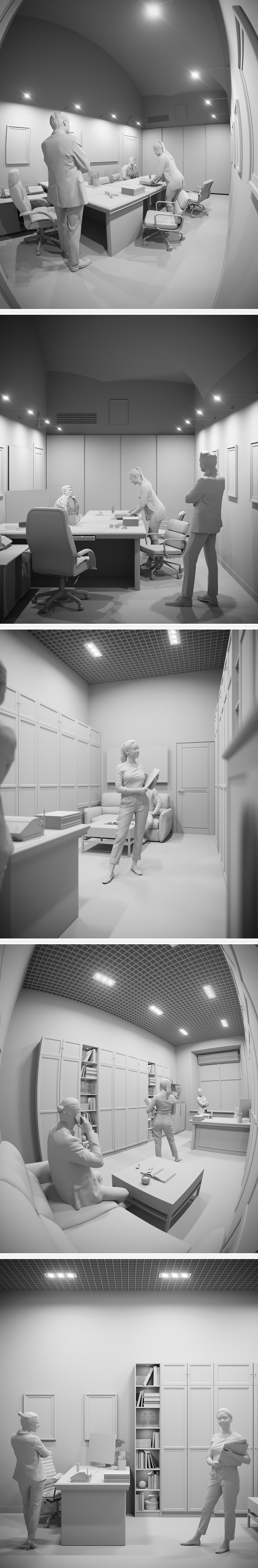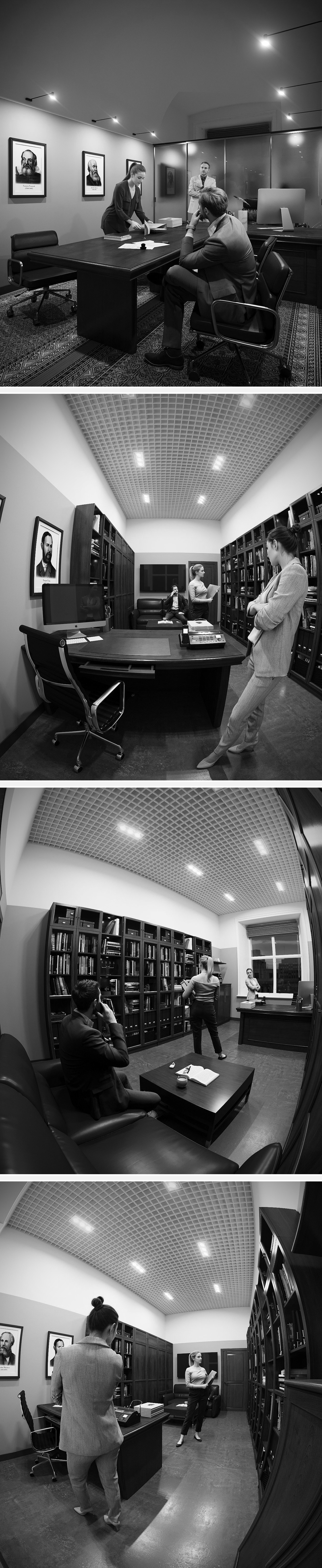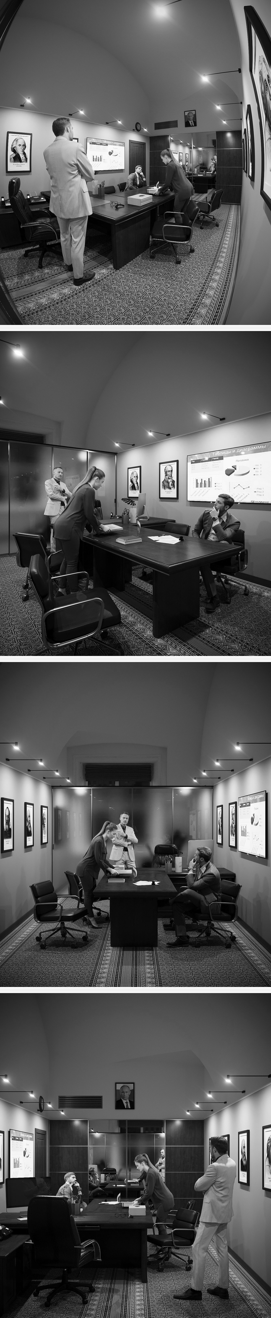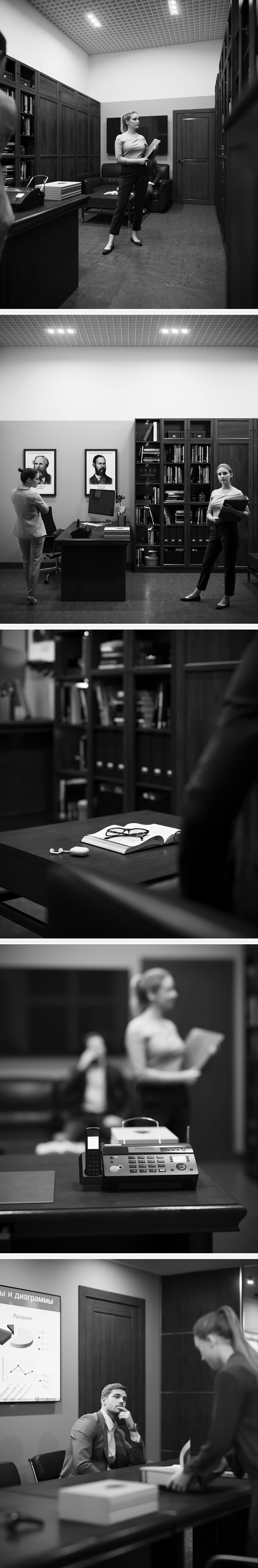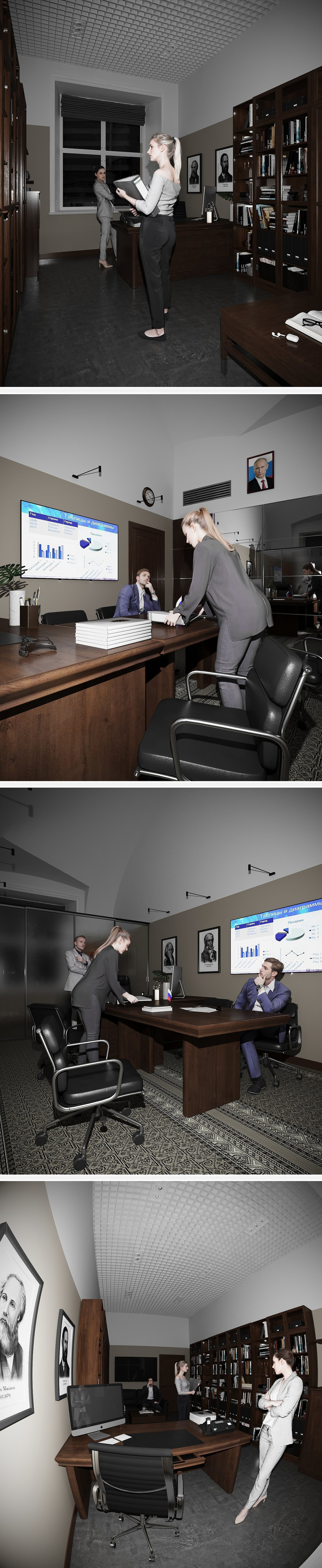 Чот как то крепово получилось с людьми,честно, смотрятся дурацко, эти двое на секретаршу откровенно пялятся, да и в целом когда все застыли одинаково а ракурсы разные - ну прям совсем плохо, на мой вкус, в этом плане лучше в каждом кабинете делать по одному кадру с людьми а дальше просто кабинет показывать. К кабинету и визу вопросов нет, повтор всех кадров в ч/б - тоже перебор. Ник - со всем уважением к твоим скиллам.
