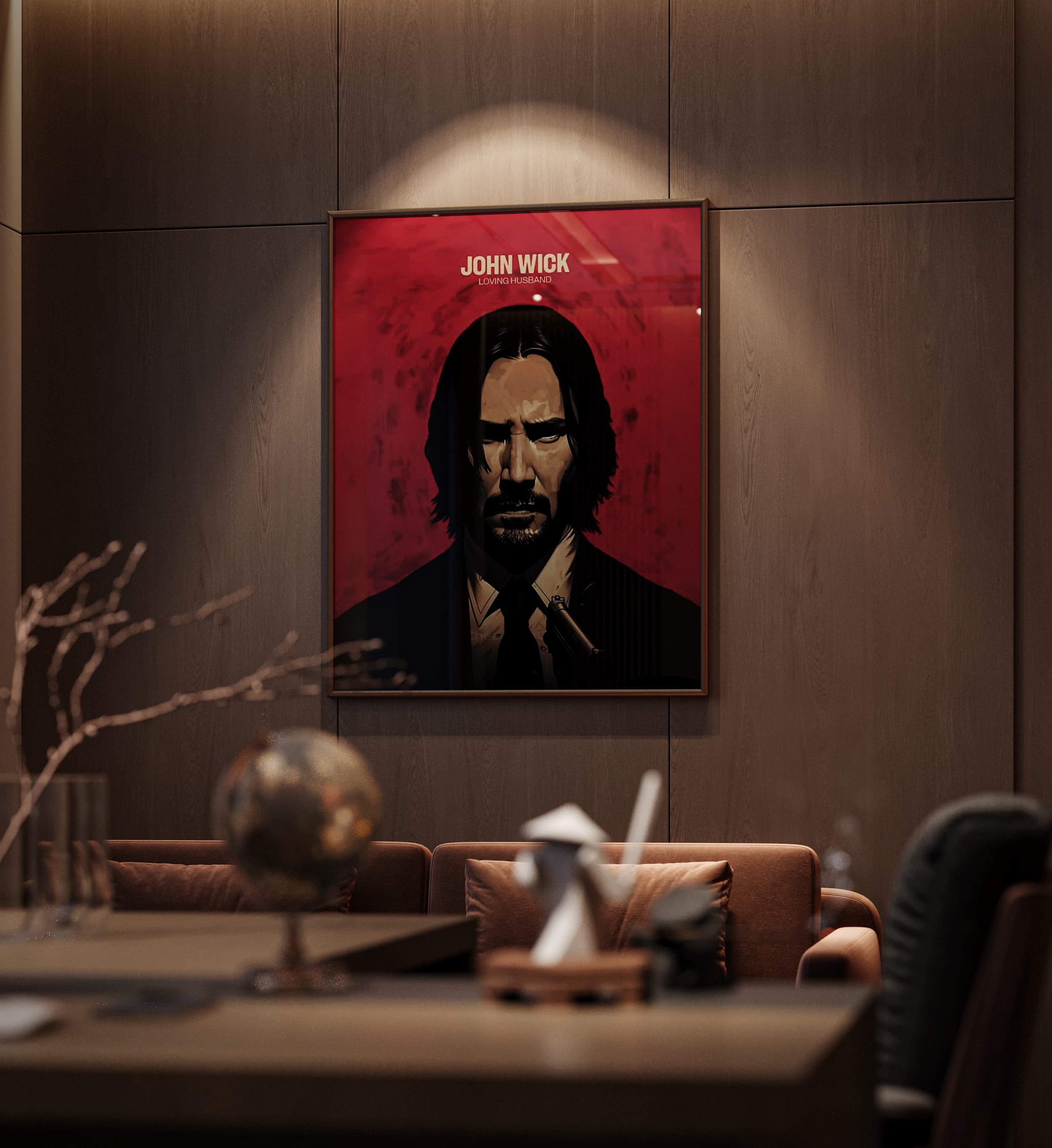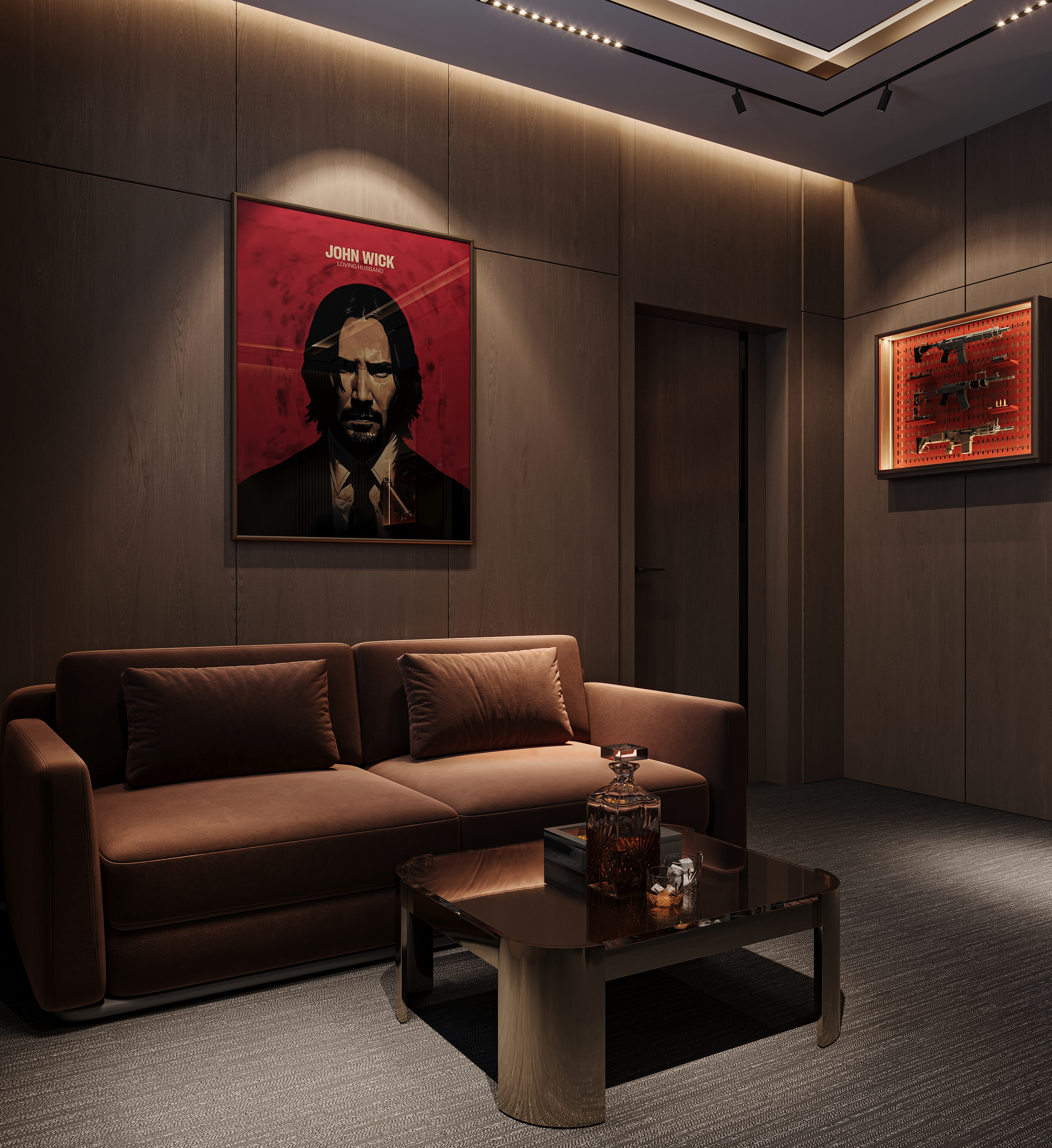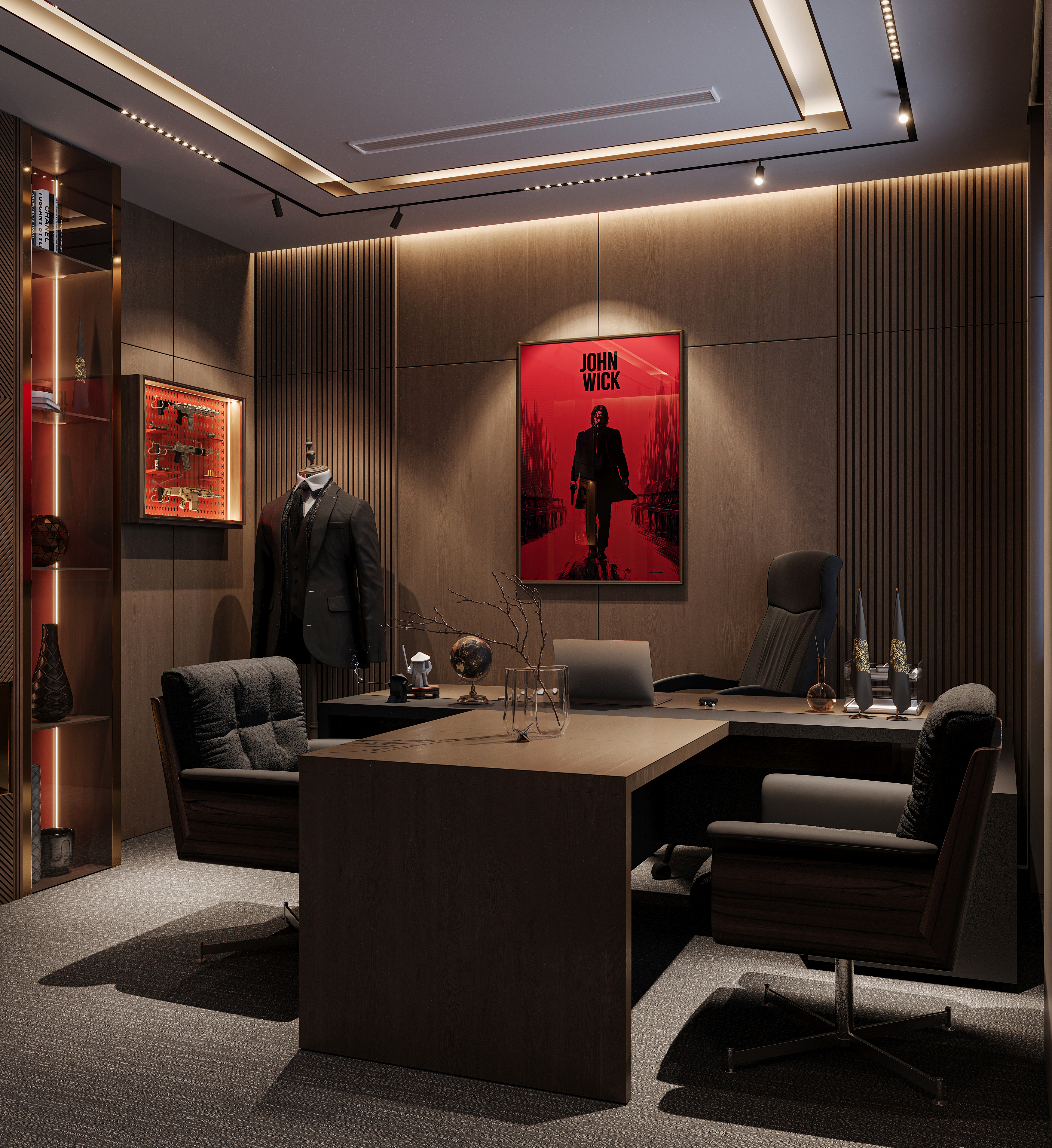 Современный кабинет в стиле «John Wick»: строгие линии, тёплые деревянные панели и акцентная подсветка создают атмосферу элегантности и силы. Каждый элемент интерьера отсылает к культовому фильму: постер с образом Джона Уика подчёркивает драматичность пространства, коллекция оружия на стене напоминает о его легендарном арсенале, а манекен с безупречным костюмом — о фирменном стиле главного героя. Детали подобраны так, чтобы создать пространство, в котором ощущается дух Джона Уика — несокрушимая сила, абсолютный контроль и внутренняя мощь.