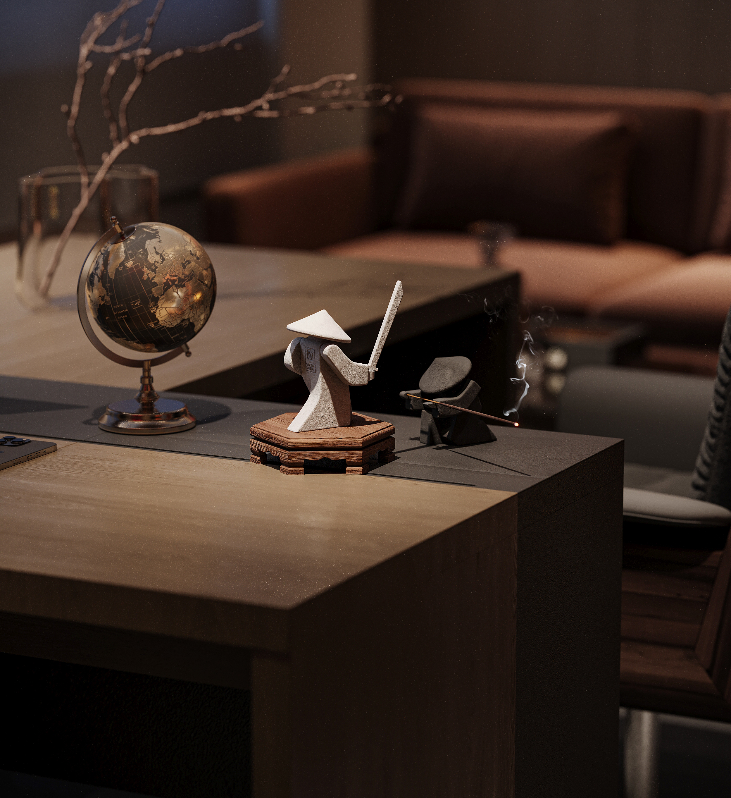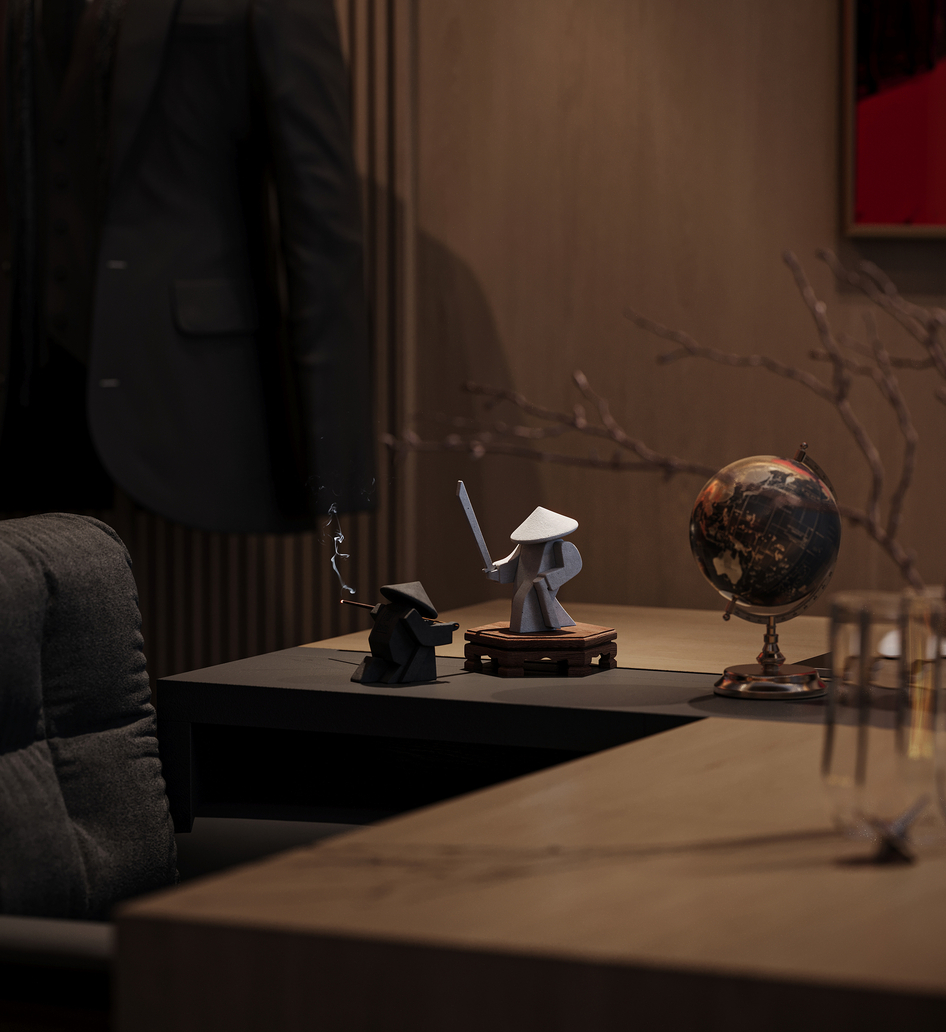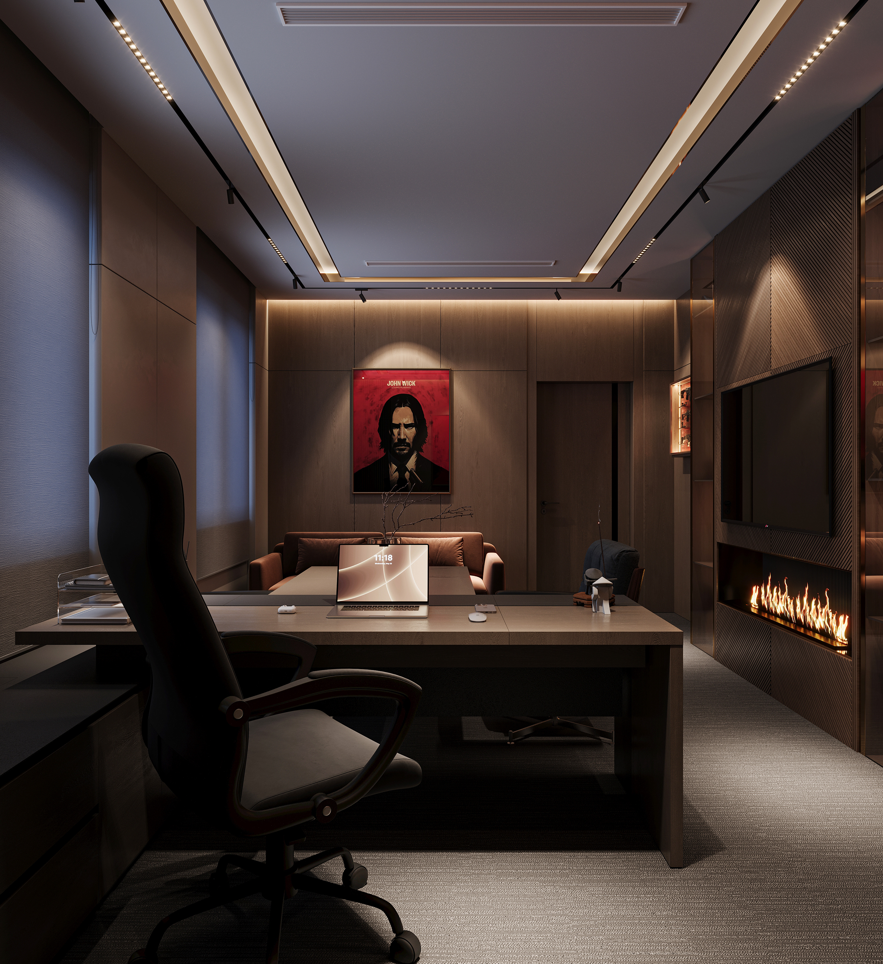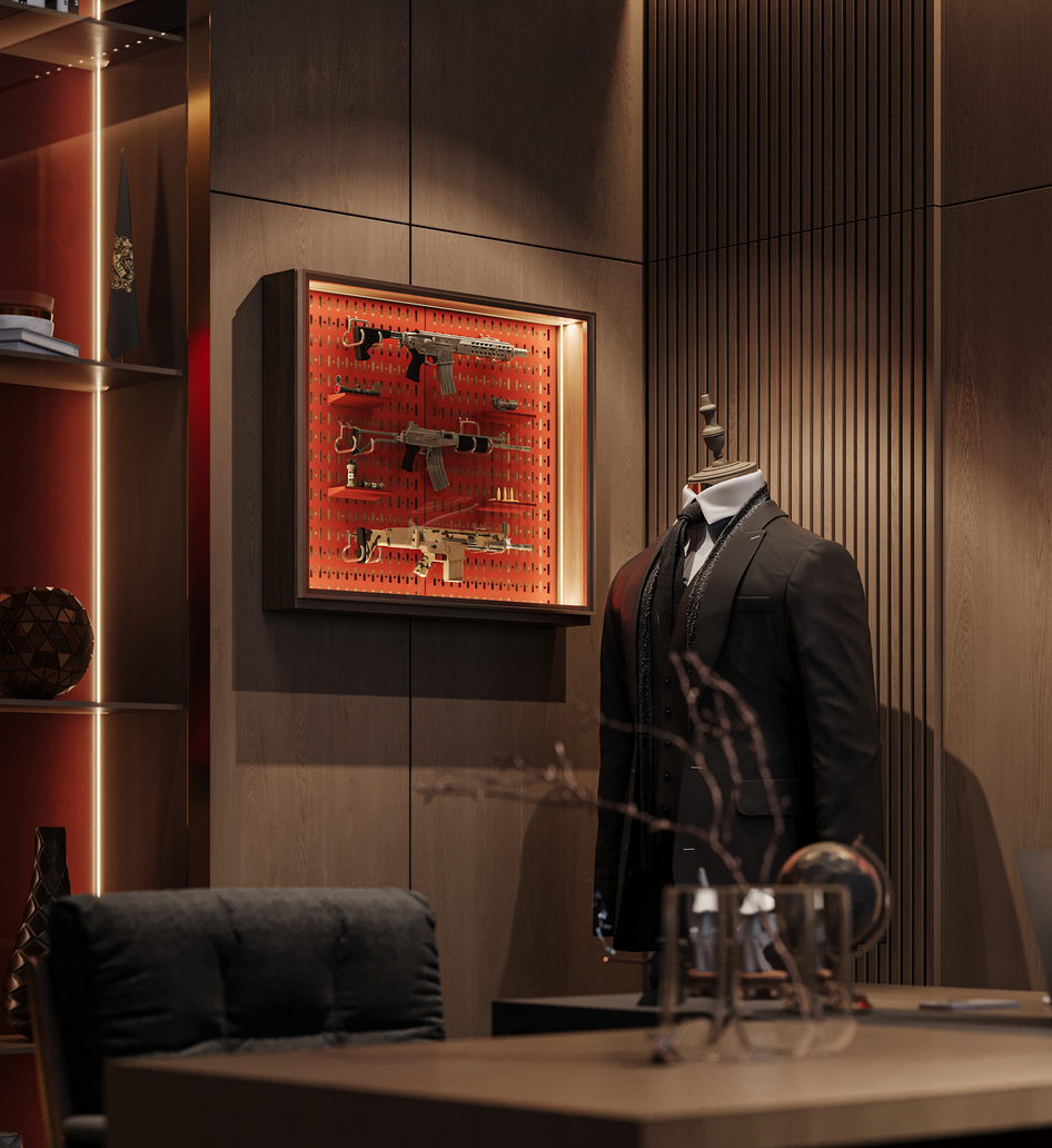Современный кабинет в стиле «John Wick»: строгие линии, тёплые деревянные панели и акцентная подсветка создают атмосферу элегантности и силы. Каждый элемент интерьера отсылает к культовому фильму: постер с образом Джона Уика подчёркивает драматичность пространства, коллекция оружия на стене напоминает о его легендарном арсенале, а манекен с безупречным костюмом — о фирменном стиле главного героя. Детали подобраны так, чтобы создать пространство, в котором ощущается дух Джона Уика — несокрушимая сила, абсолютный контроль и внутренняя мощь.