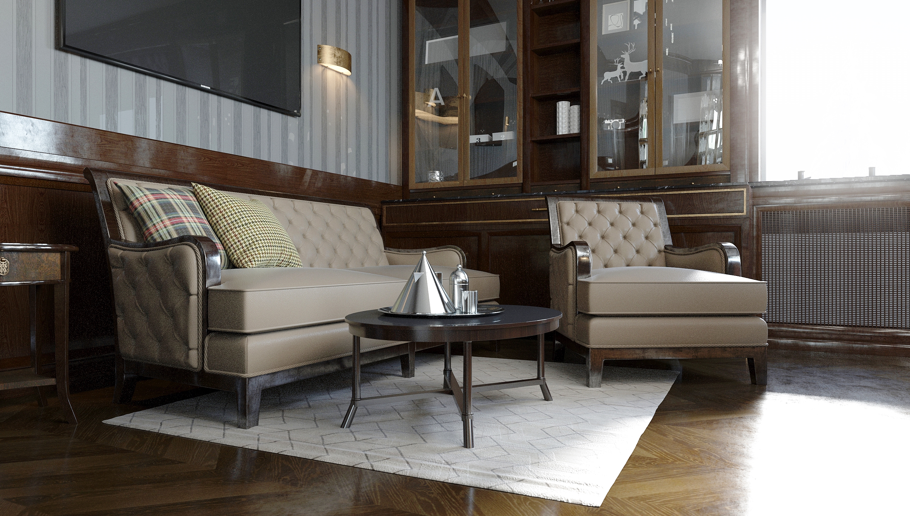 Интерьер Неспокойные 50-е в Америке. Мне нравится в целом. Вот только нужно было родной мат оставить на диване и кресле. А то этот очень бедно смотрится. +5