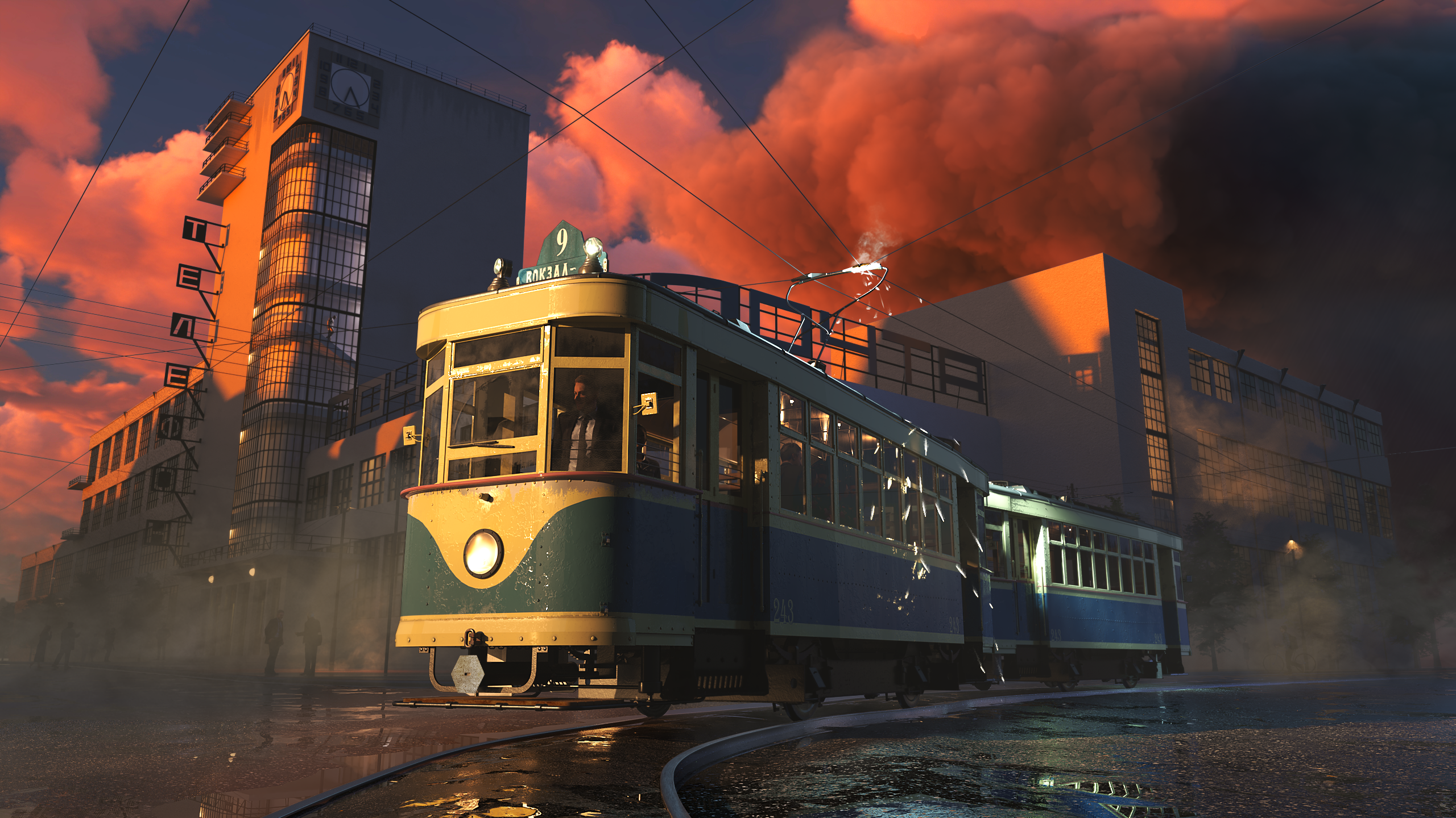 A 3D visualization of a Soviet tram, recreated with meticulous attention to period detail. The model was created in 3ds Max using Corona Renderer to achieve photorealistic lighting and materials. The work emphasizes the atmosphere of the Soviet urban environment—the old rolling stock, worn surfaces, and characteristic details of the tram's exterior.