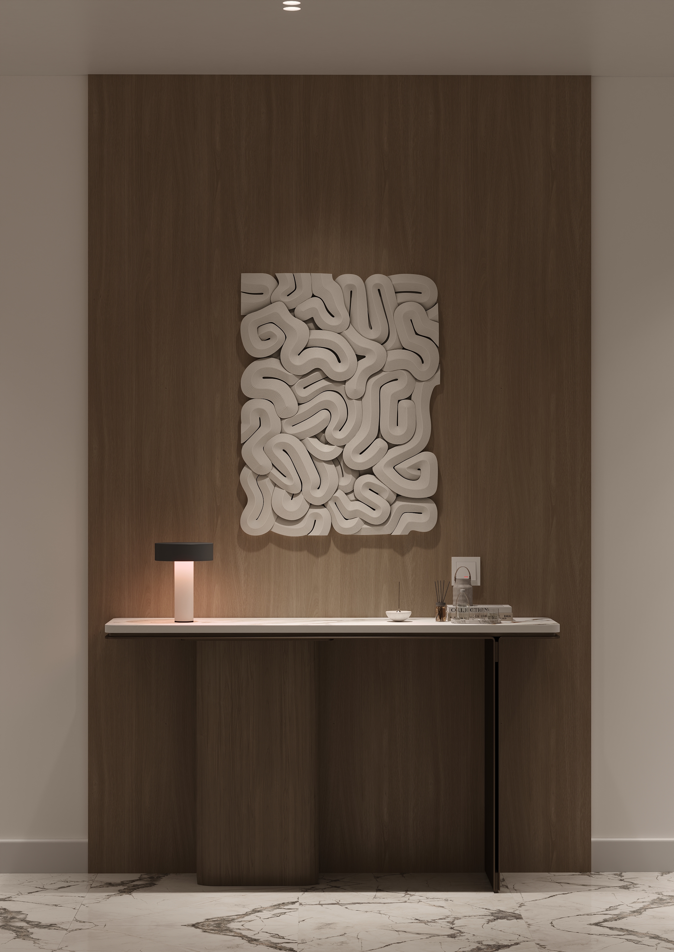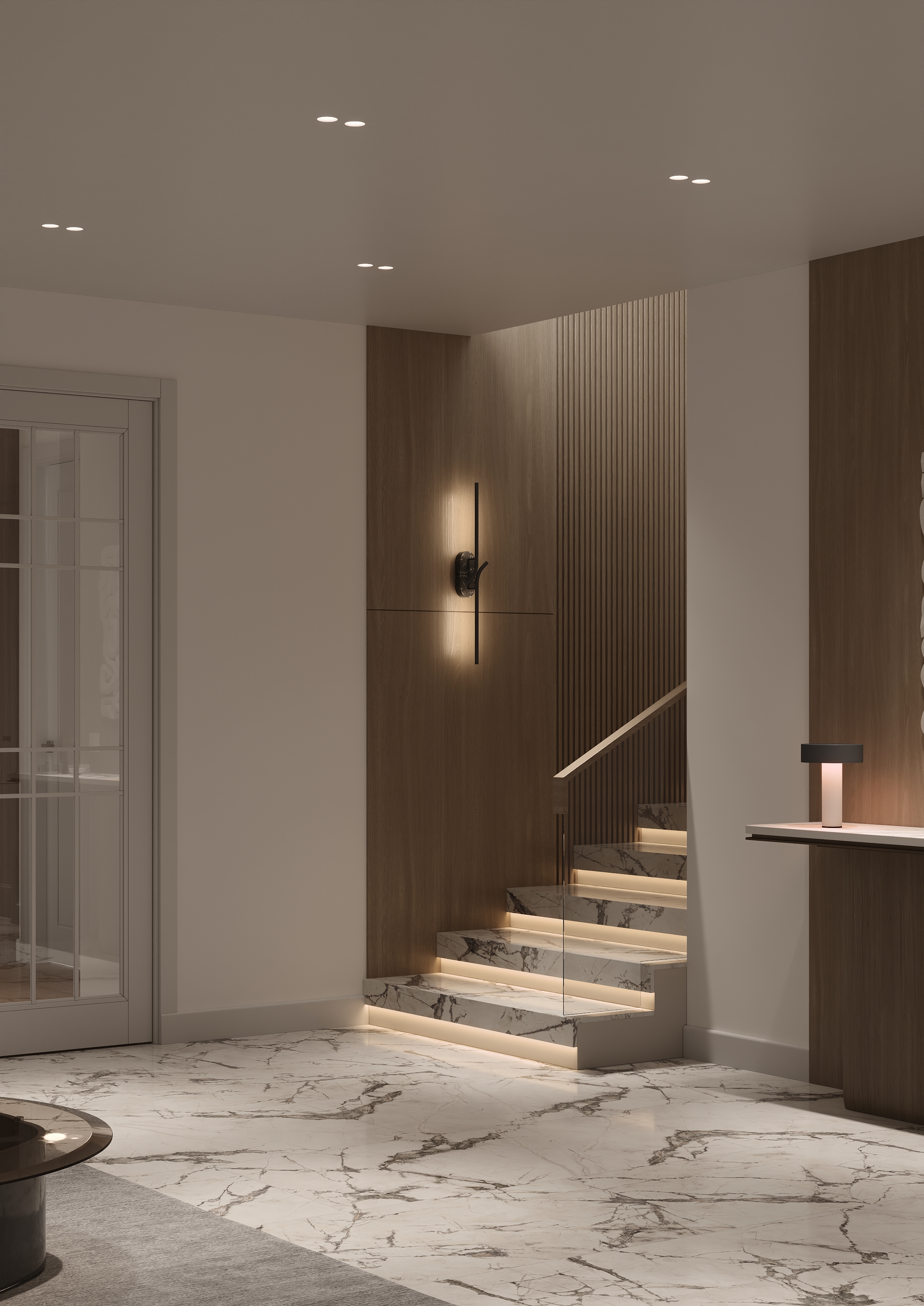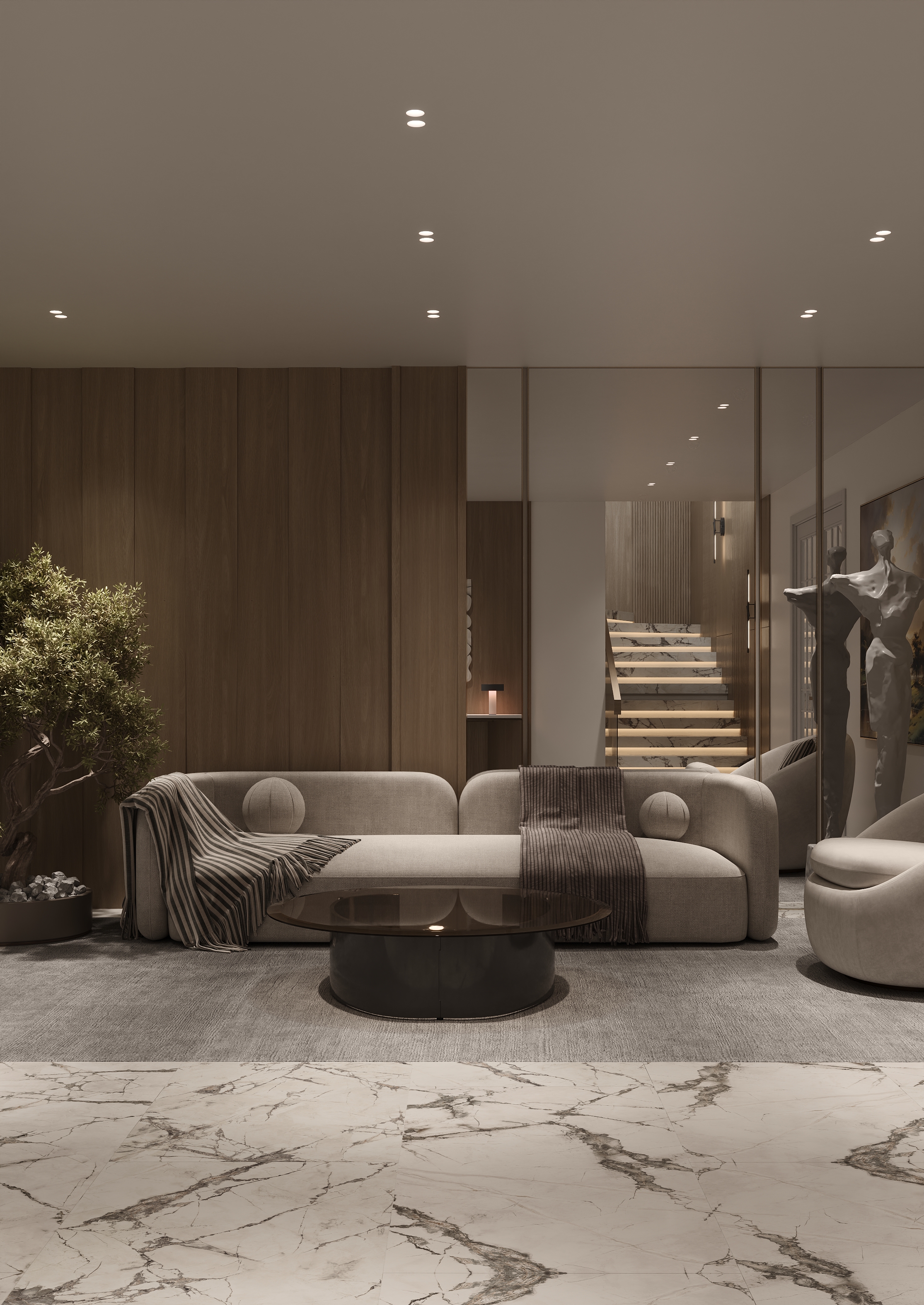Цель — показать гармонию минимализма и уюта в подземном холле, который стал полноценной частью дома, а не просто техническим помещением.
